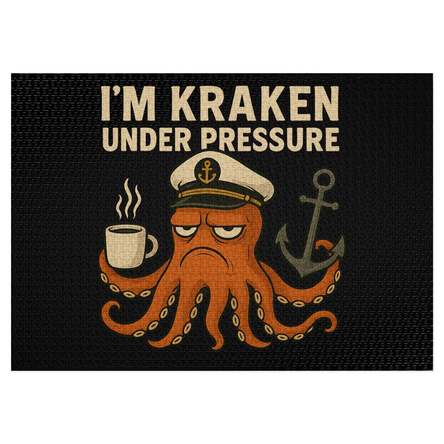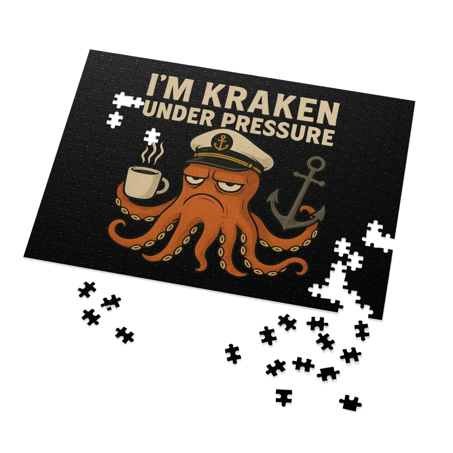 This vibrant jigsaw puzzle features a stressed Octopus with the humorous phrase 'I'm Kraken Under Pressure'. Perfect for those who enjoy a challenge and love sea-themed designs. Ideal for gifting during birthdays, holidays, or as a fun activity to enjoy with family and friends.