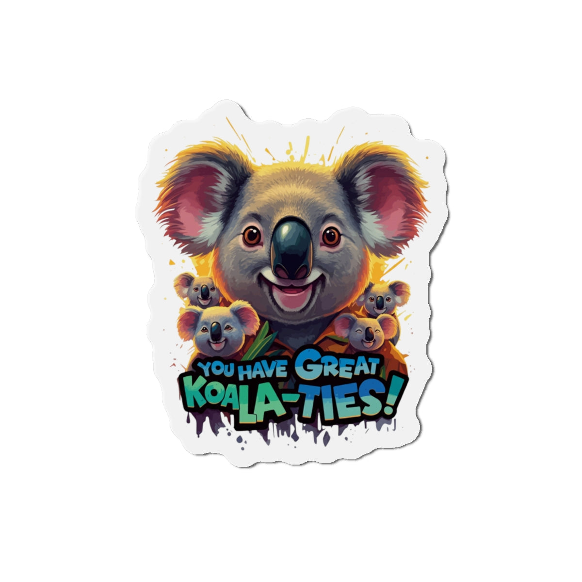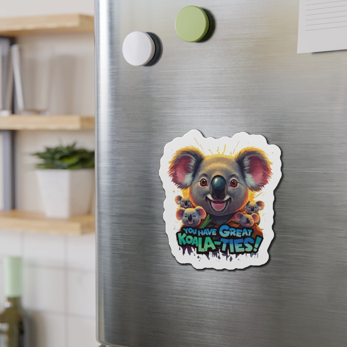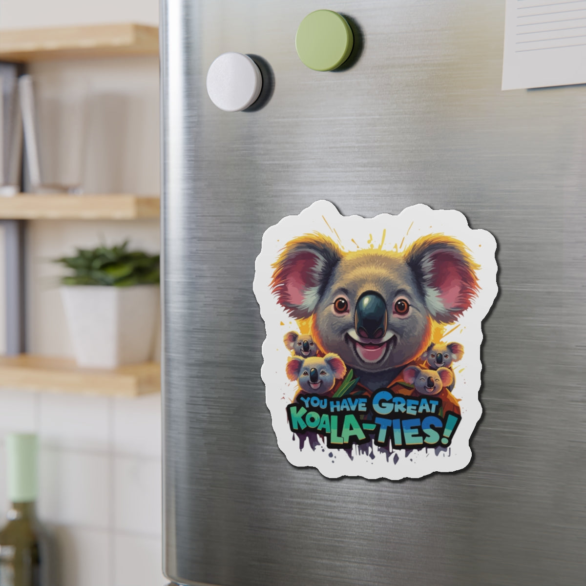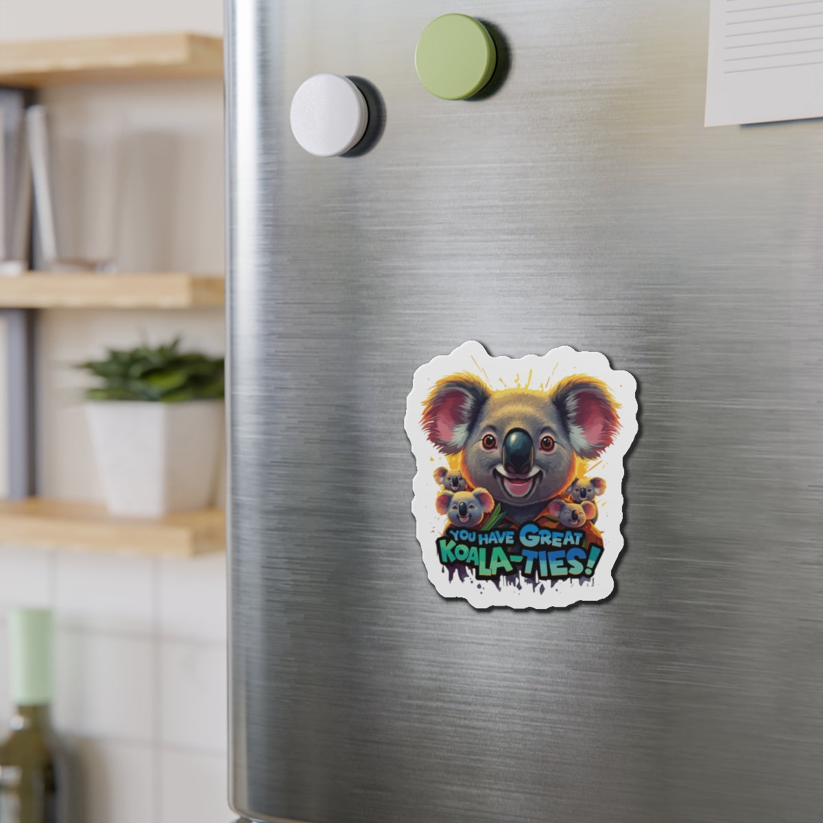 A fun magnet featuring Koala characters with the phrase 'You Have Great Koala-ties'. This magnet adds a touch of cuteness to any magnetic surface and makes a great gift for animal lovers or those who appreciate puns. Perfect for decorating refrigerators, lockers, or magnetic whiteboards. Ideal for those looking to add a bit of whimsy to their space.