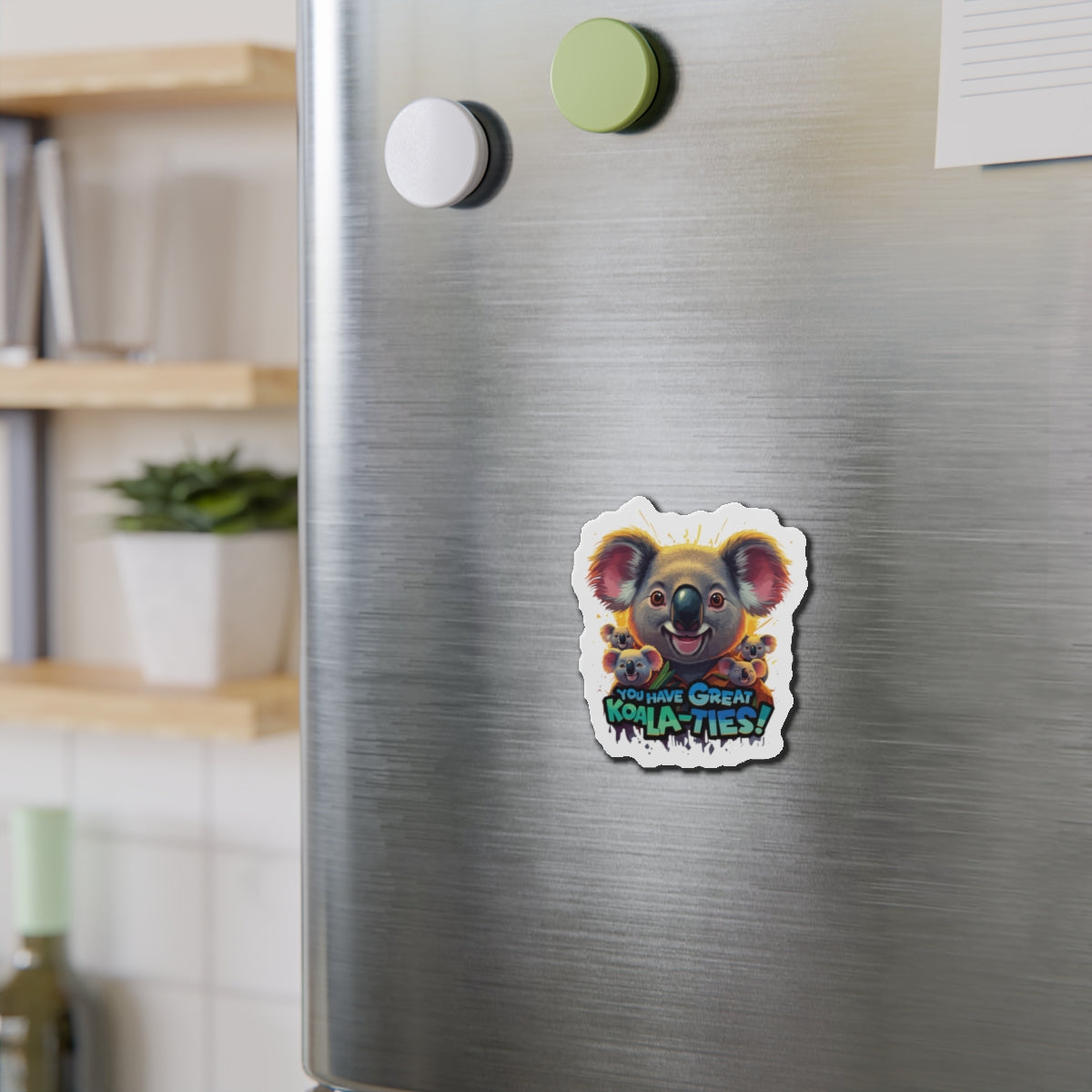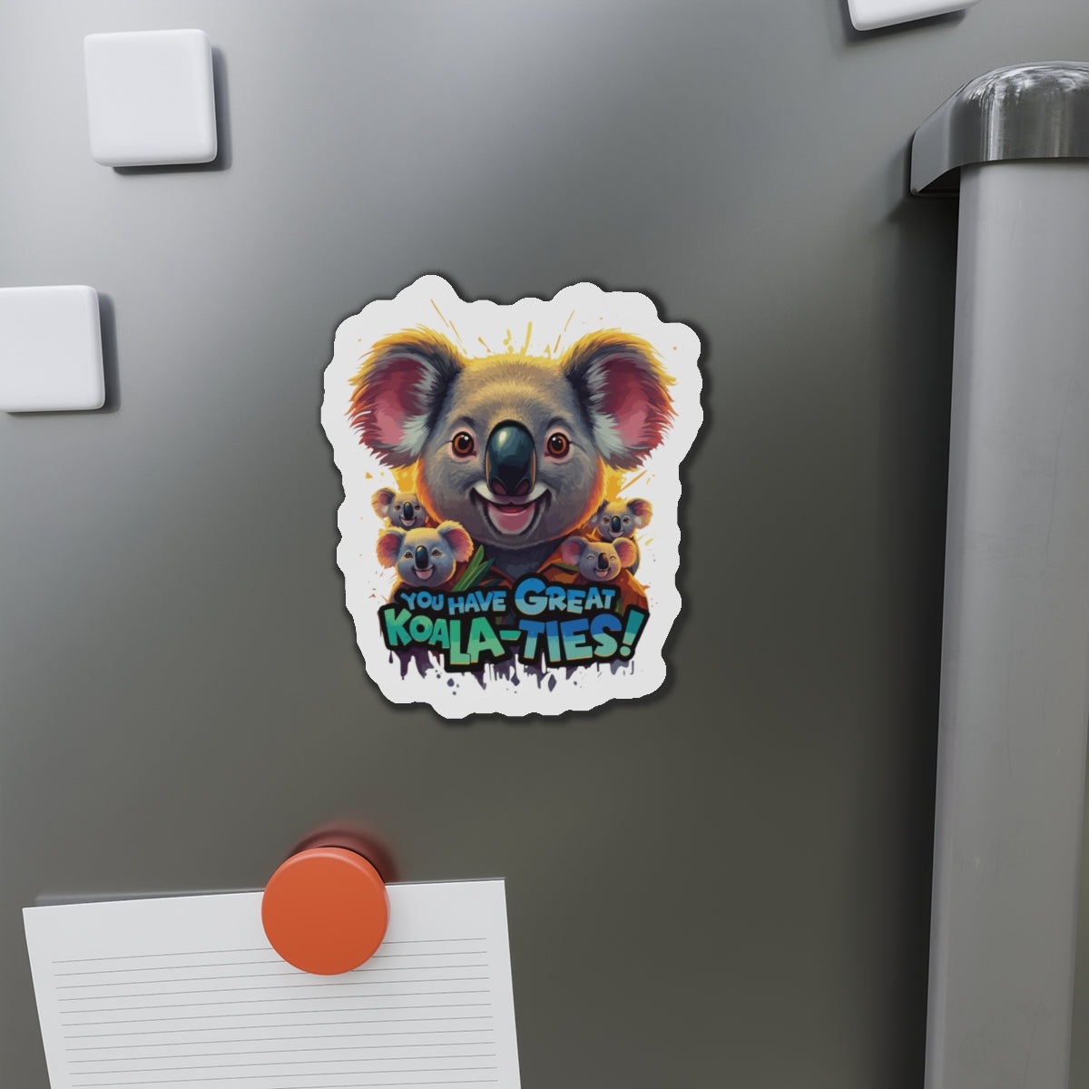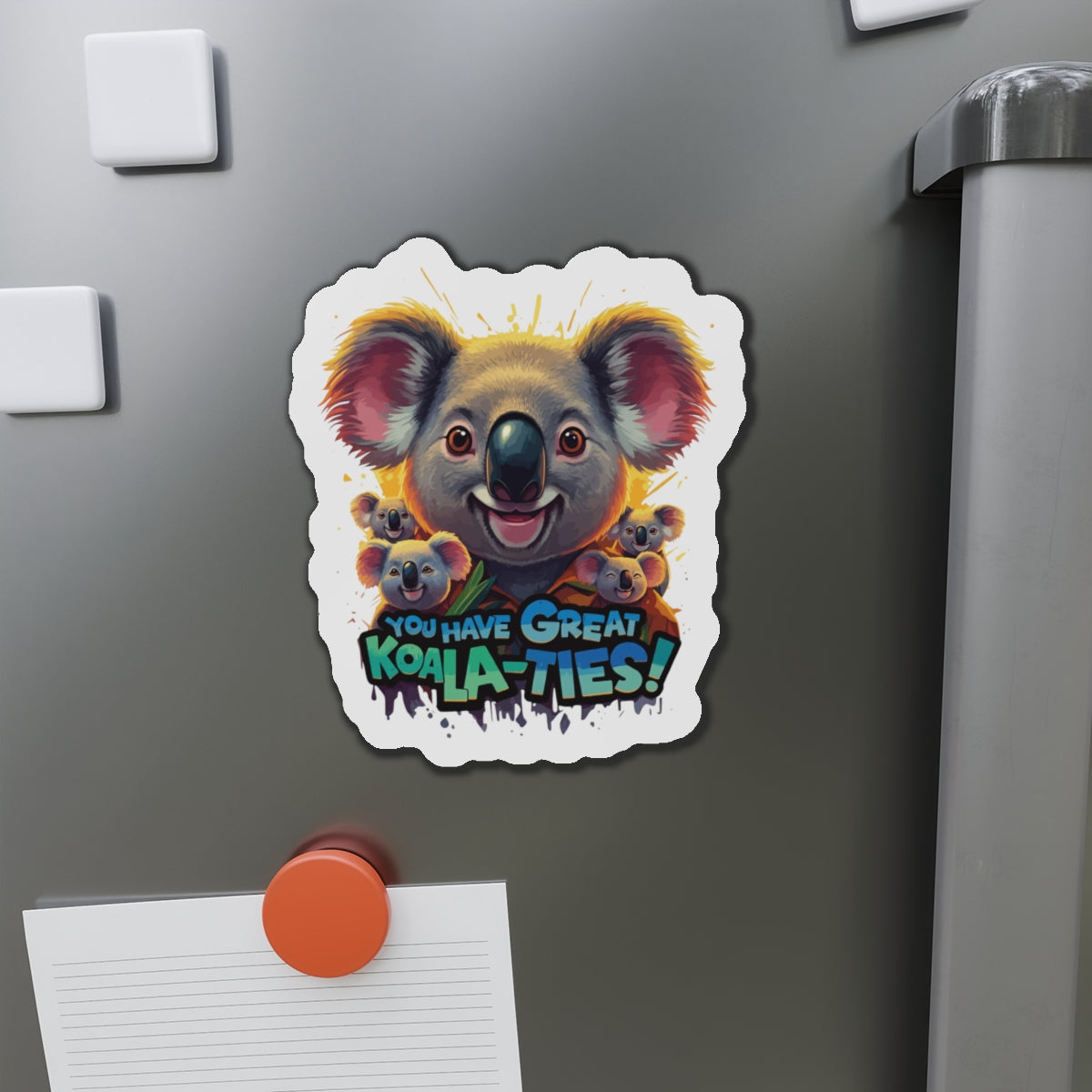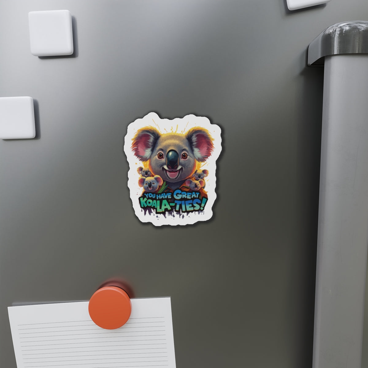 A fun magnet featuring Koala characters with the phrase 'You Have Great Koala-ties'. This magnet adds a touch of cuteness to any magnetic surface and makes a great gift for animal lovers or those who appreciate puns. Perfect for decorating refrigerators, lockers, or magnetic whiteboards. Ideal for those looking to add a bit of whimsy to their space.