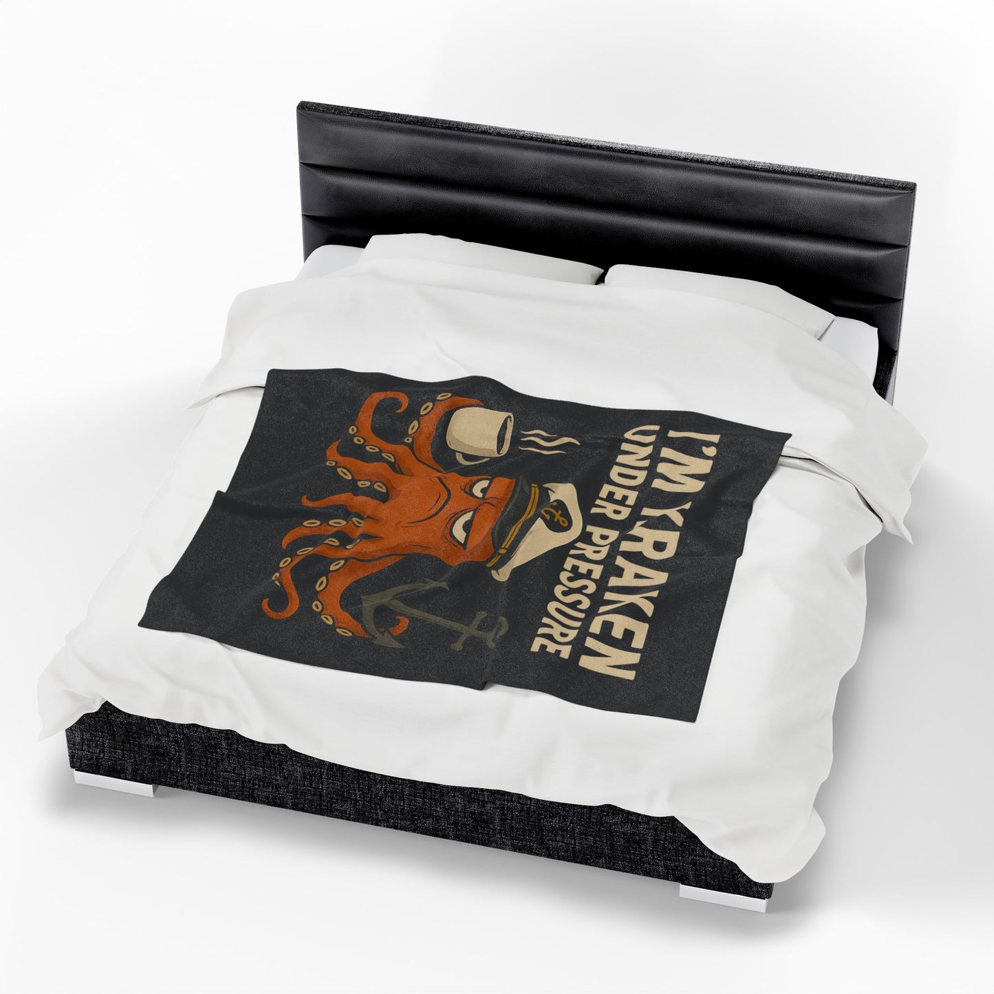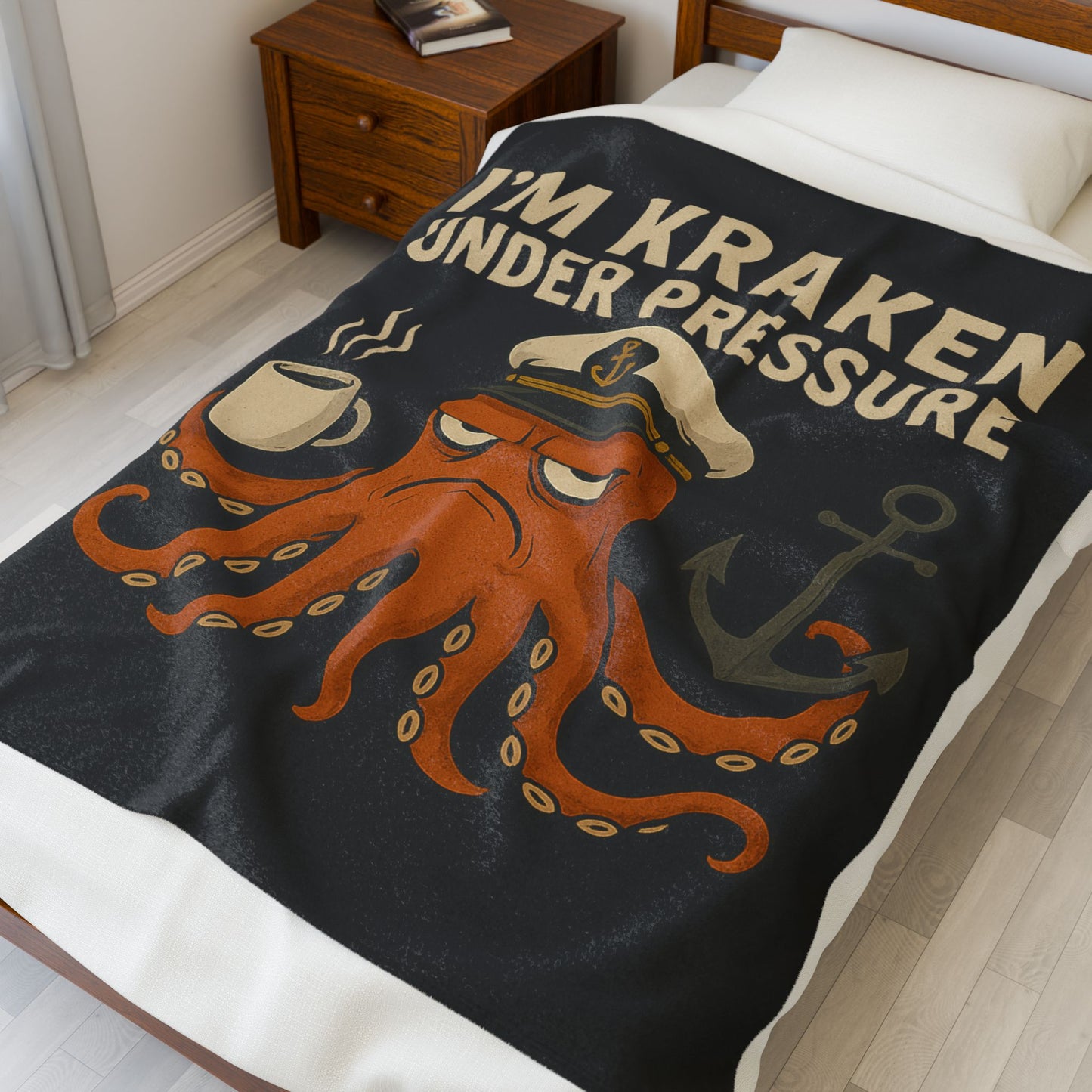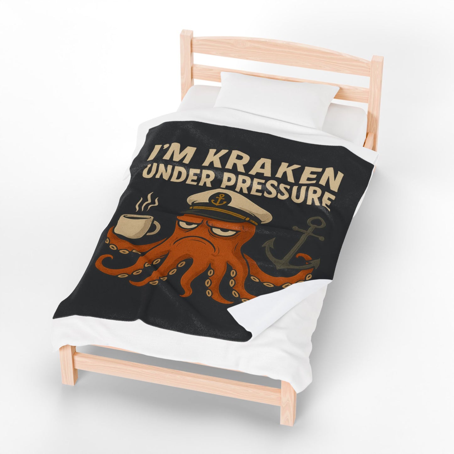 A cozy velveteen plush blanket featuring a stressed Octopus design with the phrase 'I'm Kraken Under Pressure'. Perfect for those who enjoy quirky and playful designs, and looking to add a touch of humor to their living space. Ideal for adults seeking a unique gift for birthdays, holidays, or just to add some fun to their home decor.