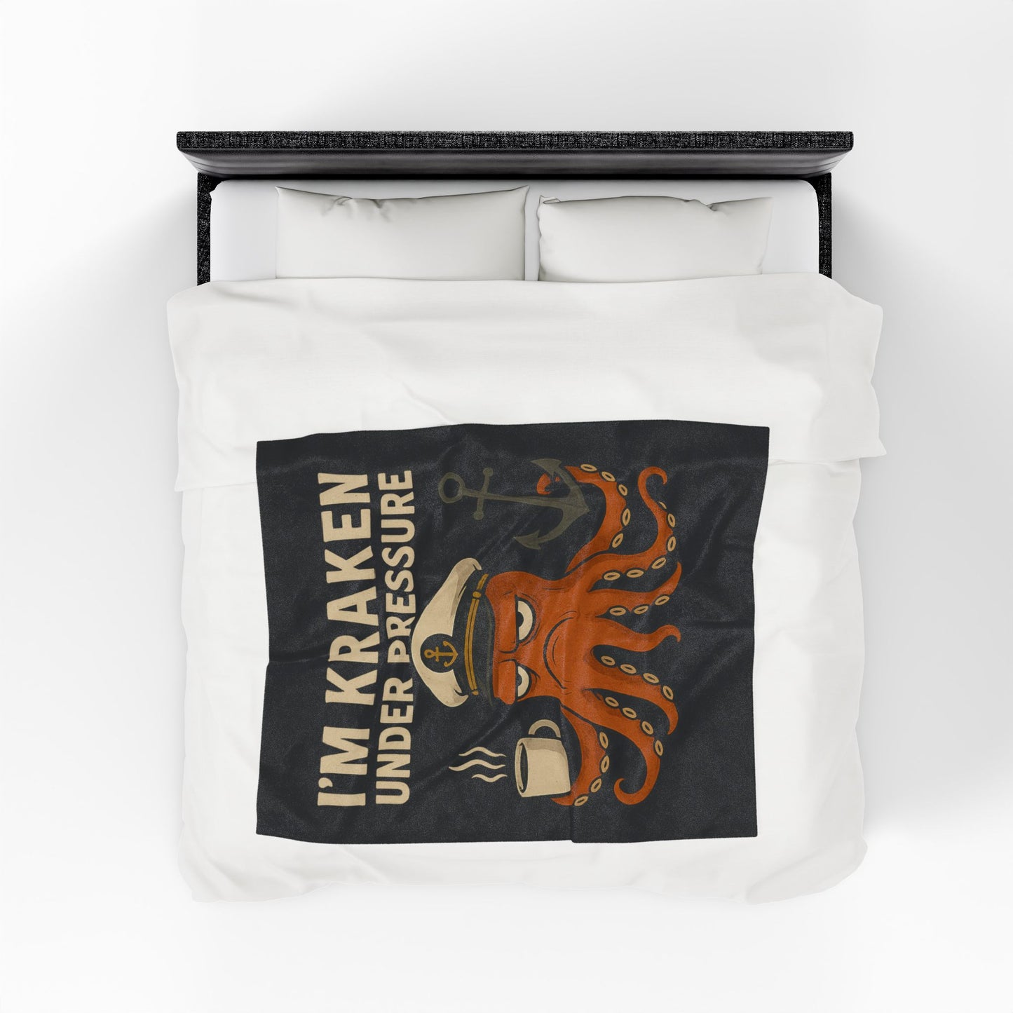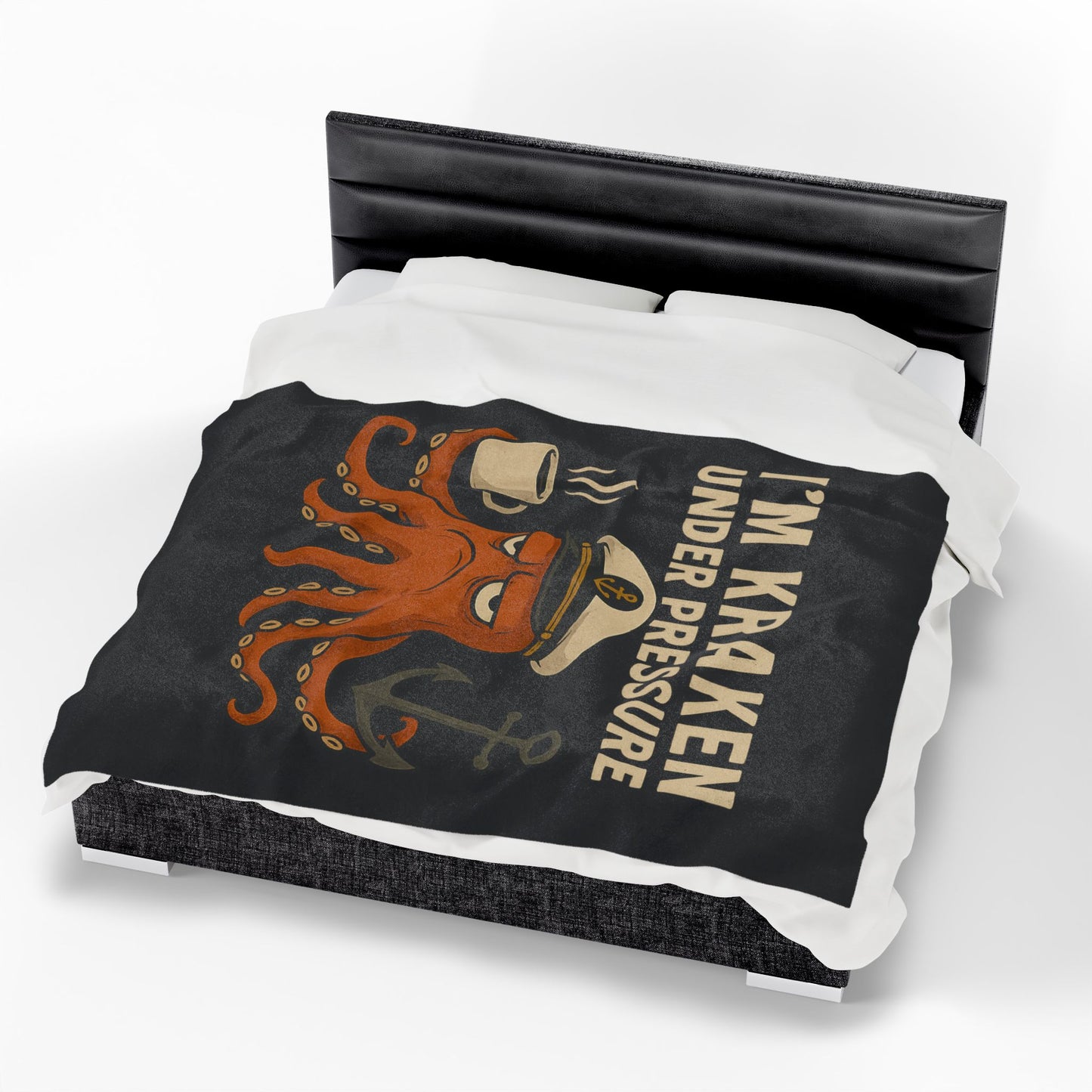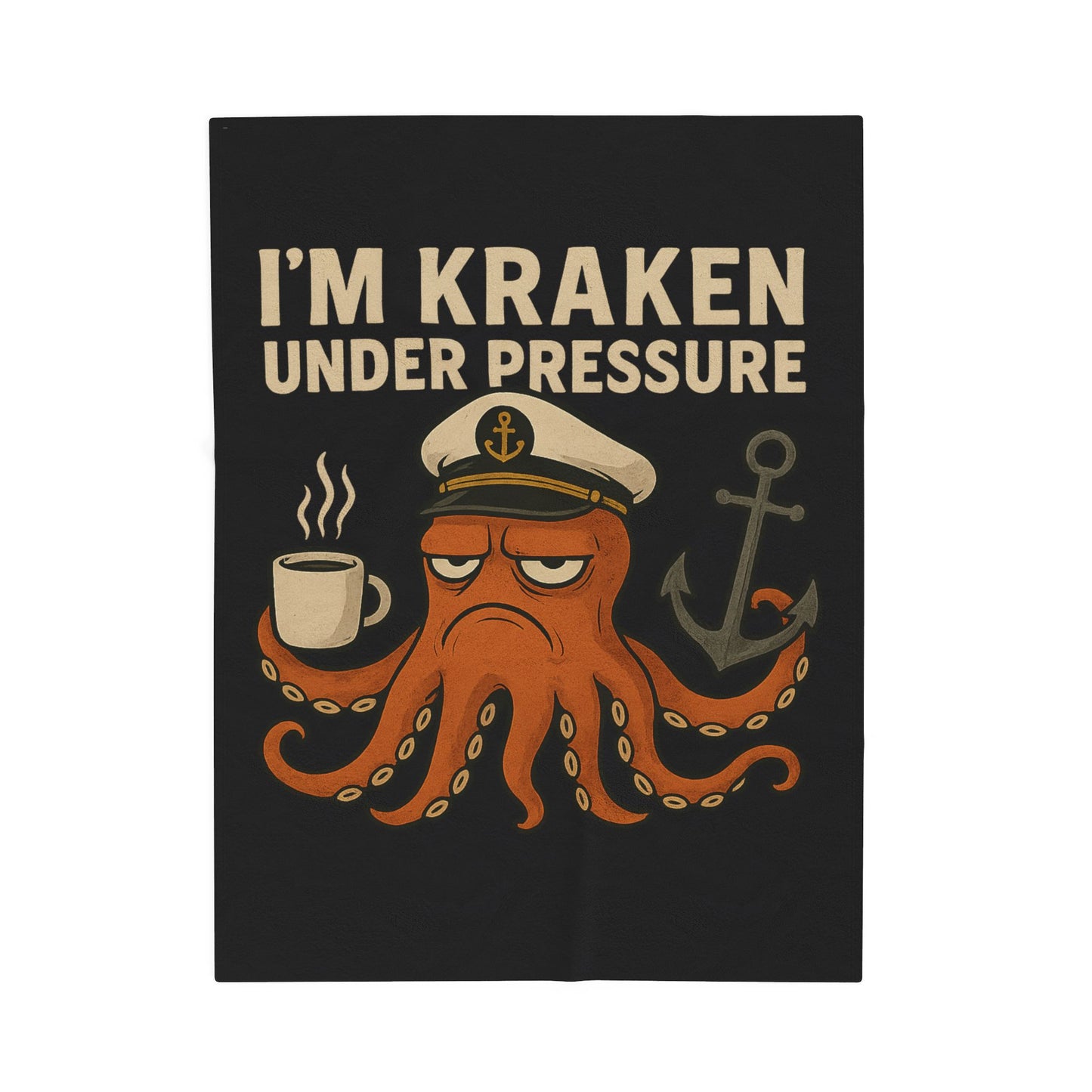 A cozy velveteen plush blanket featuring a stressed Octopus design with the phrase 'I'm Kraken Under Pressure'. Perfect for those who enjoy quirky and playful designs, and looking to add a touch of humor to their living space. Ideal for adults seeking a unique gift for birthdays, holidays, or just to add some fun to their home decor.