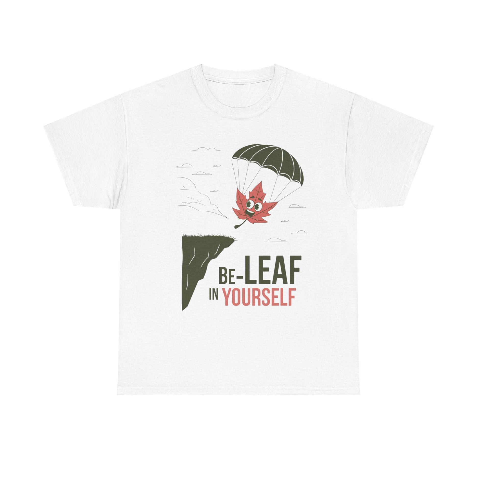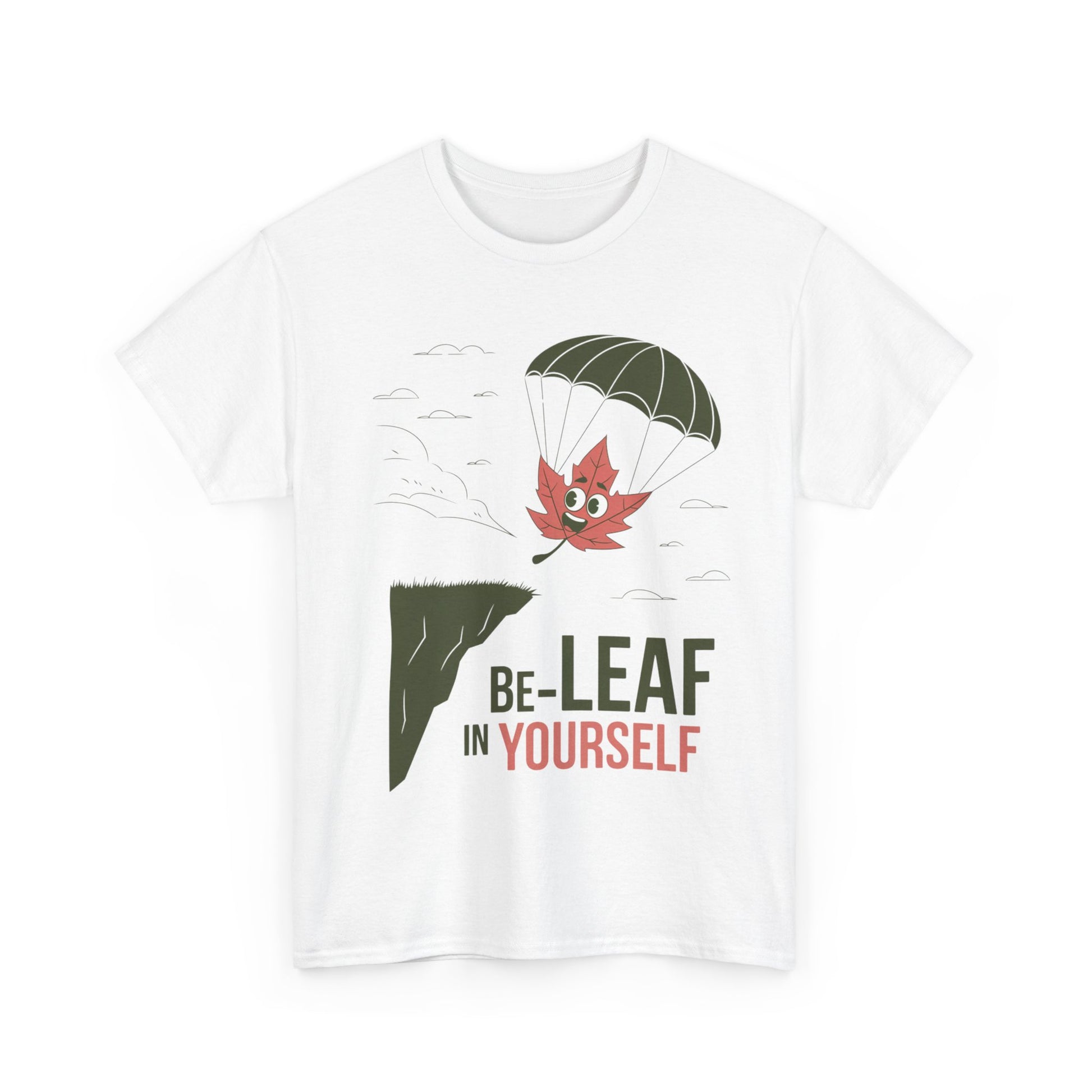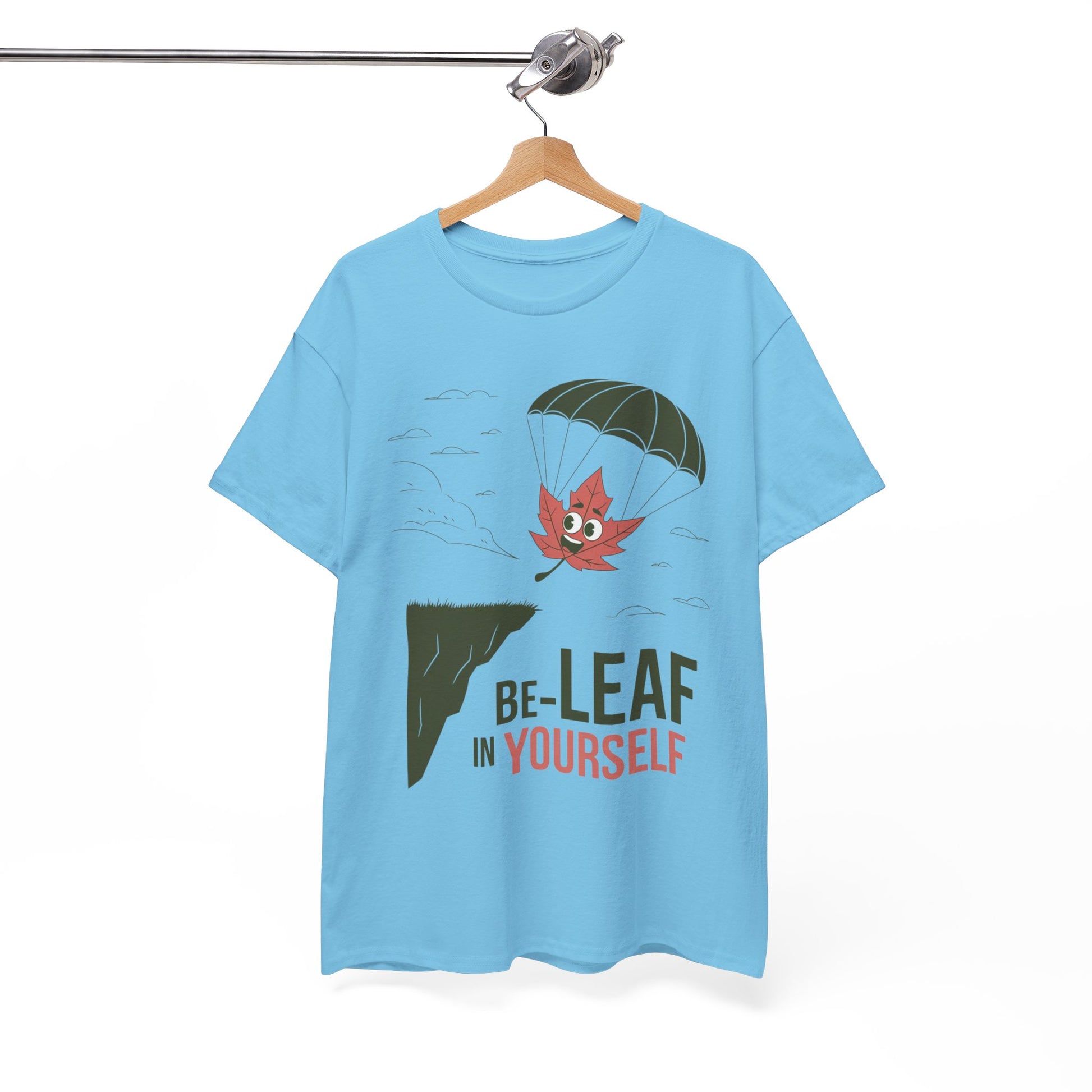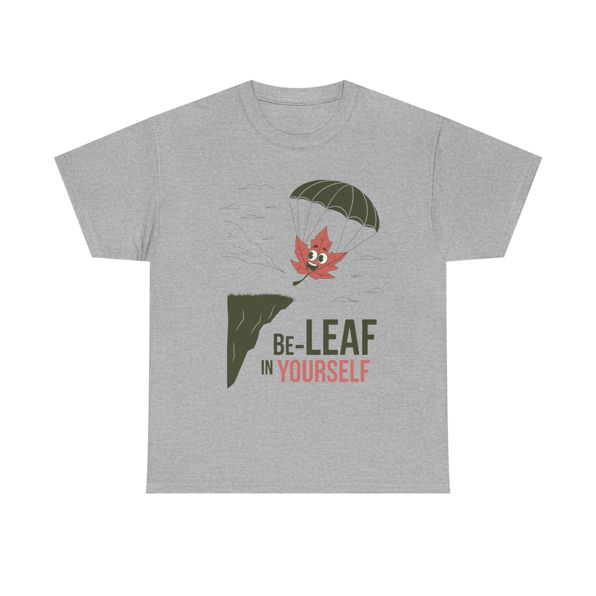 Be-Leaf In Yourself Maple Leaf Parachute T-Shirt | Funny Motivational Nature Graphic Tee | Self-Love Fall Autumn Shirt | Outdoorsy Gift