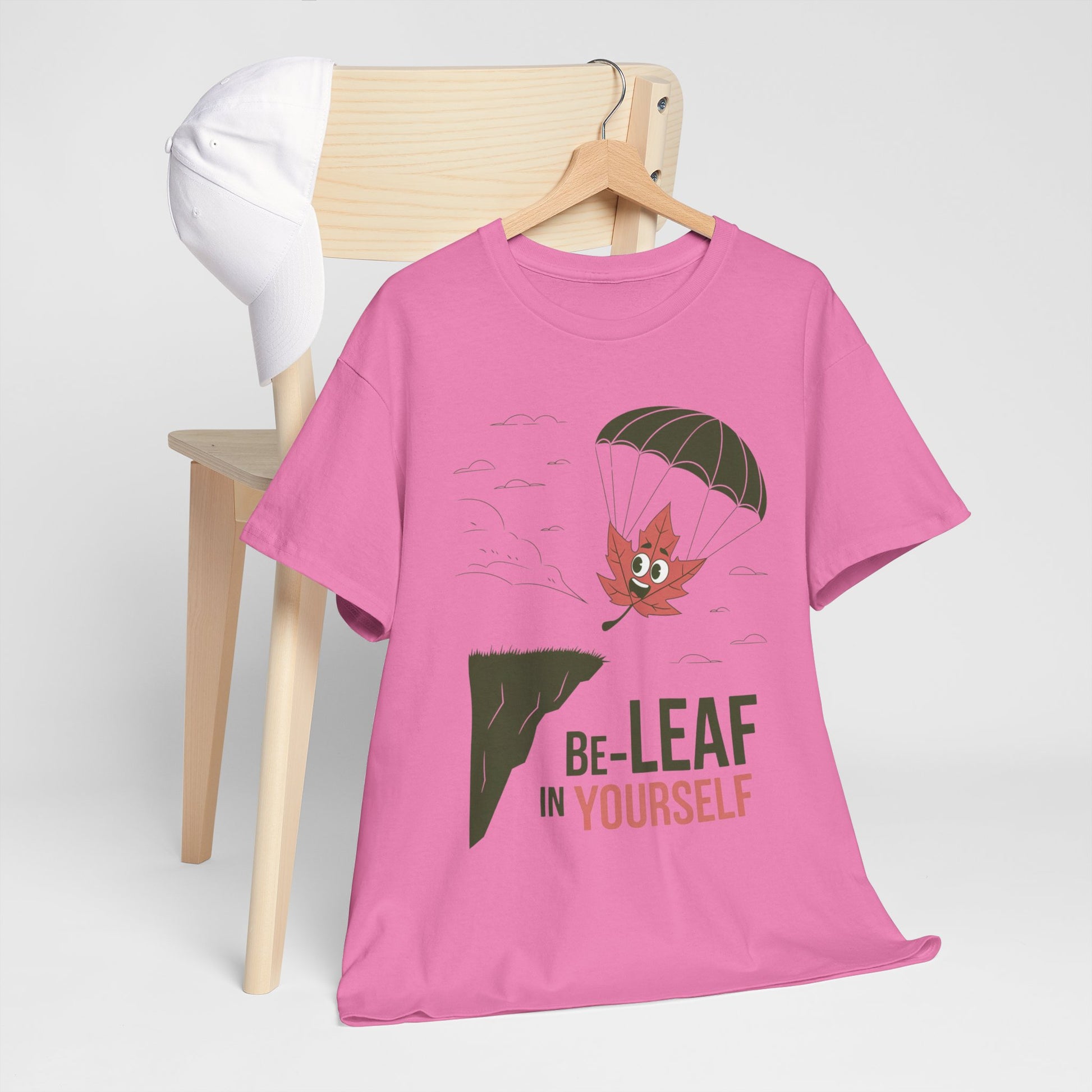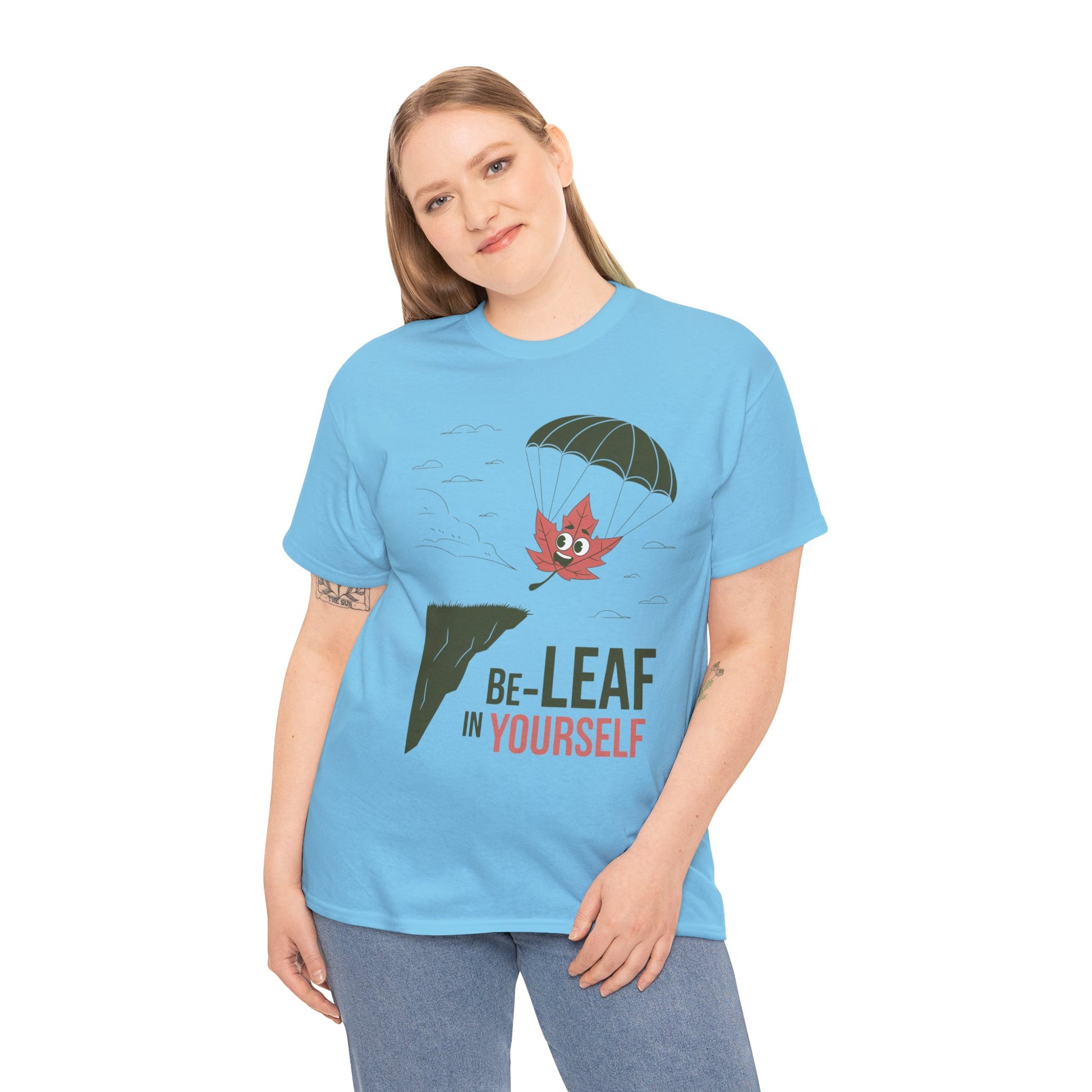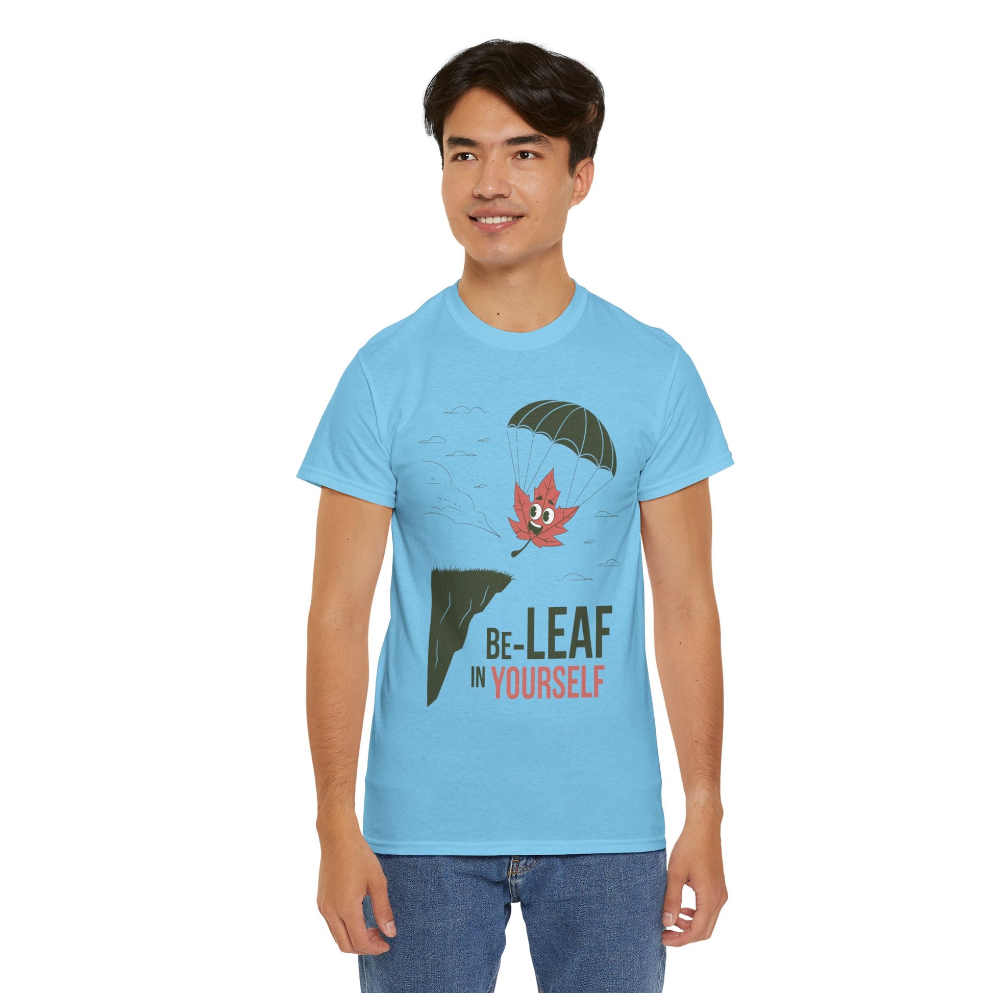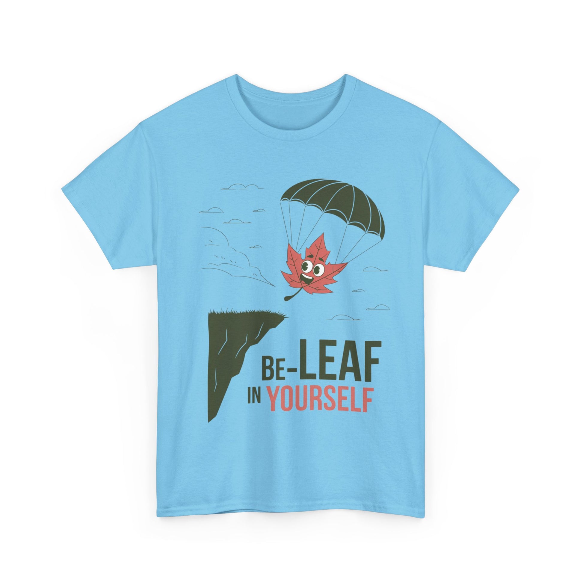 Be-Leaf In Yourself Maple Leaf Parachute T-Shirt | Funny Motivational Nature Graphic Tee | Self-Love Fall Autumn Shirt | Outdoorsy Gift
