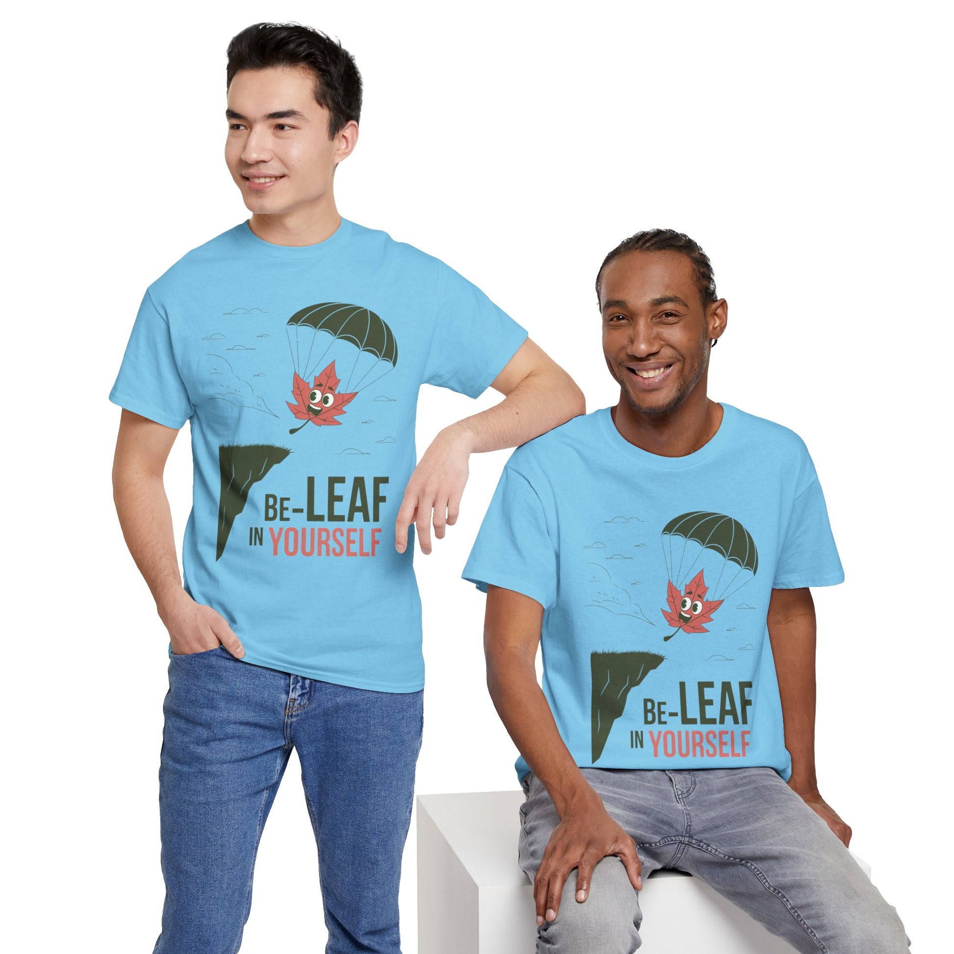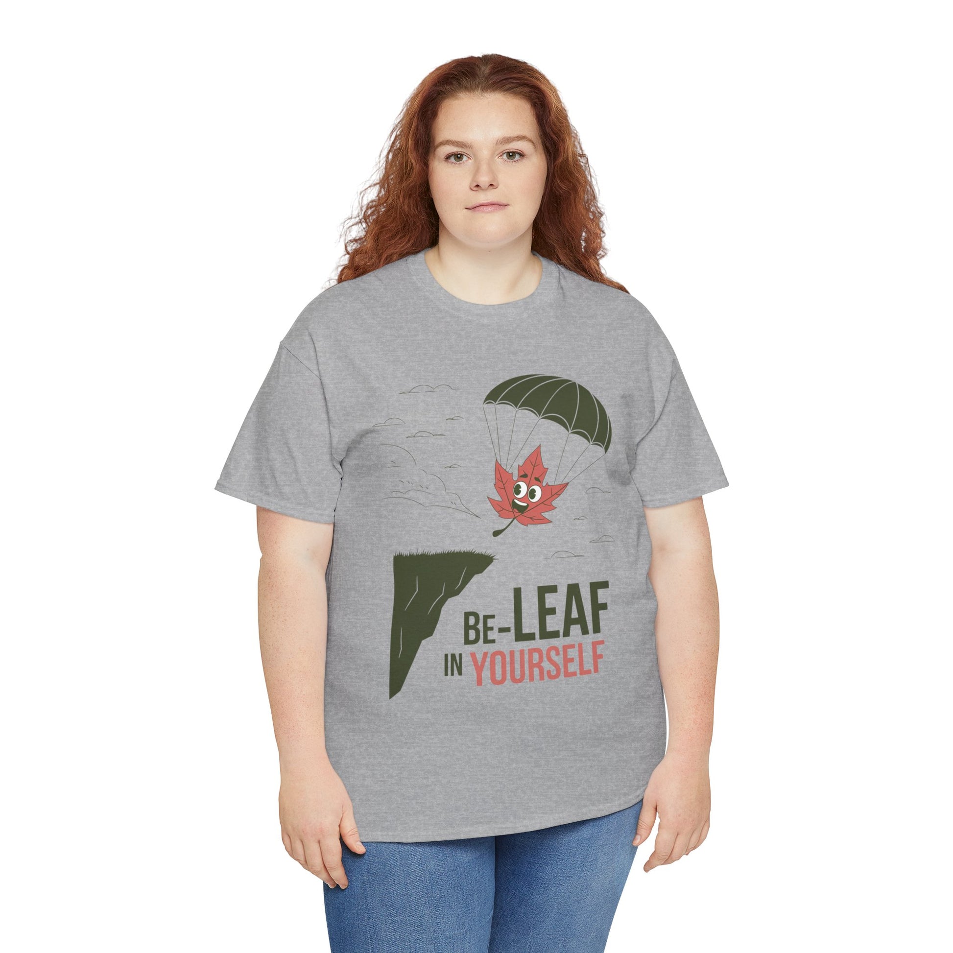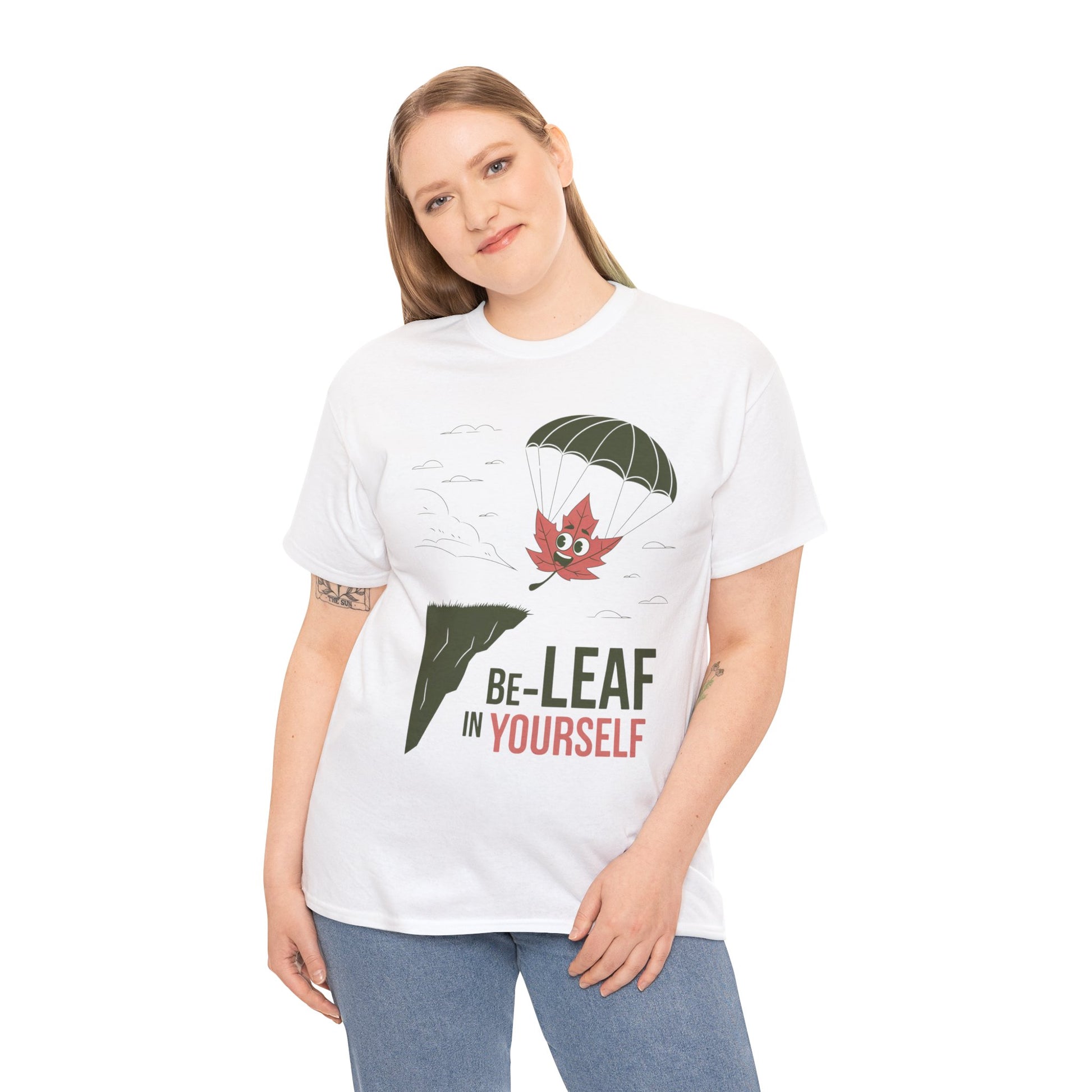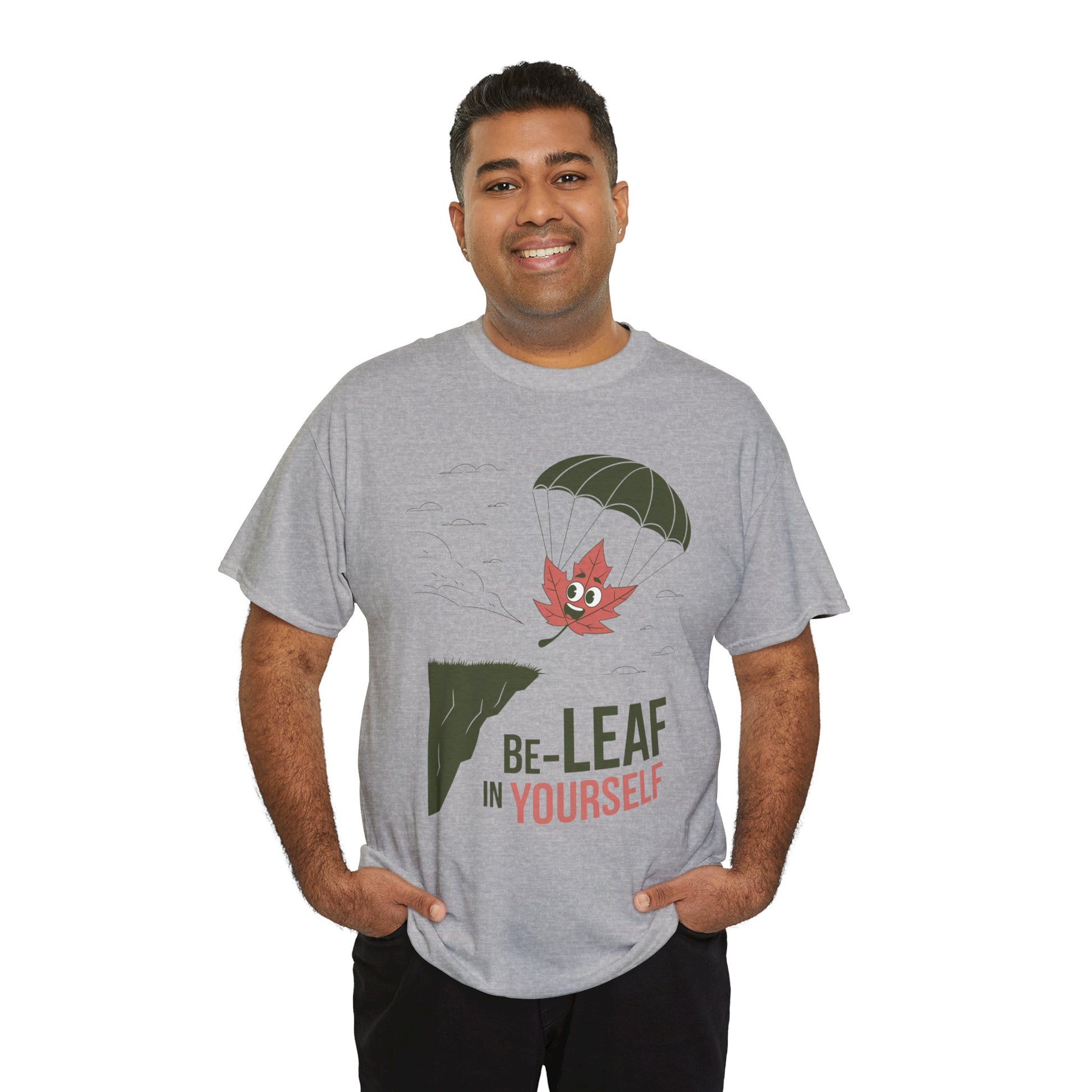 Be-Leaf In Yourself Maple Leaf Parachute T-Shirt | Funny Motivational Nature Graphic Tee | Self-Love Fall Autumn Shirt | Outdoorsy Gift