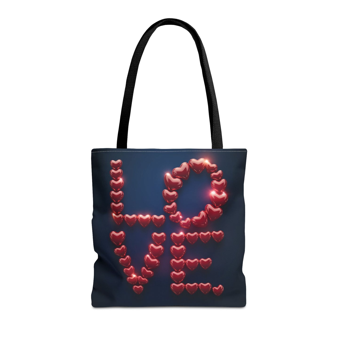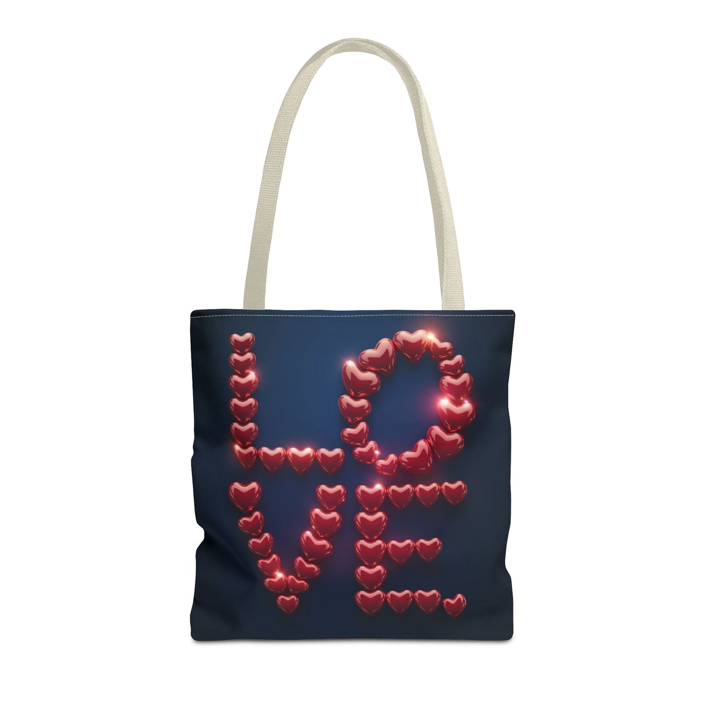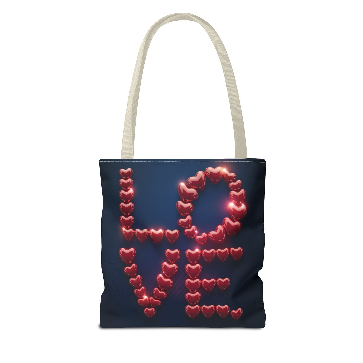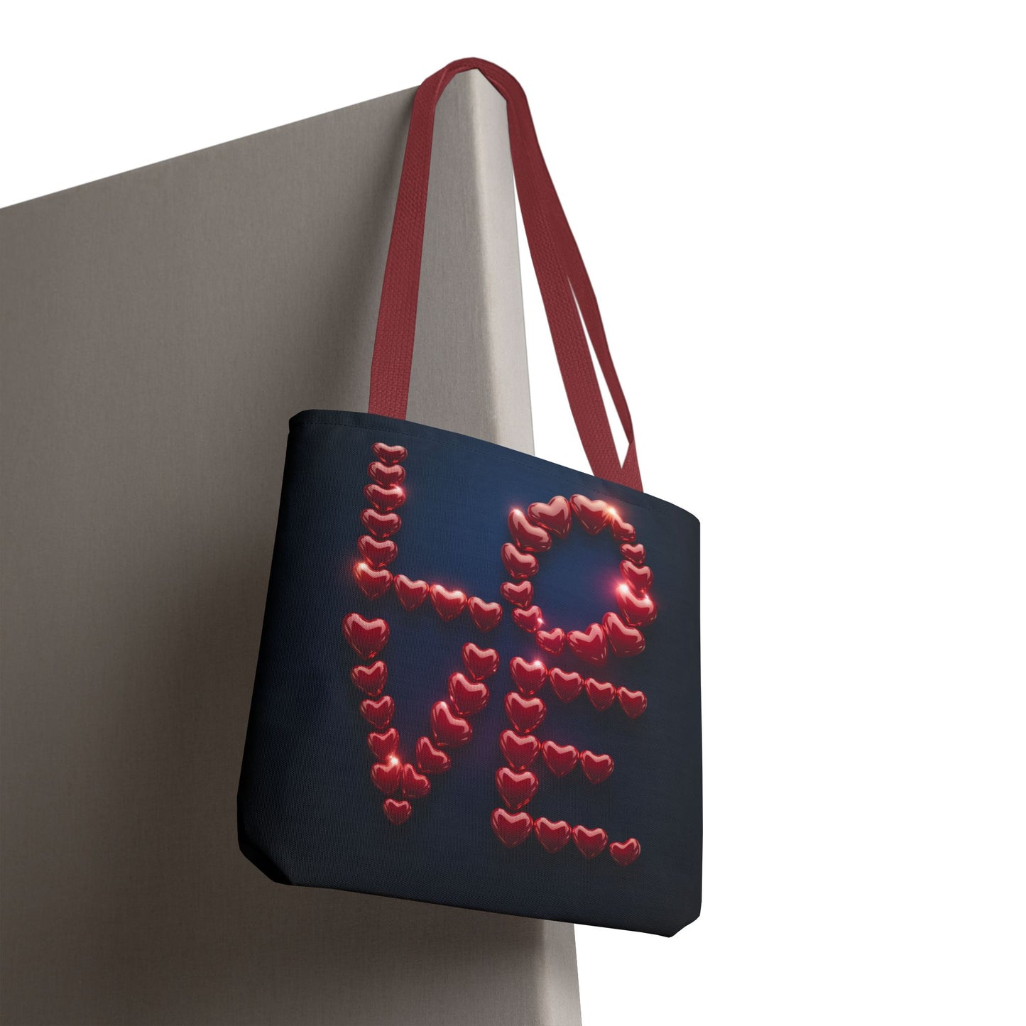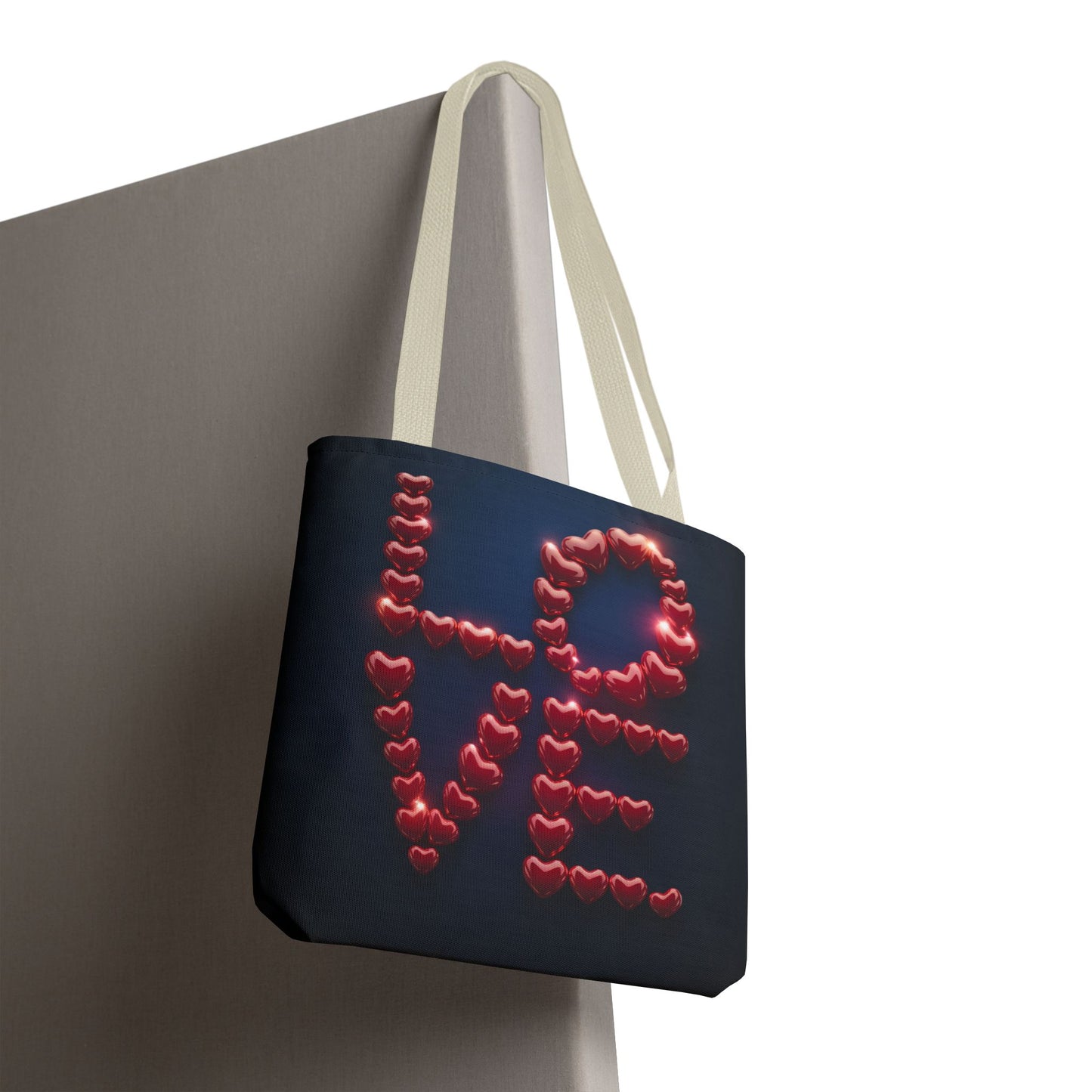 A fun tote bag with the word Love spelled out of hearts. This tote bag exudes a cheerful and loving vibe, making it a perfect accessory for everyday use or a thoughtful gift for someone special. Ideal for those who appreciate unique and eye-catching designs, suitable for Valentine's Day, birthdays, or just to spread love and positivity.