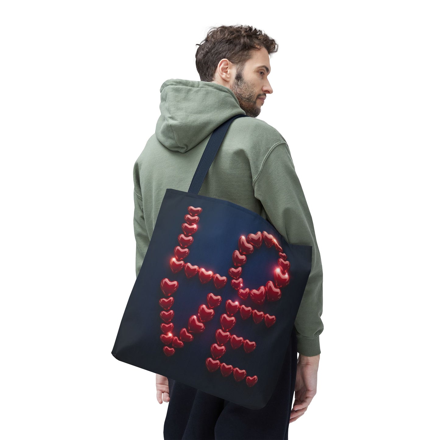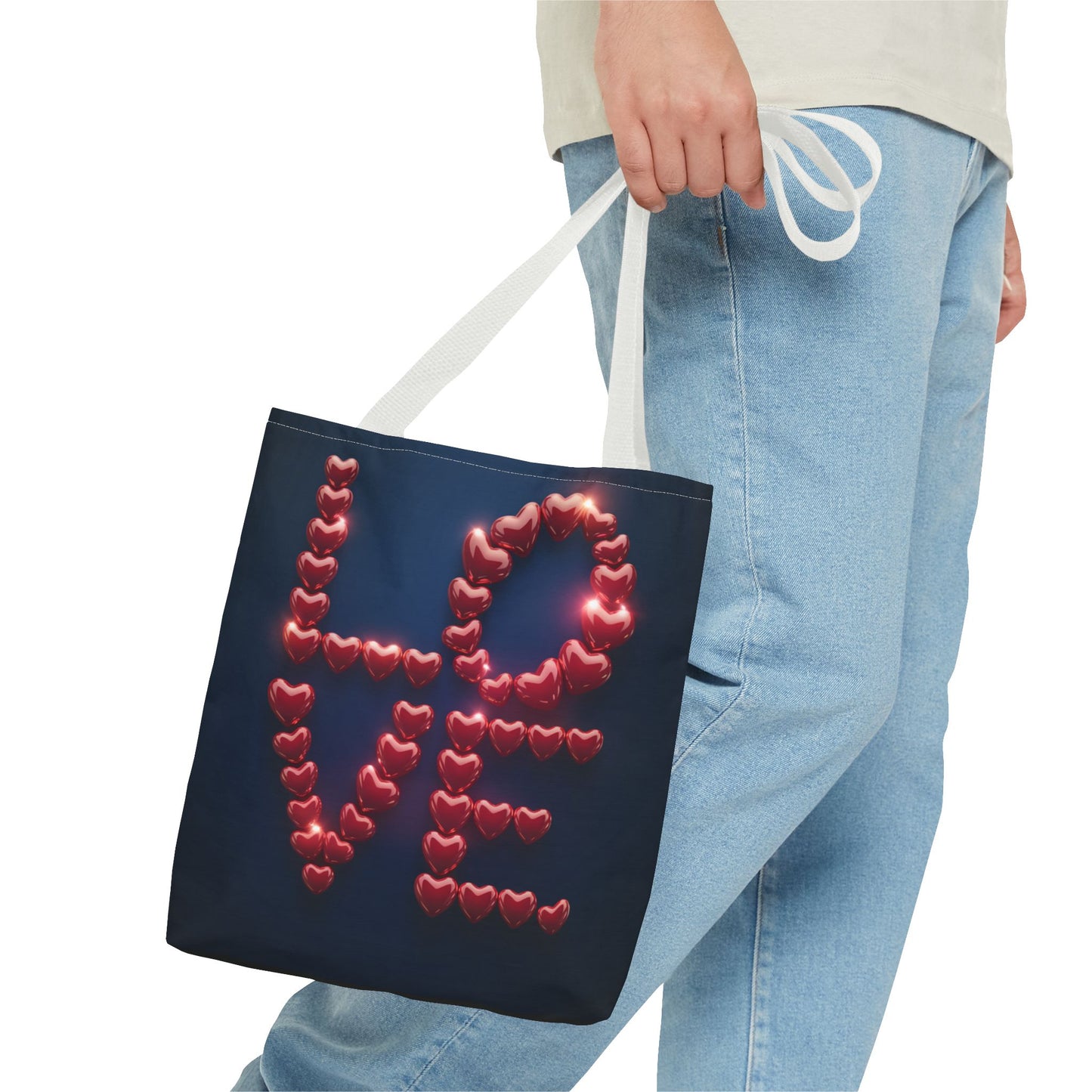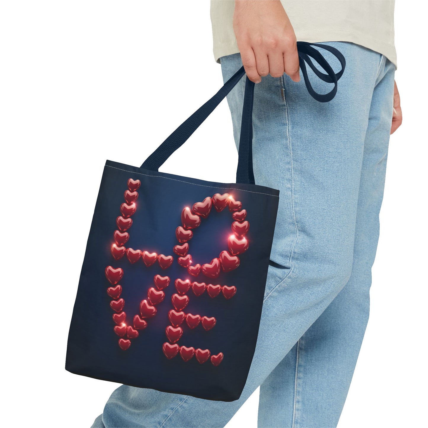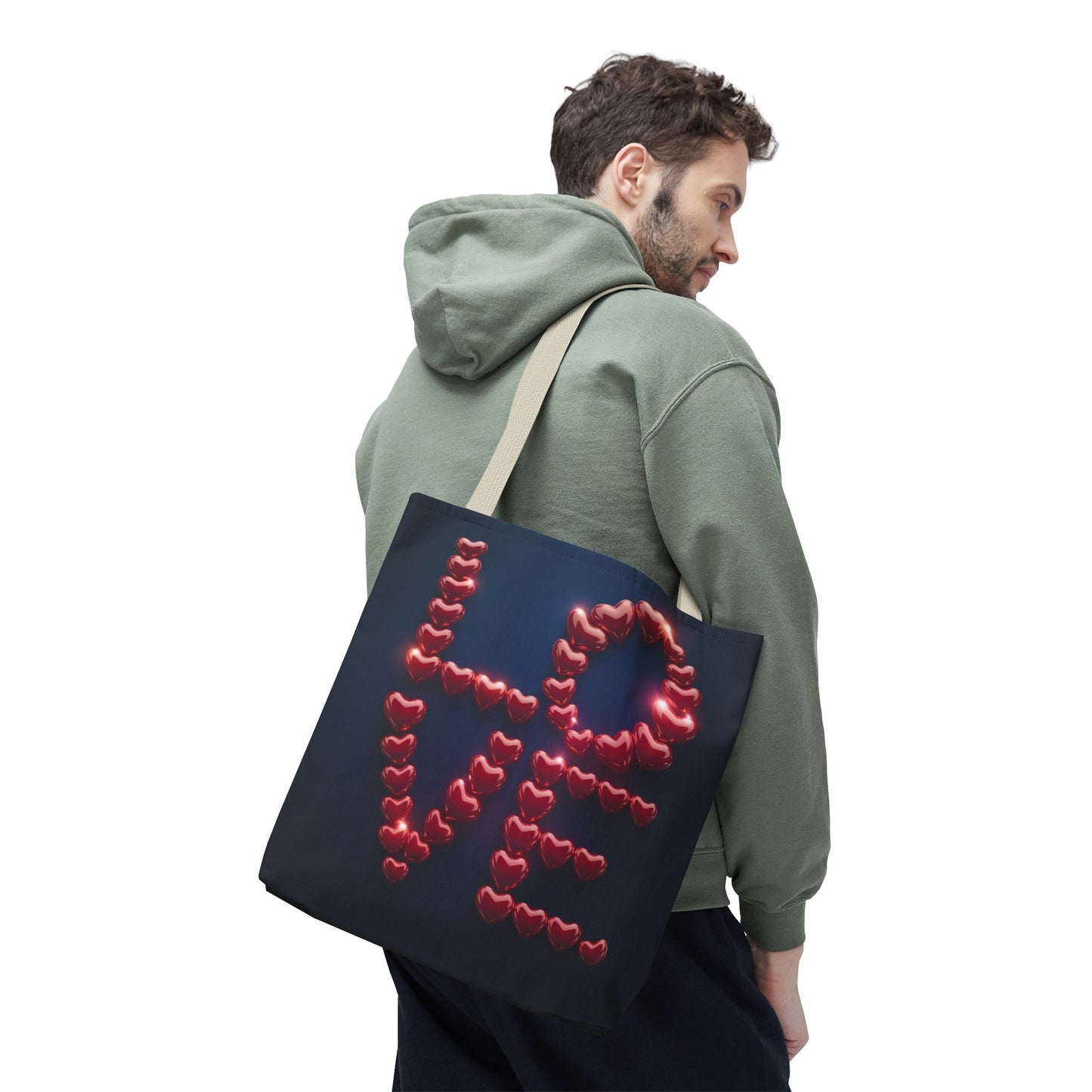 A fun tote bag with the word Love spelled out of hearts. This tote bag exudes a cheerful and loving vibe, making it a perfect accessory for everyday use or a thoughtful gift for someone special. Ideal for those who appreciate unique and eye-catching designs, suitable for Valentine's Day, birthdays, or just to spread love and positivity.