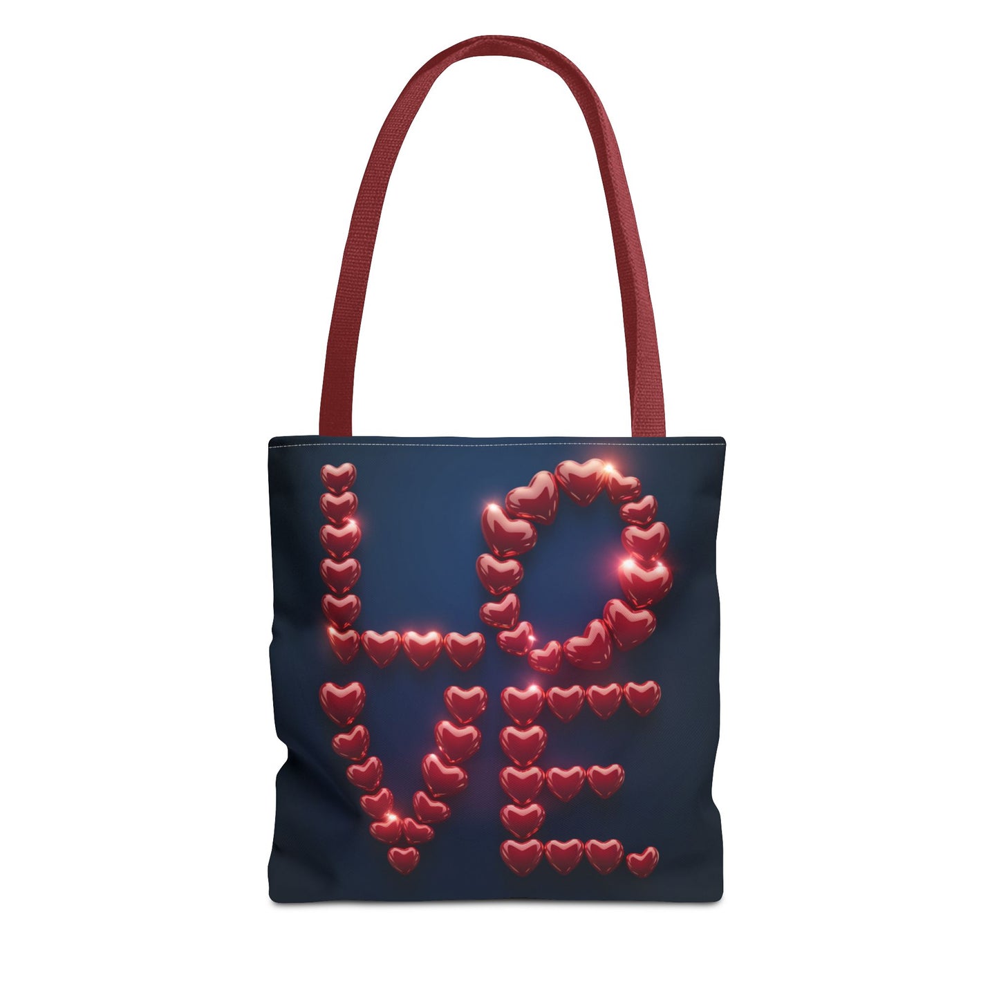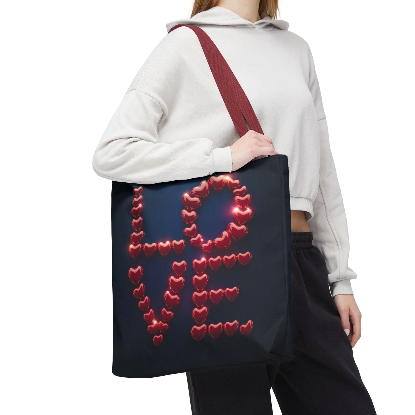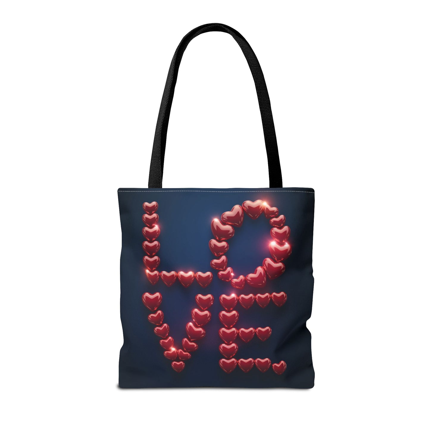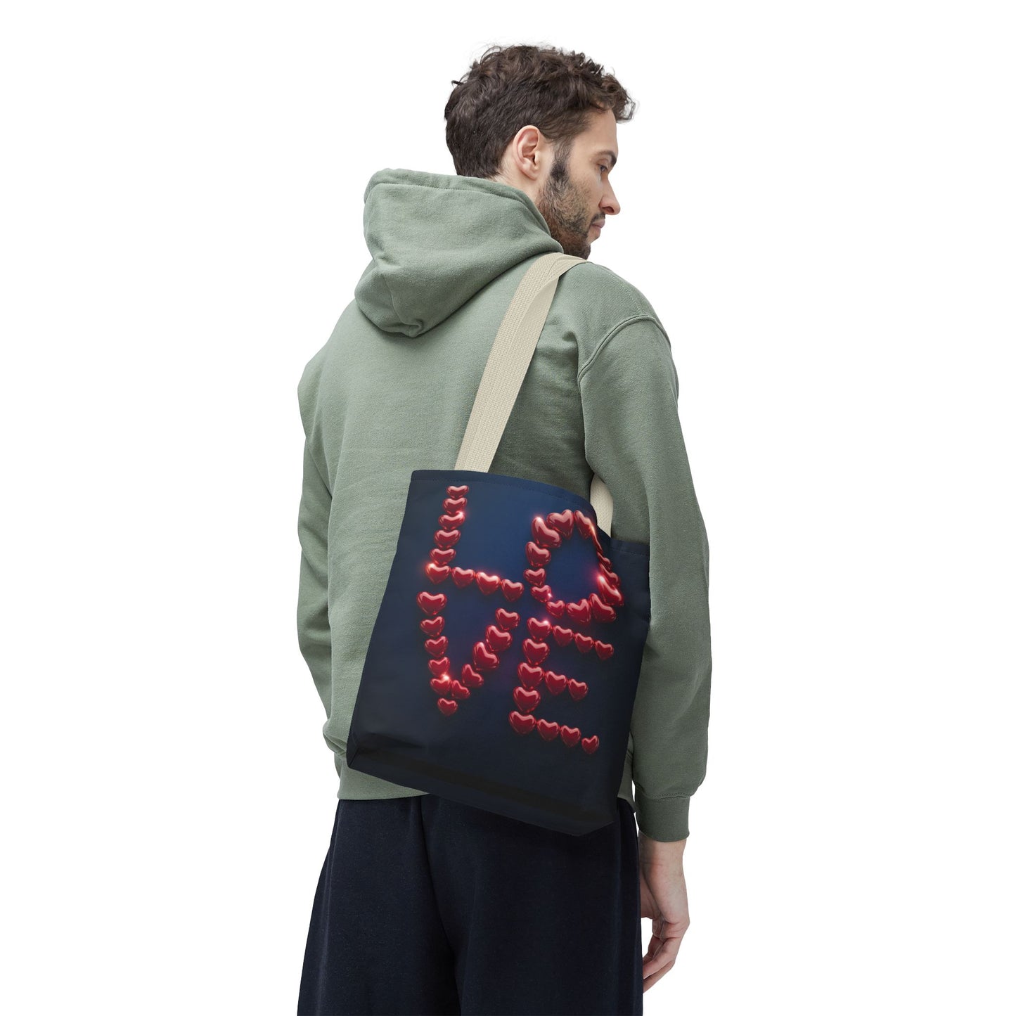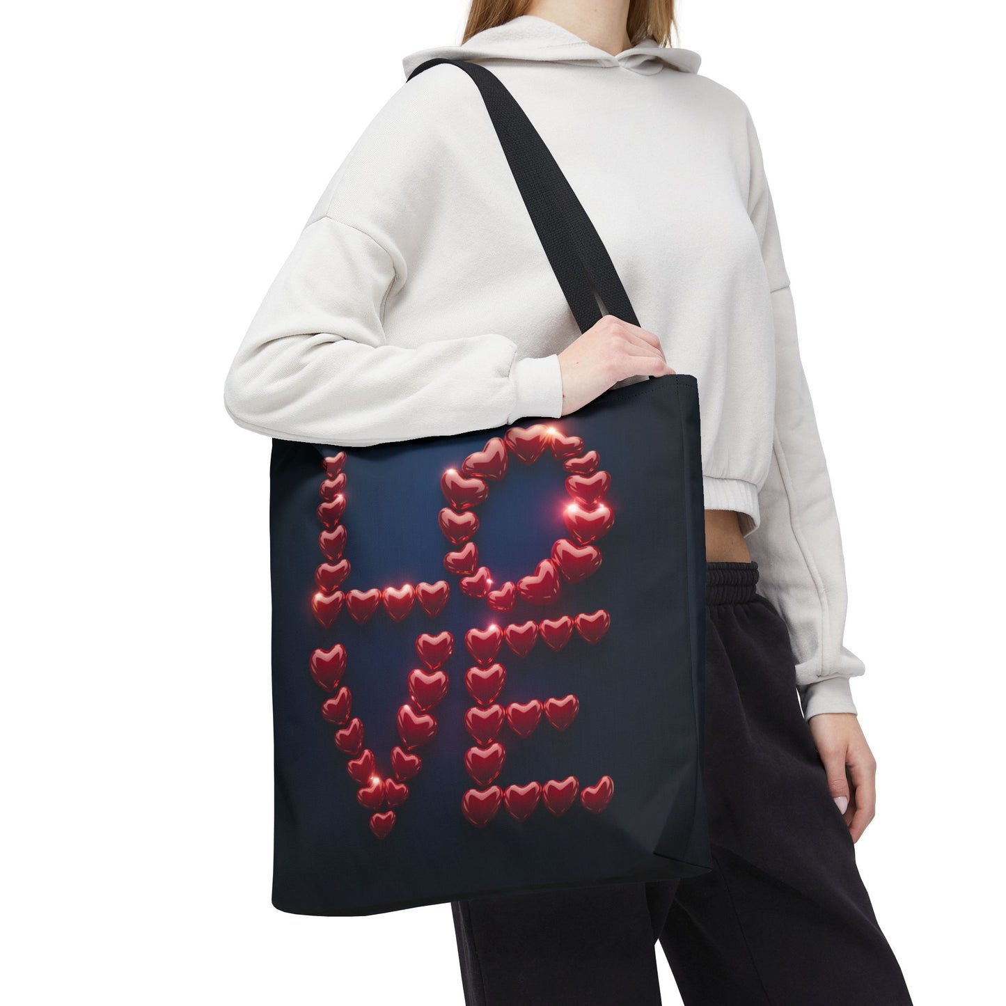 A fun tote bag with the word Love spelled out of hearts. This tote bag exudes a cheerful and loving vibe, making it a perfect accessory for everyday use or a thoughtful gift for someone special. Ideal for those who appreciate unique and eye-catching designs, suitable for Valentine's Day, birthdays, or just to spread love and positivity.
