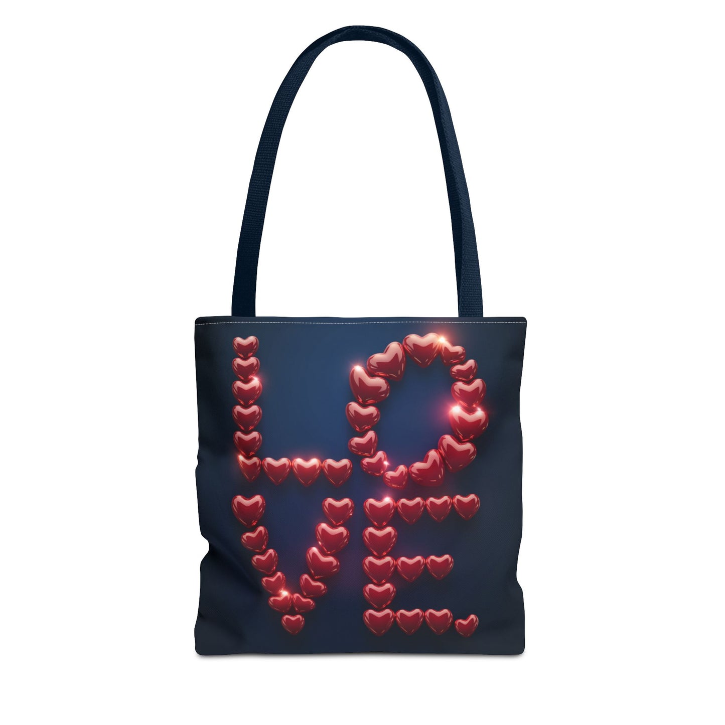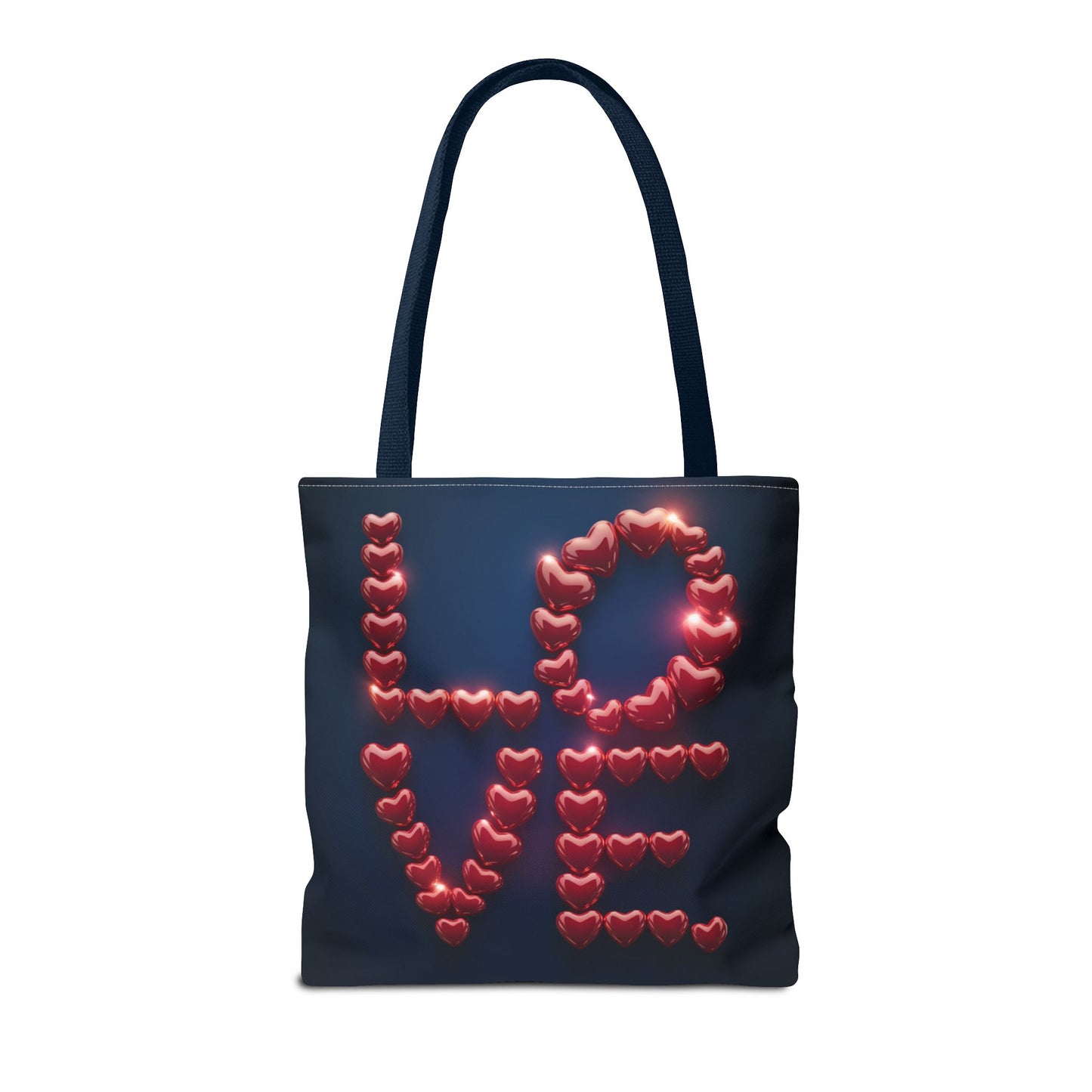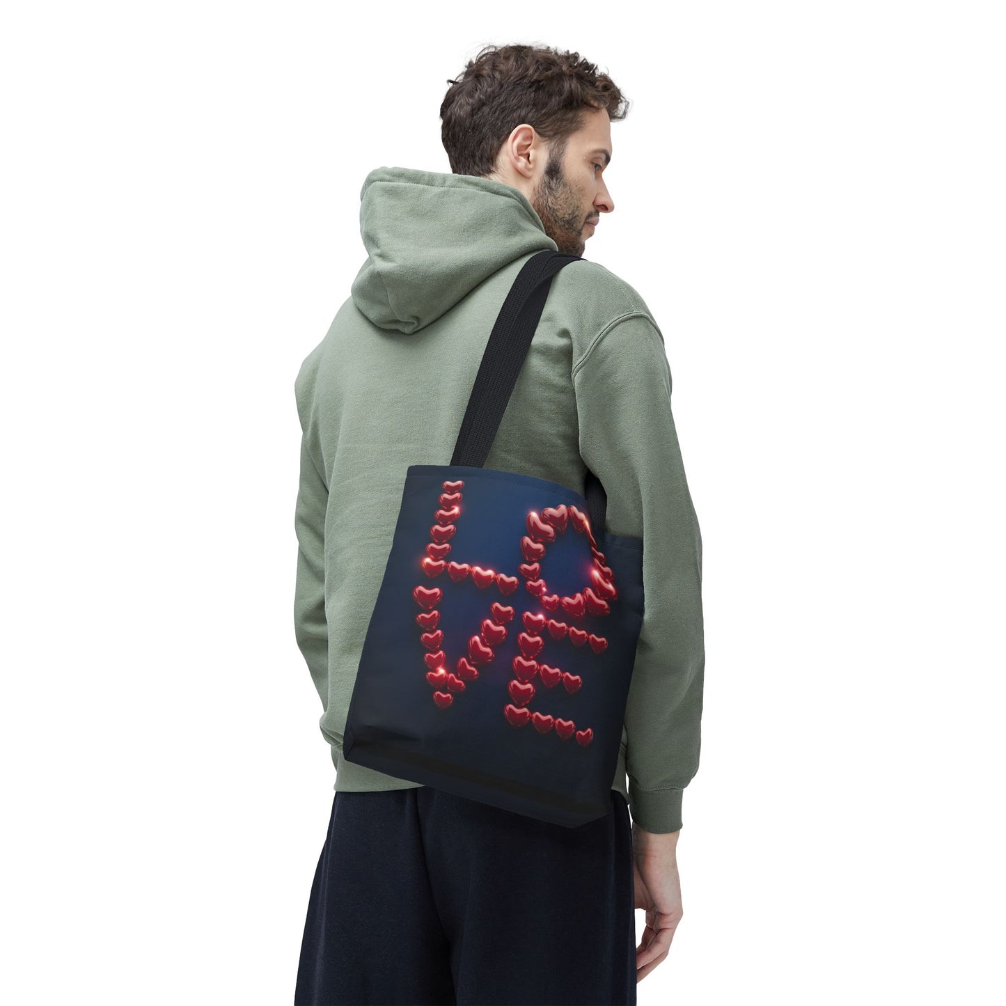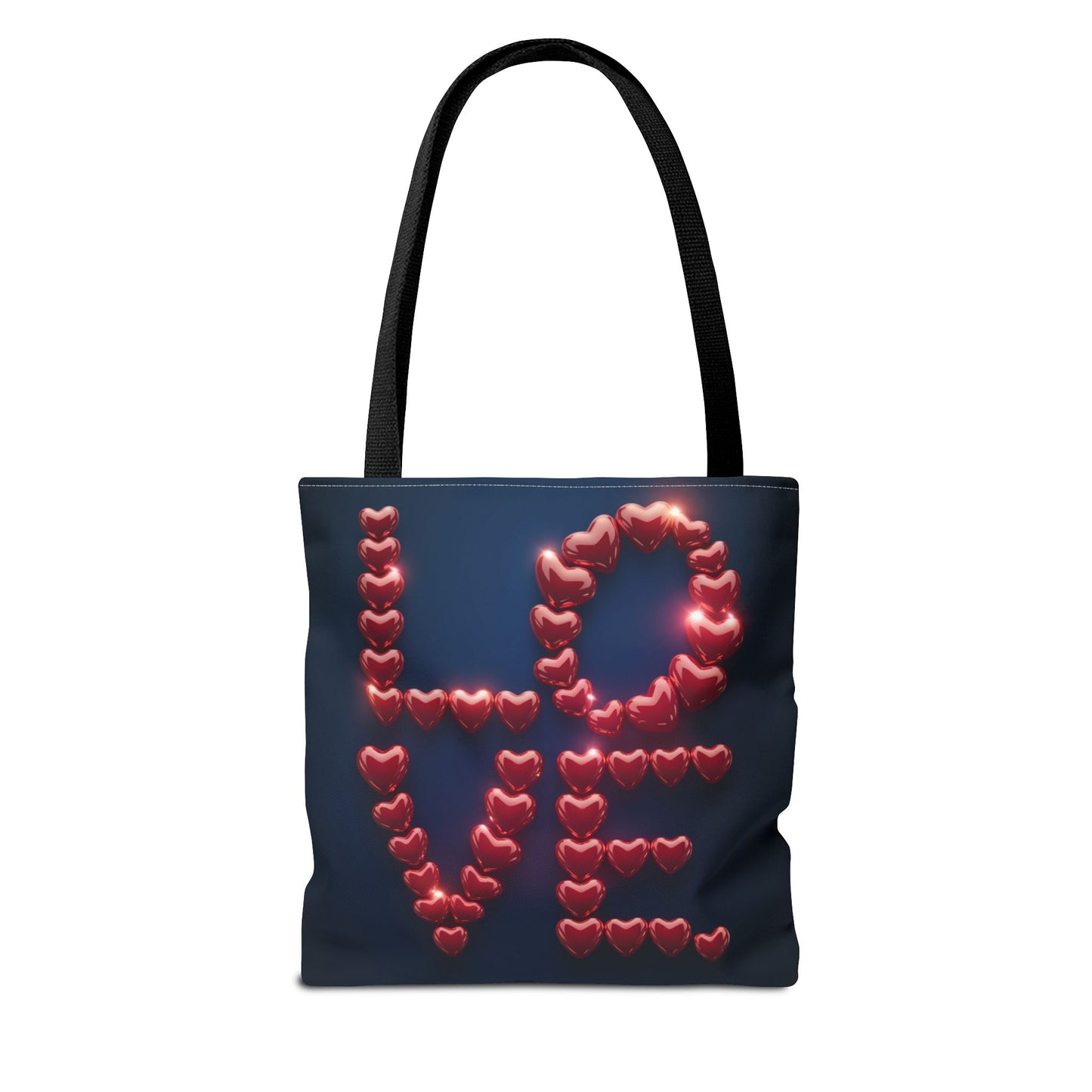 A fun tote bag with the word Love spelled out of hearts. This tote bag exudes a cheerful and loving vibe, making it a perfect accessory for everyday use or a thoughtful gift for someone special. Ideal for those who appreciate unique and eye-catching designs, suitable for Valentine's Day, birthdays, or just to spread love and positivity.