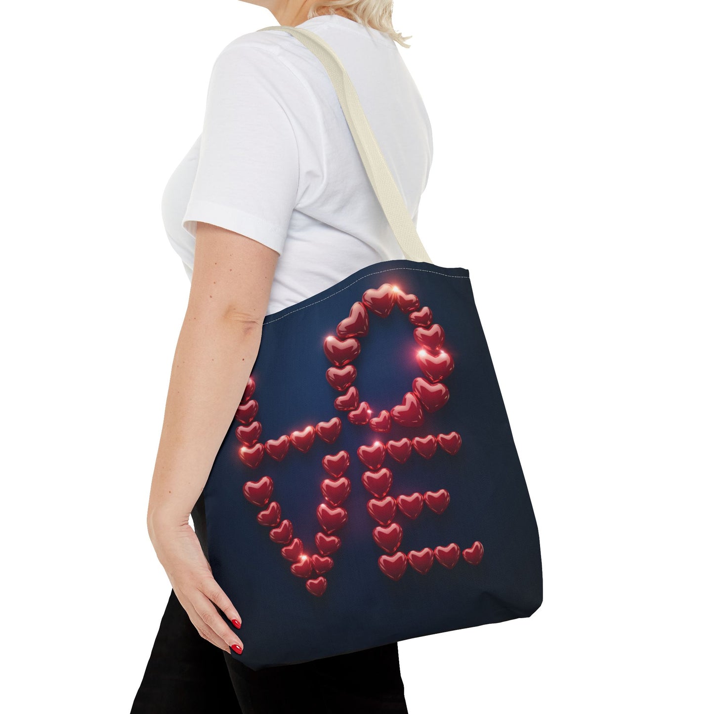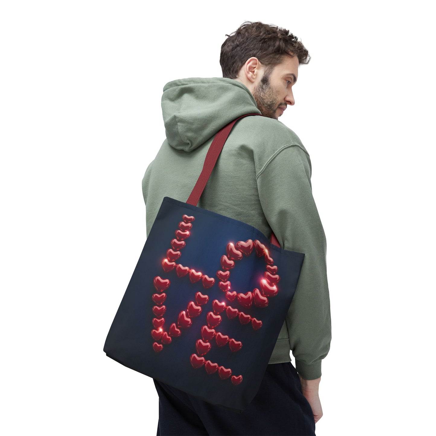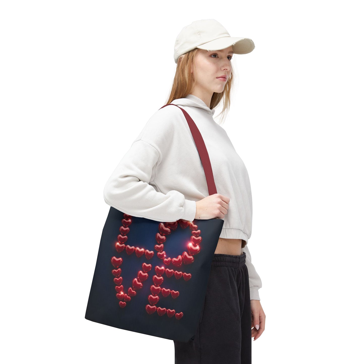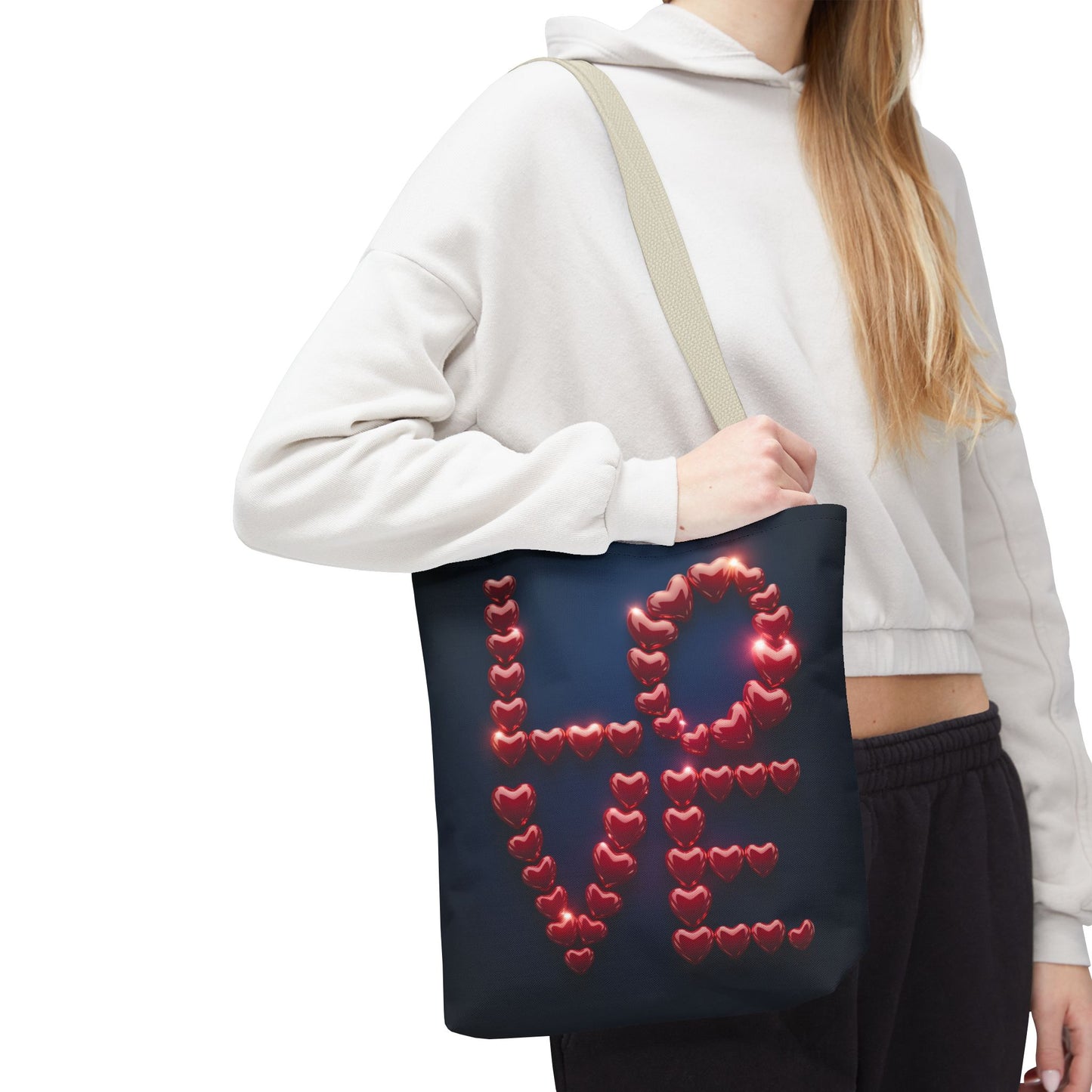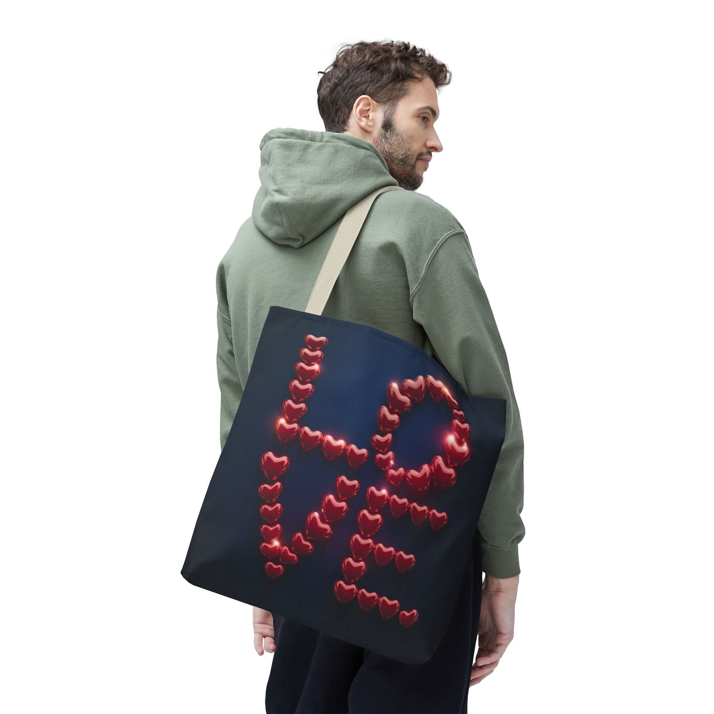 A fun tote bag with the word Love spelled out of hearts. This tote bag exudes a cheerful and loving vibe, making it a perfect accessory for everyday use or a thoughtful gift for someone special. Ideal for those who appreciate unique and eye-catching designs, suitable for Valentine's Day, birthdays, or just to spread love and positivity.