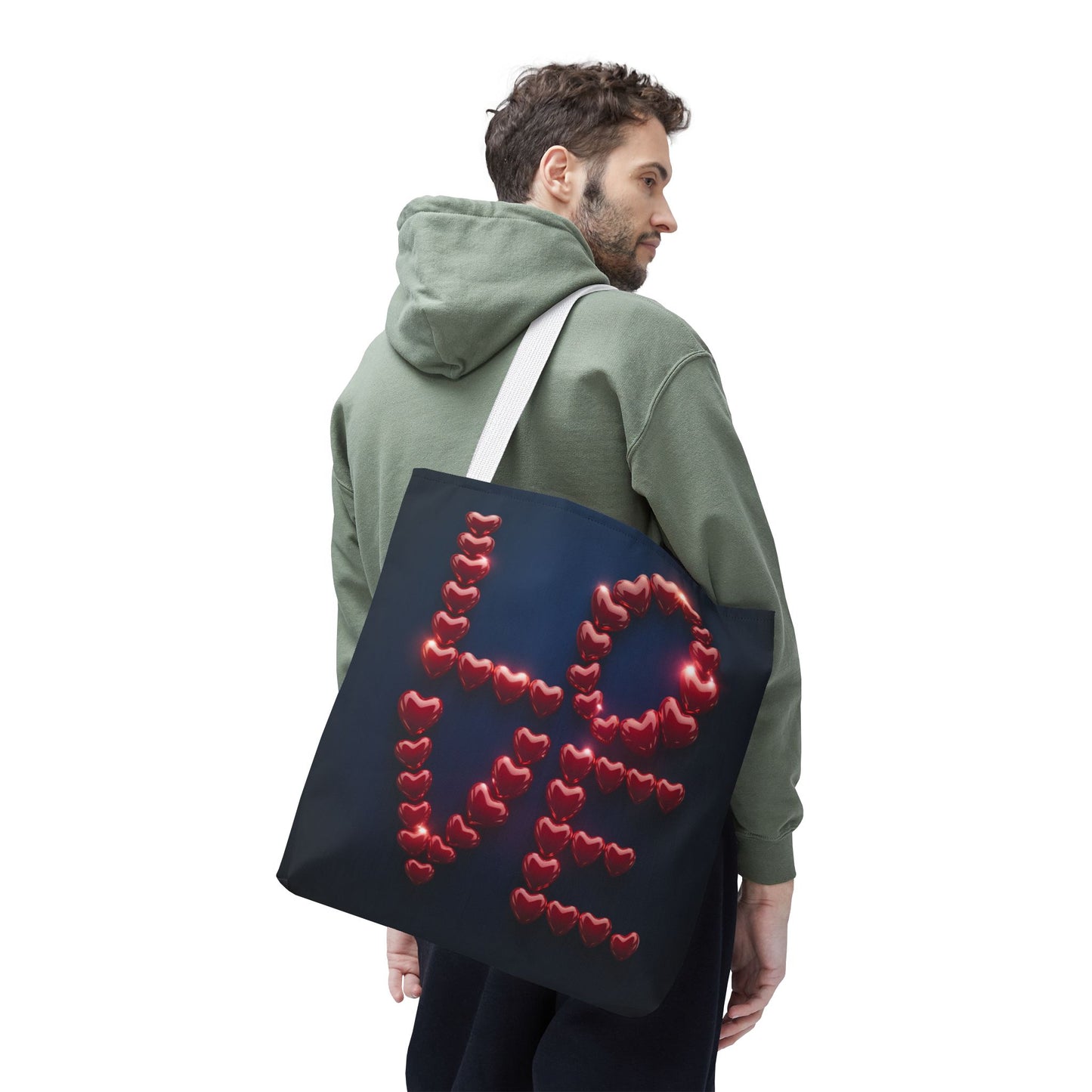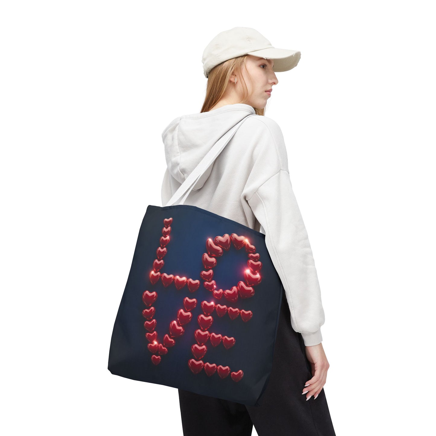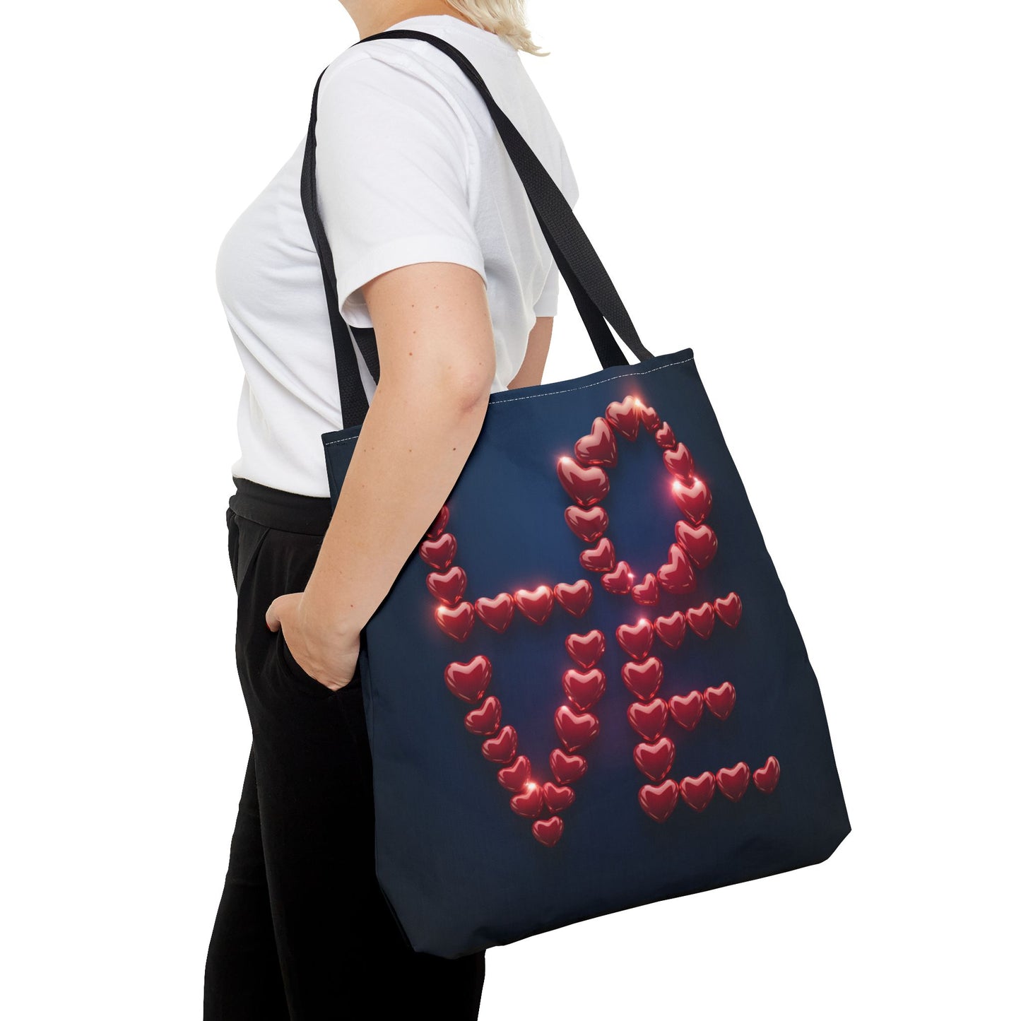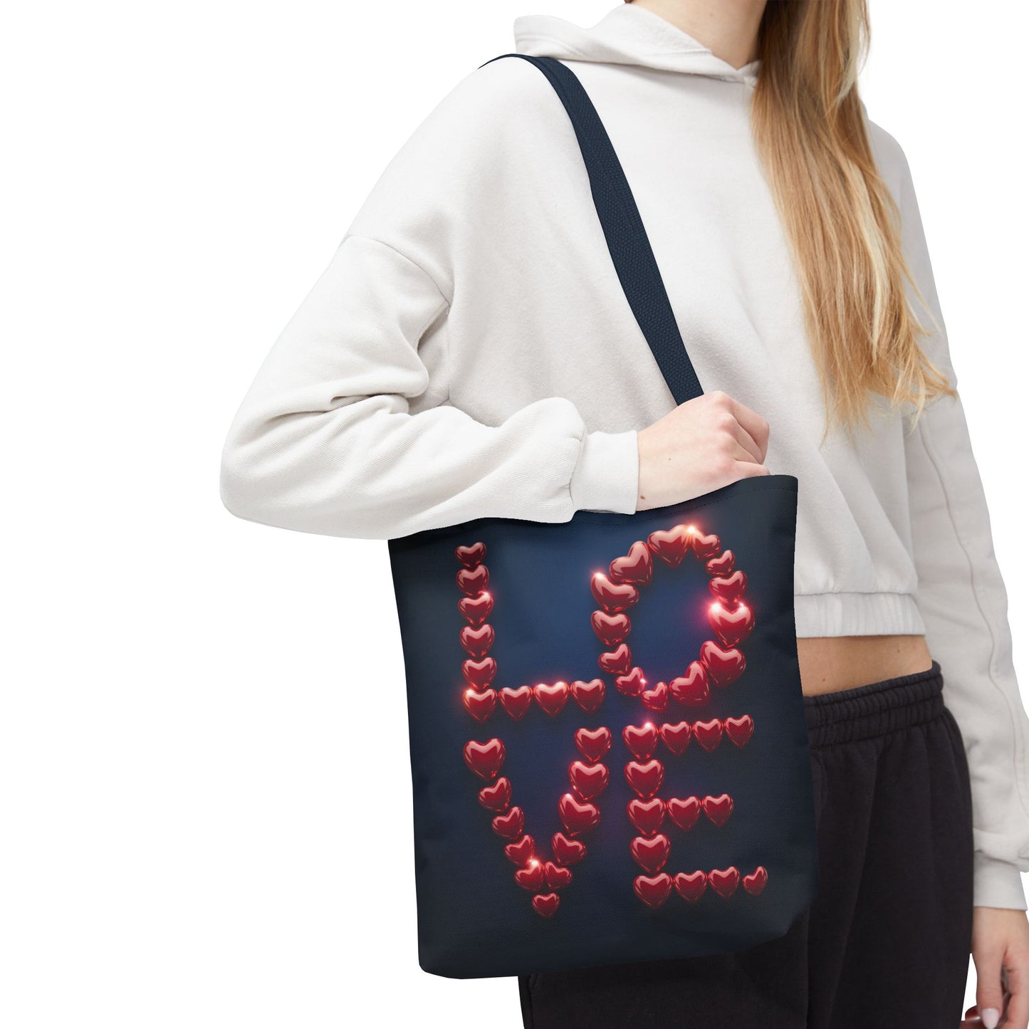 A fun tote bag with the word Love spelled out of hearts. This tote bag exudes a cheerful and loving vibe, making it a perfect accessory for everyday use or a thoughtful gift for someone special. Ideal for those who appreciate unique and eye-catching designs, suitable for Valentine's Day, birthdays, or just to spread love and positivity.