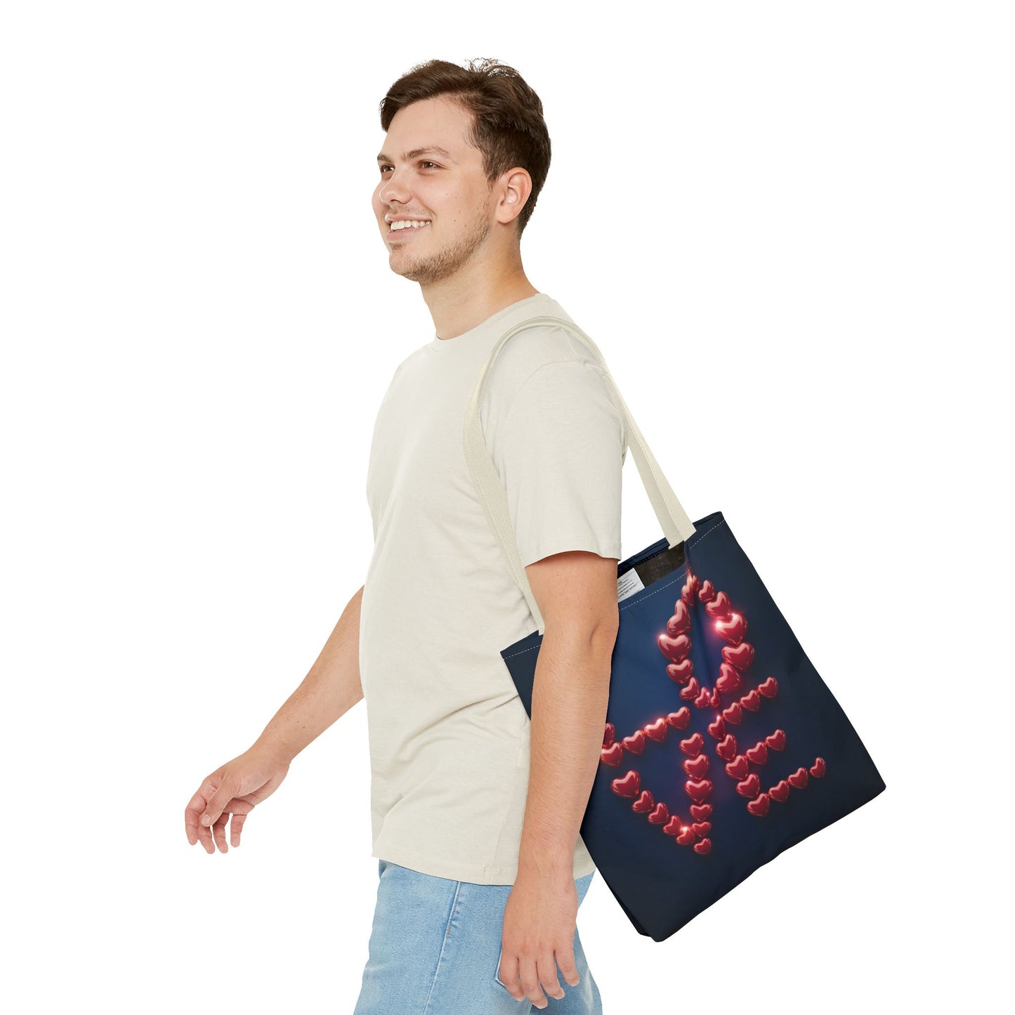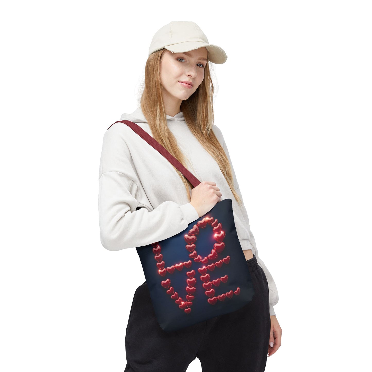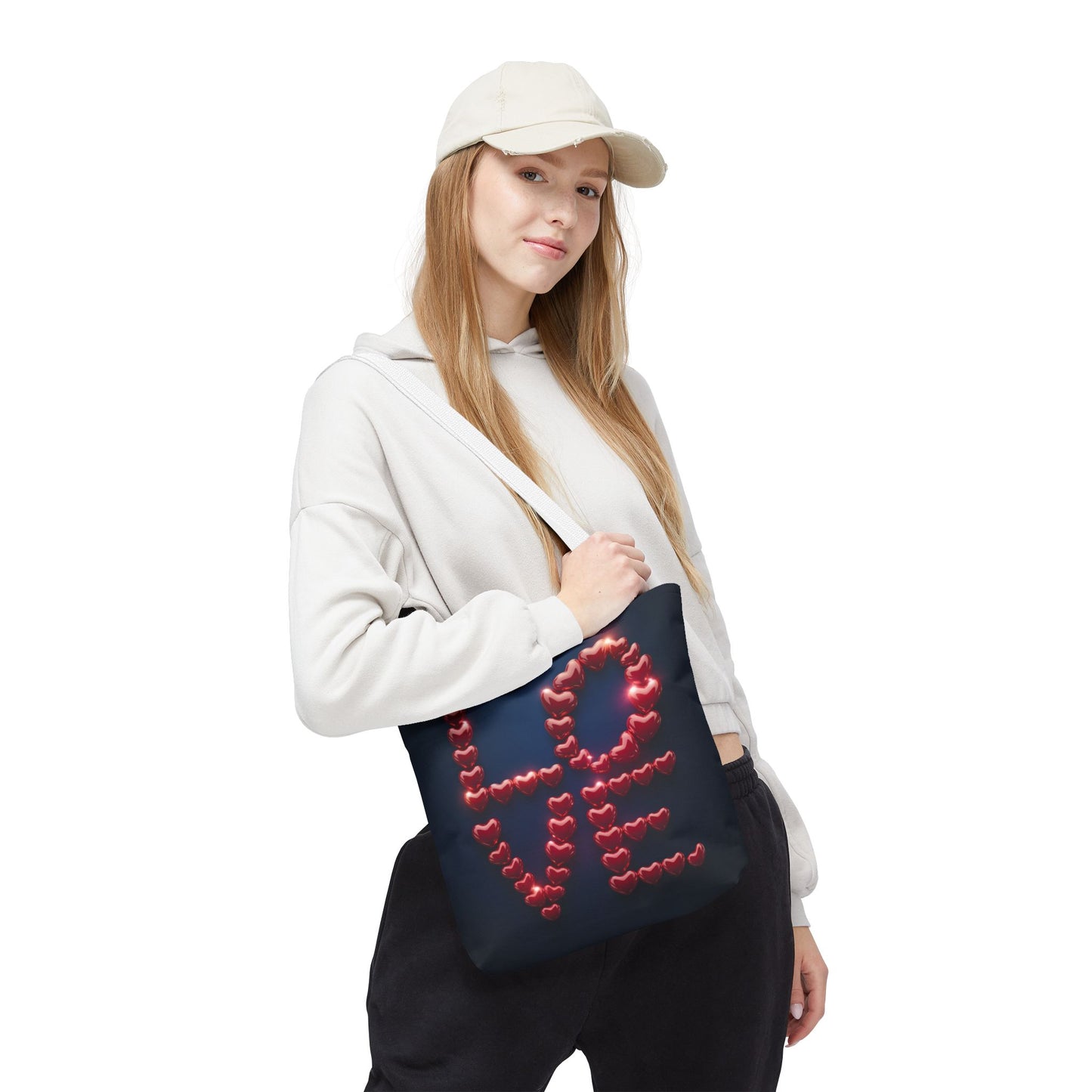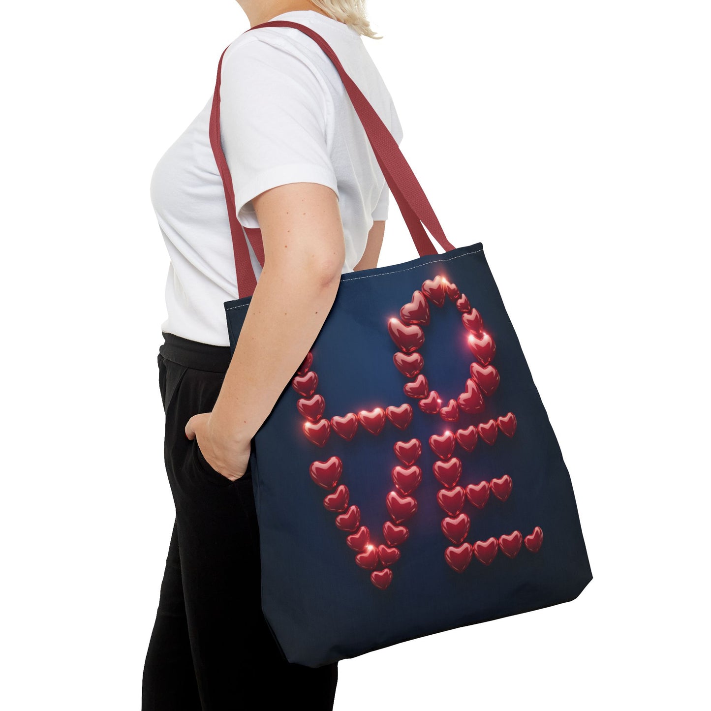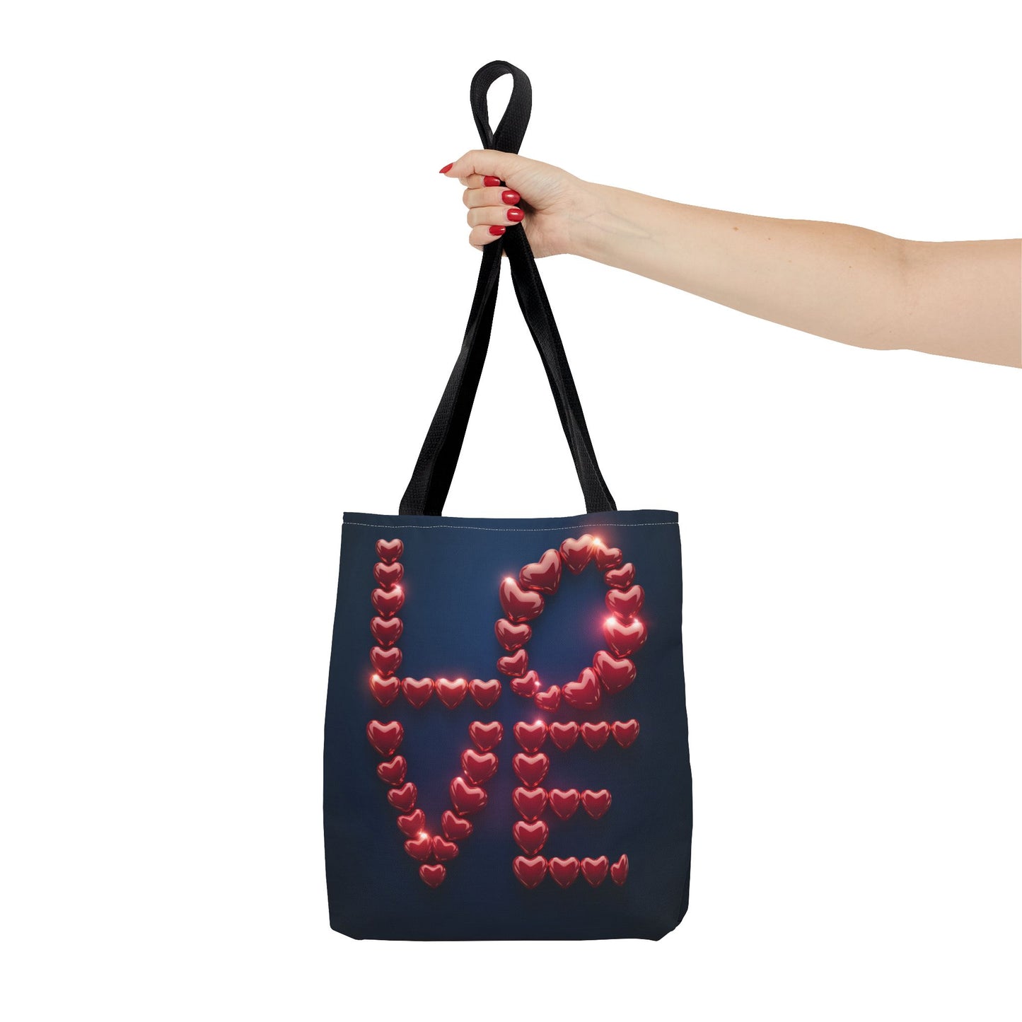 A fun tote bag with the word Love spelled out of hearts. This tote bag exudes a cheerful and loving vibe, making it a perfect accessory for everyday use or a thoughtful gift for someone special. Ideal for those who appreciate unique and eye-catching designs, suitable for Valentine's Day, birthdays, or just to spread love and positivity.