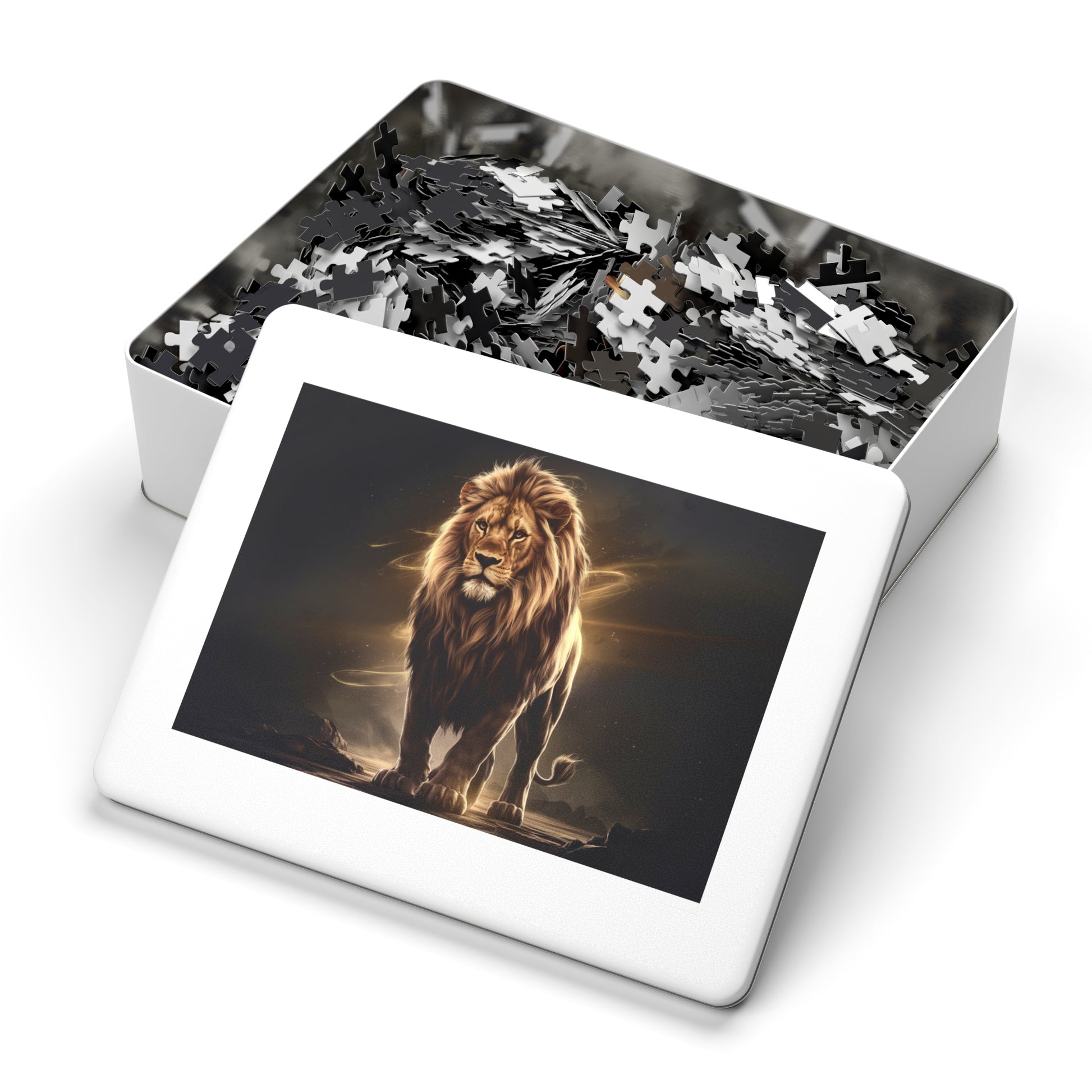 Unleash your inner courage and strength with our majestic "Golden Lion" jigsaw puzzle, featuring a regal lion radiating in a brilliant golden color. This stunning puzzle is perfect for puzzle enthusiasts of all ages and skill levels looking to challenge themselves and unwind.