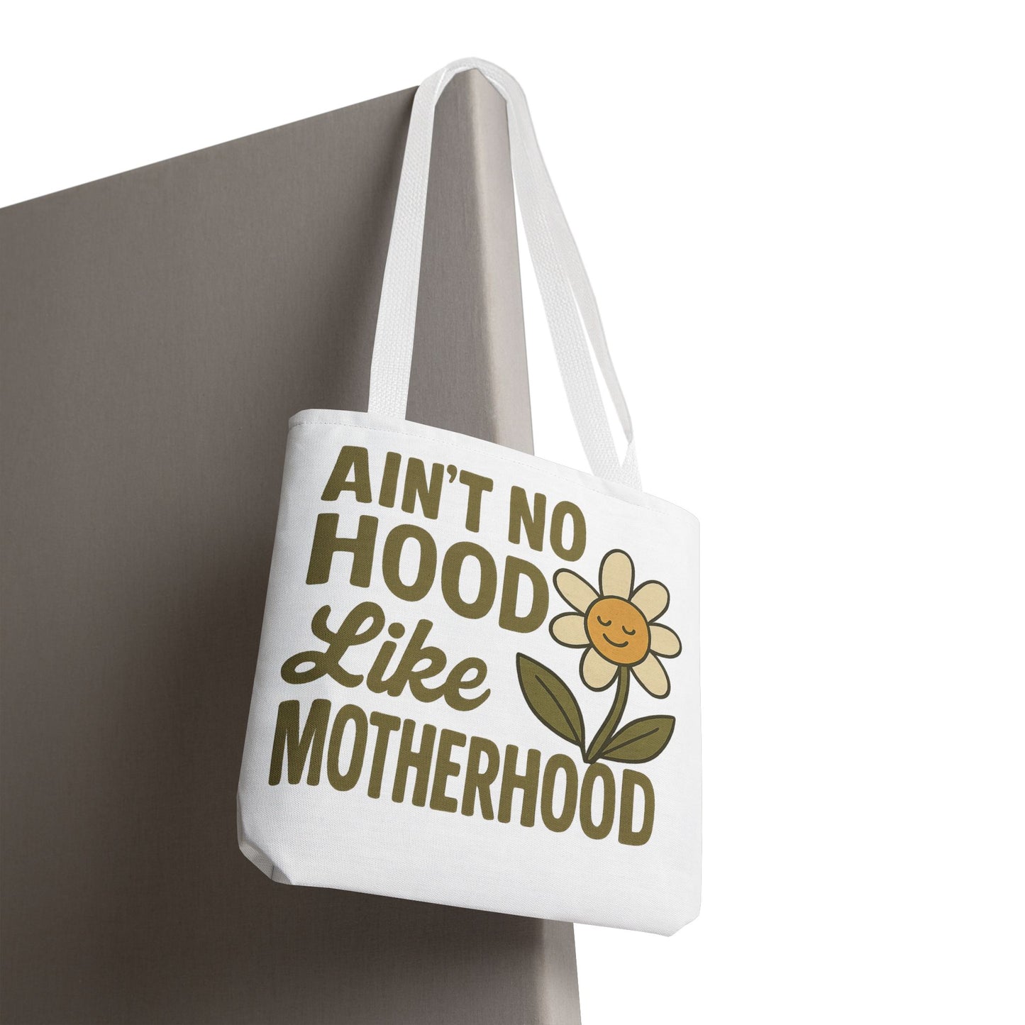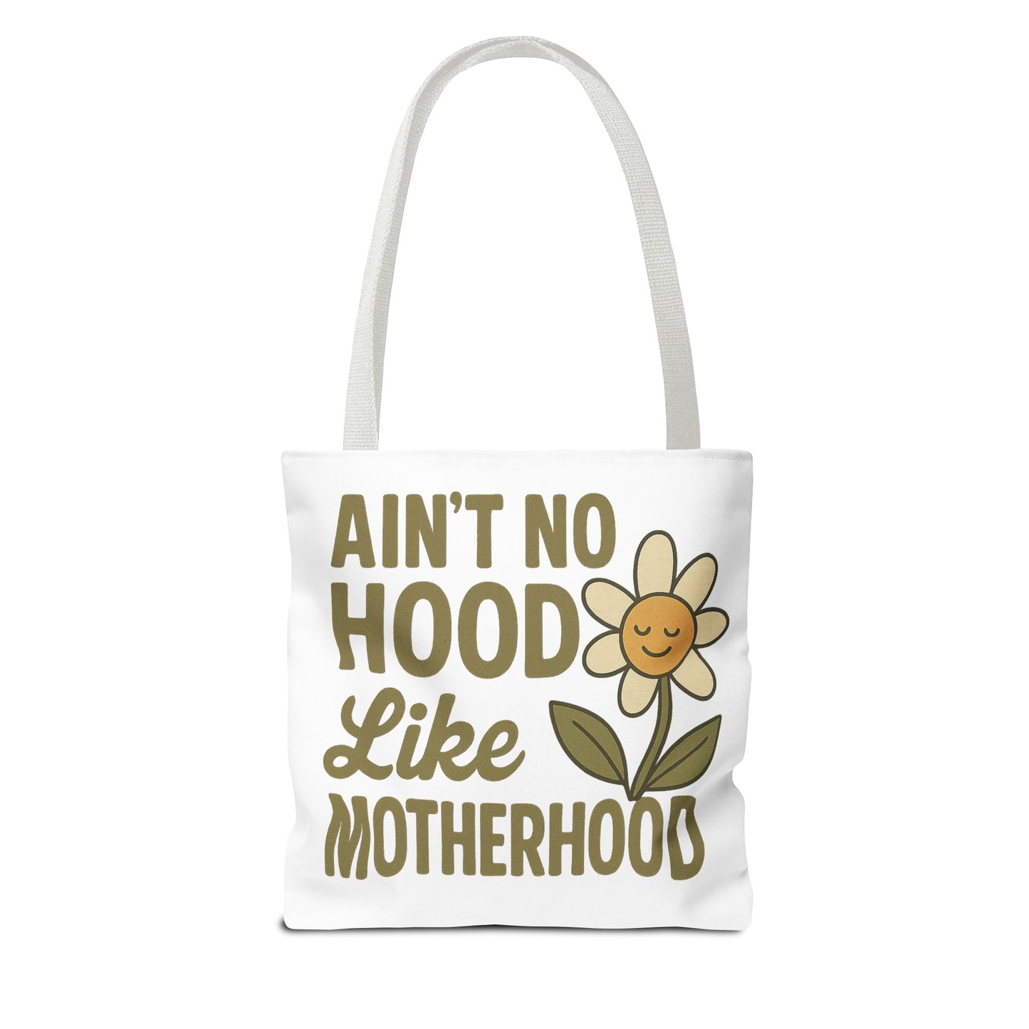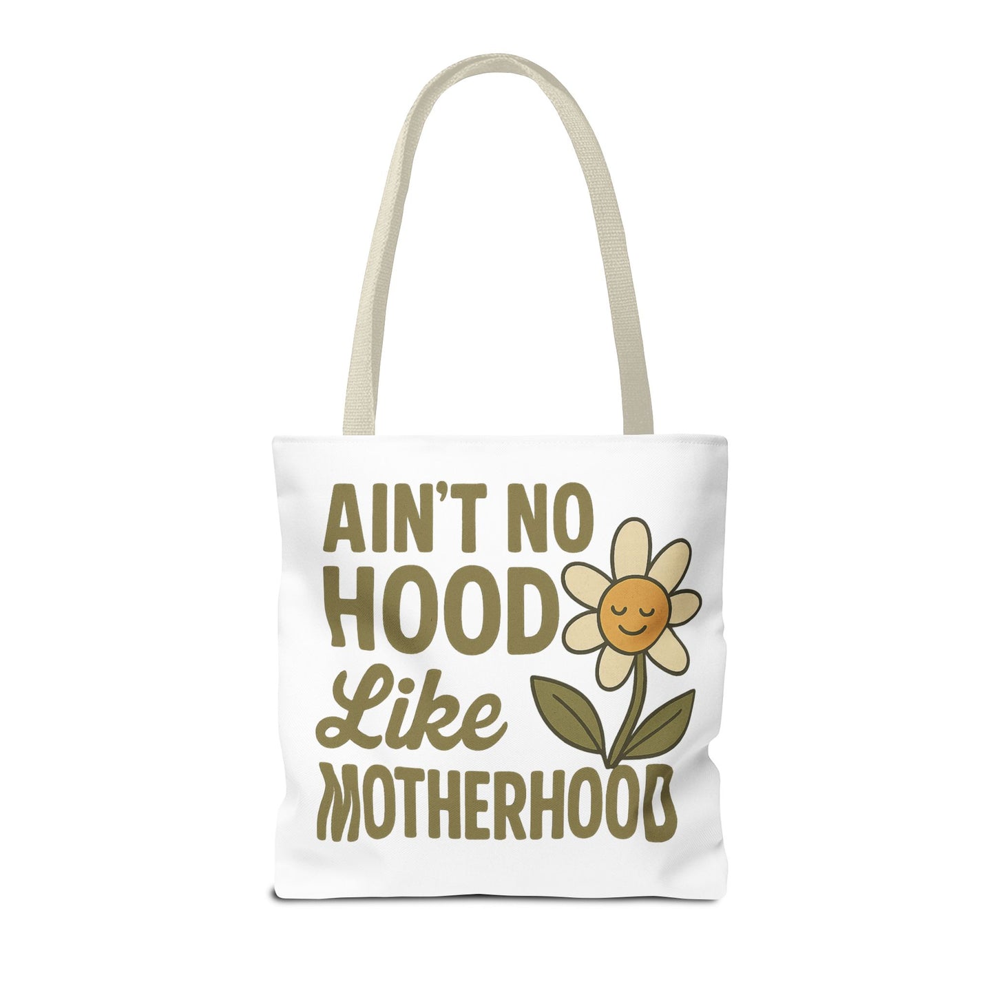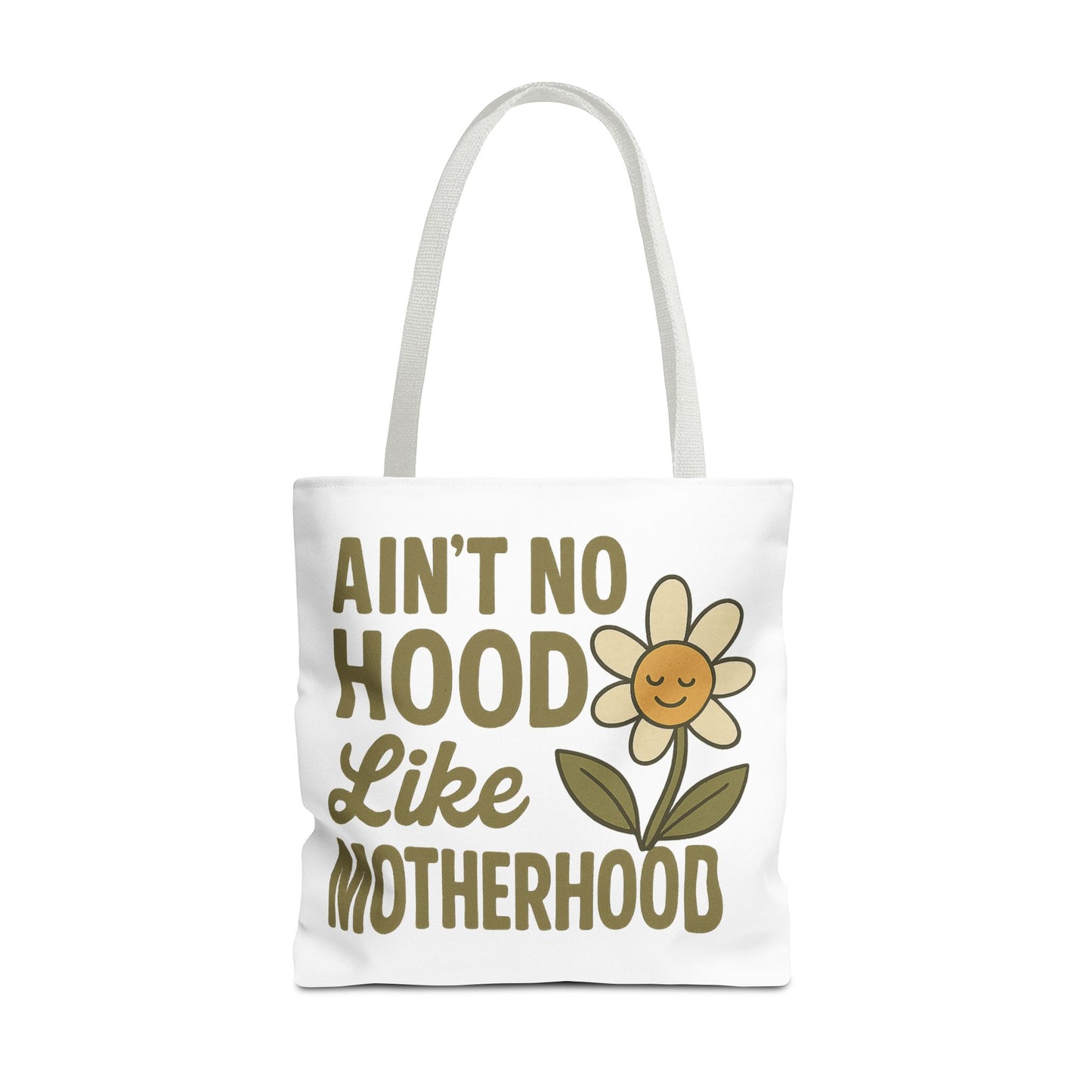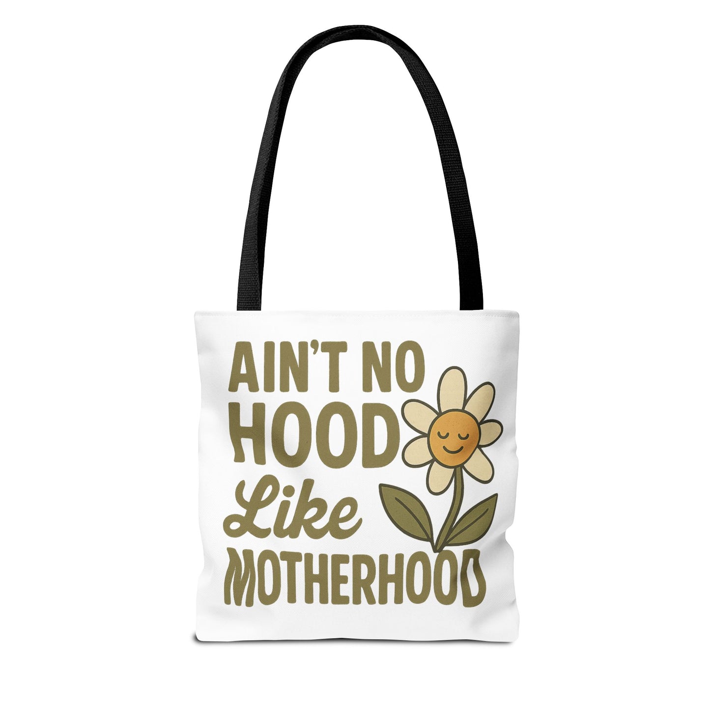 A fun tote bag with the statement "Ain't No Hood Like Motherhood" and a flower design, perfect for moms who want to showcase their love for motherhood. This tote bag is durable, versatile, and stylish, making it suitable for everyday use or as a thoughtful gift for Mother's Day.