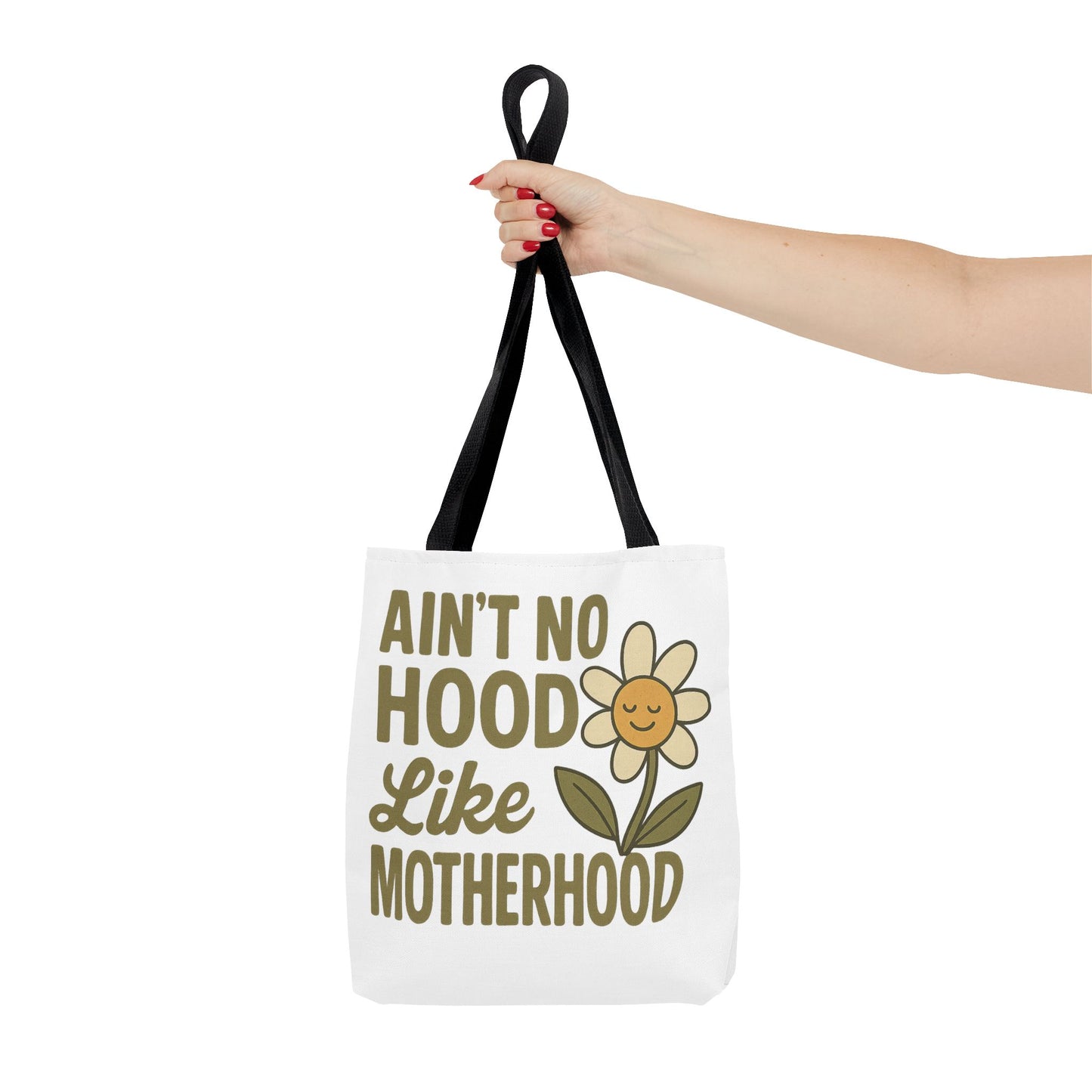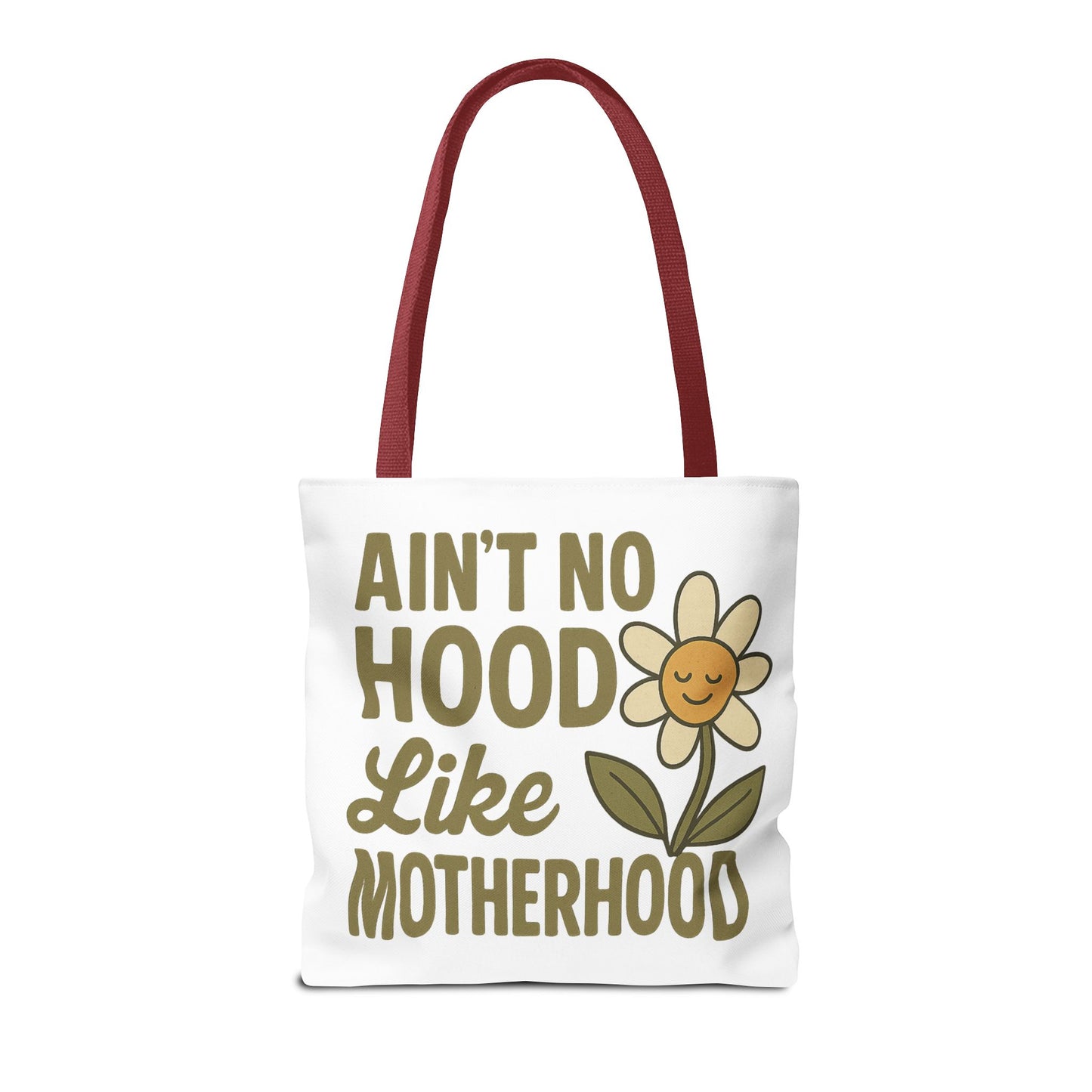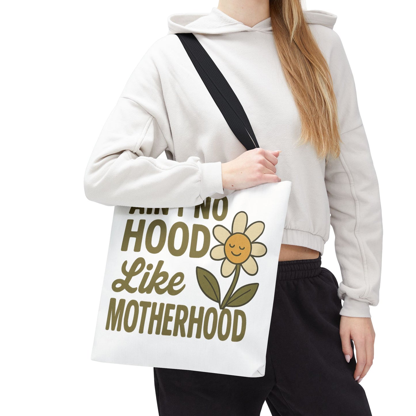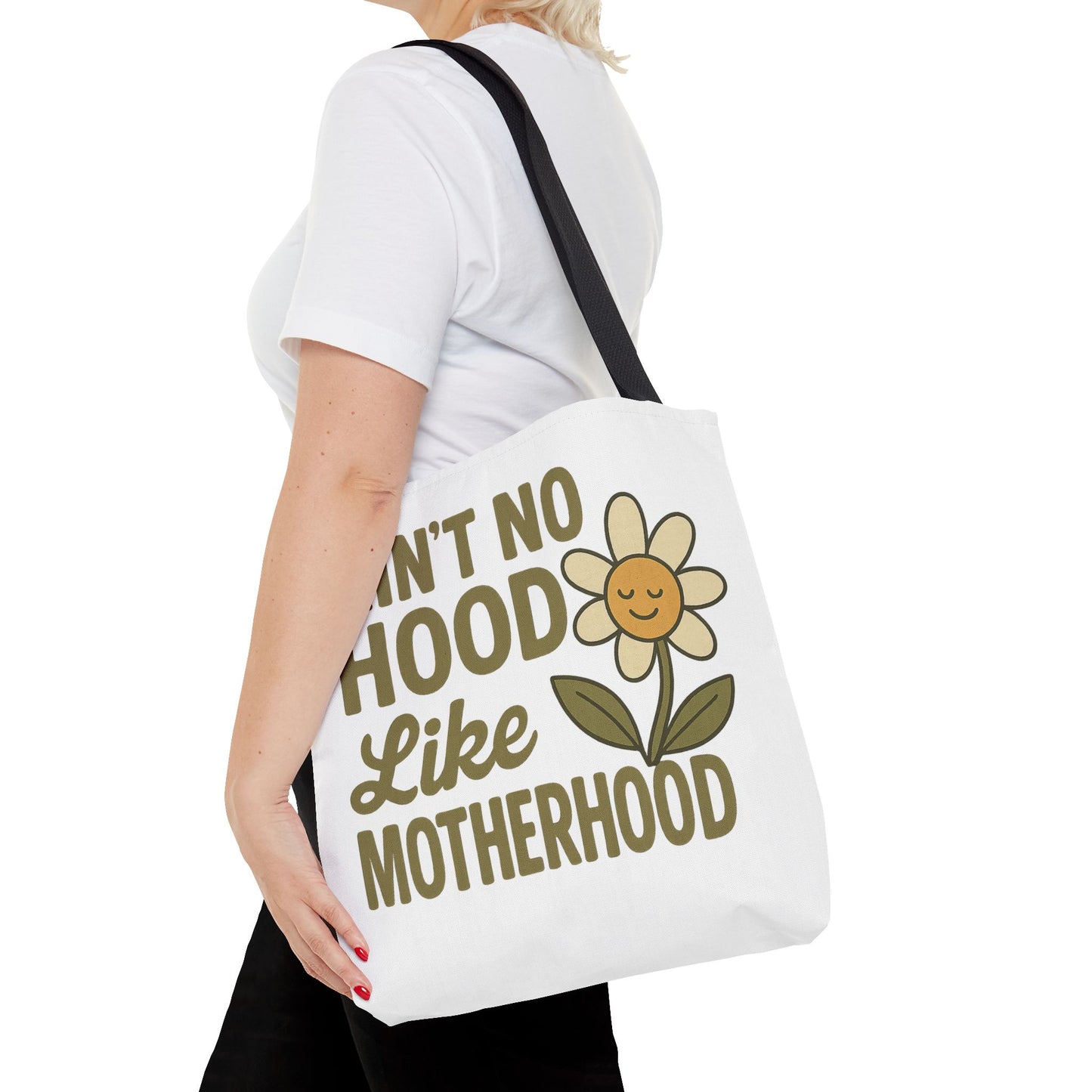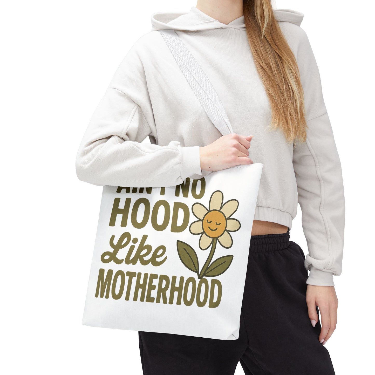 A fun tote bag with the statement "Ain't No Hood Like Motherhood" and a flower design, perfect for moms who want to showcase their love for motherhood. This tote bag is durable, versatile, and stylish, making it suitable for everyday use or as a thoughtful gift for Mother's Day.