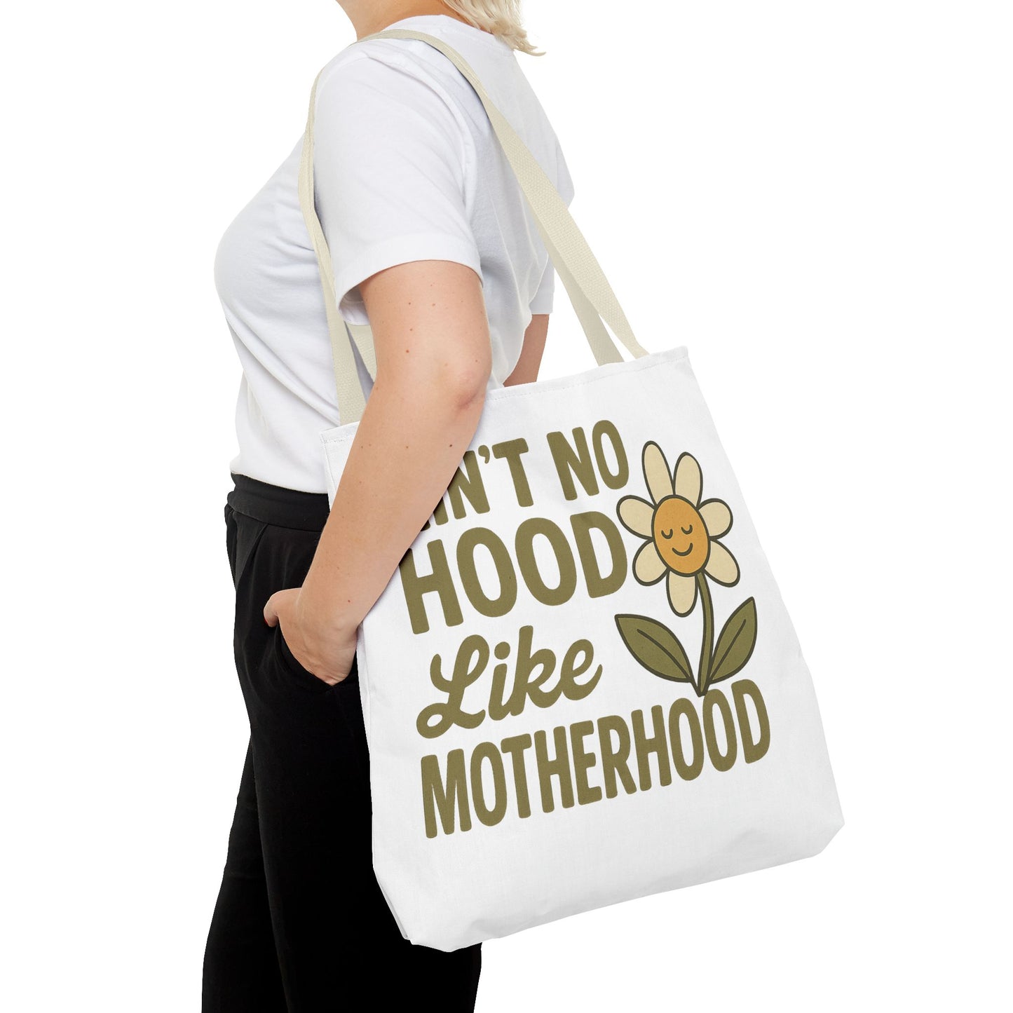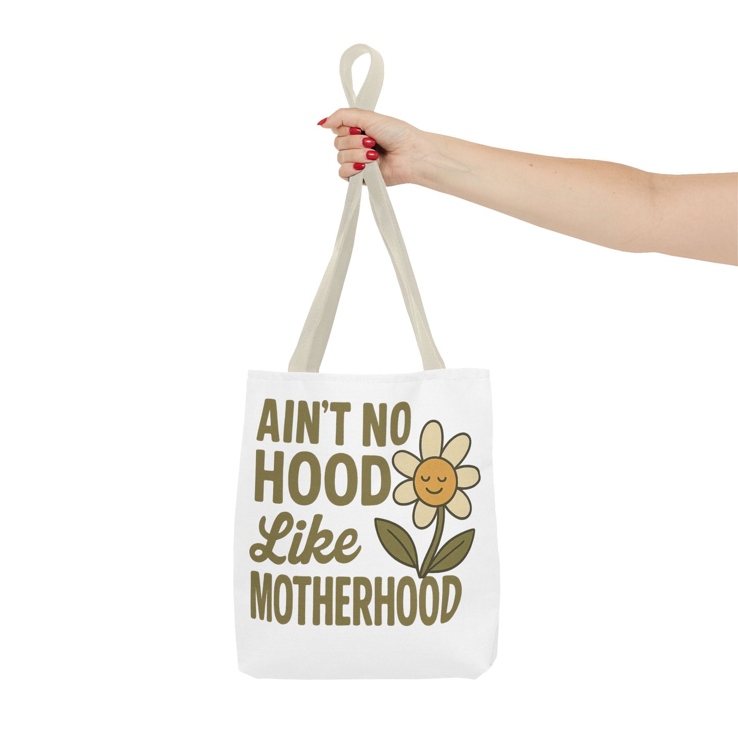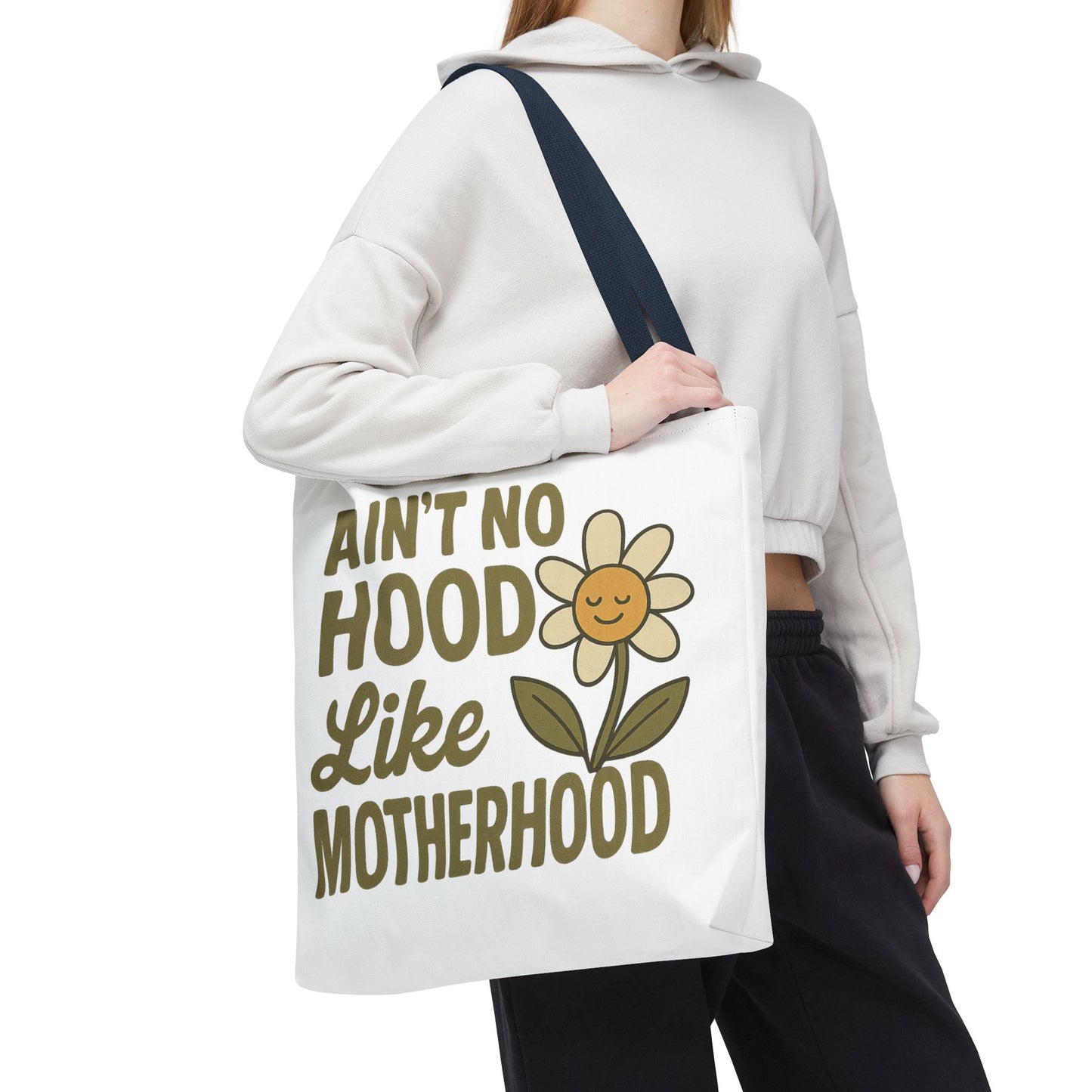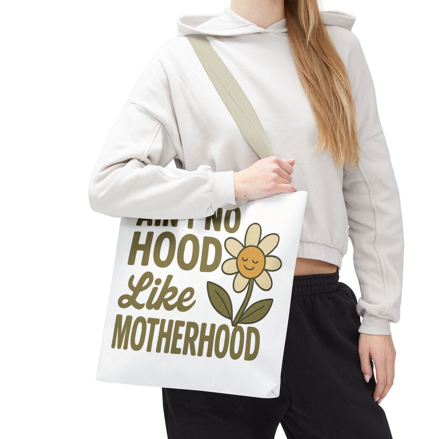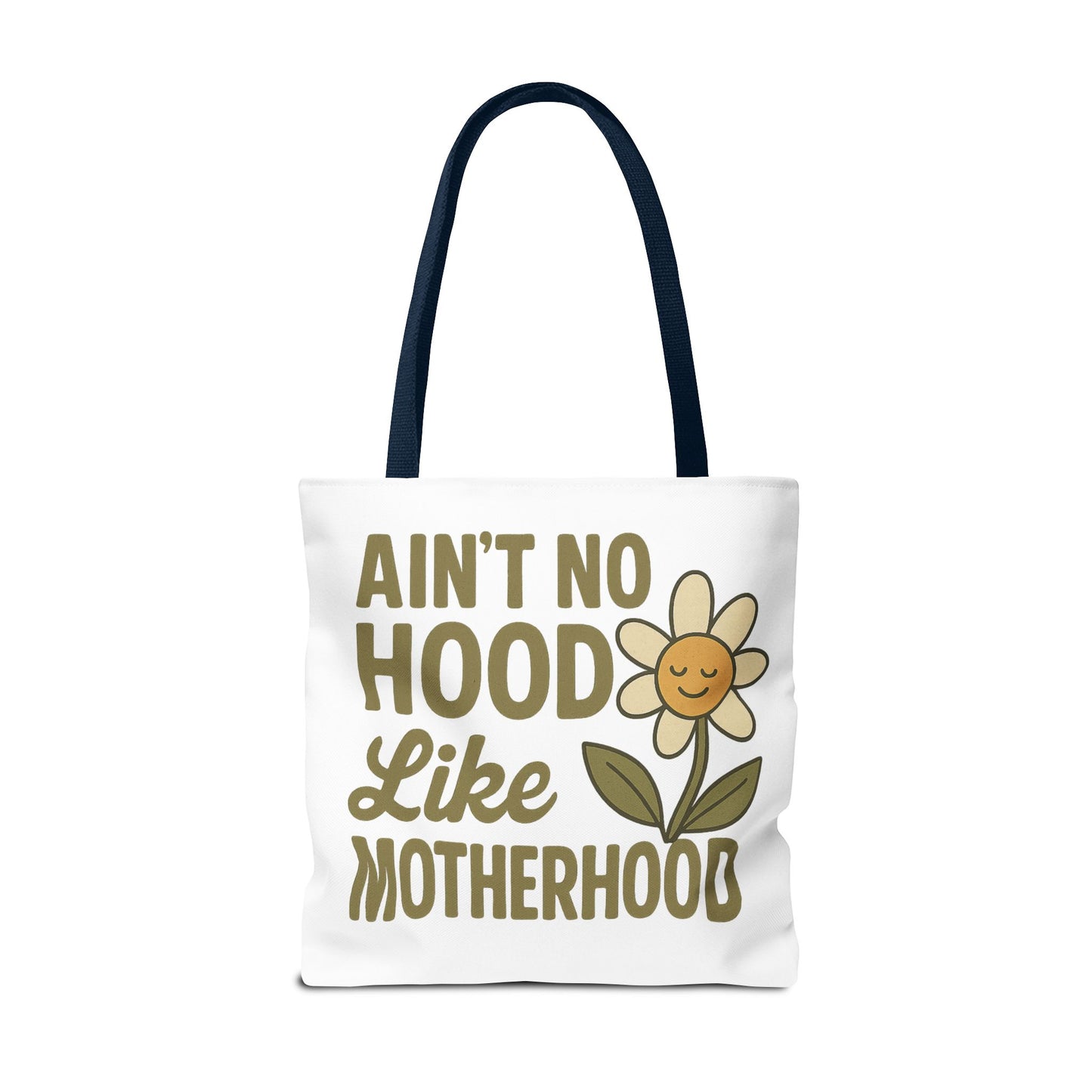 A fun tote bag with the statement "Ain't No Hood Like Motherhood" and a flower design, perfect for moms who want to showcase their love for motherhood. This tote bag is durable, versatile, and stylish, making it suitable for everyday use or as a thoughtful gift for Mother's Day.