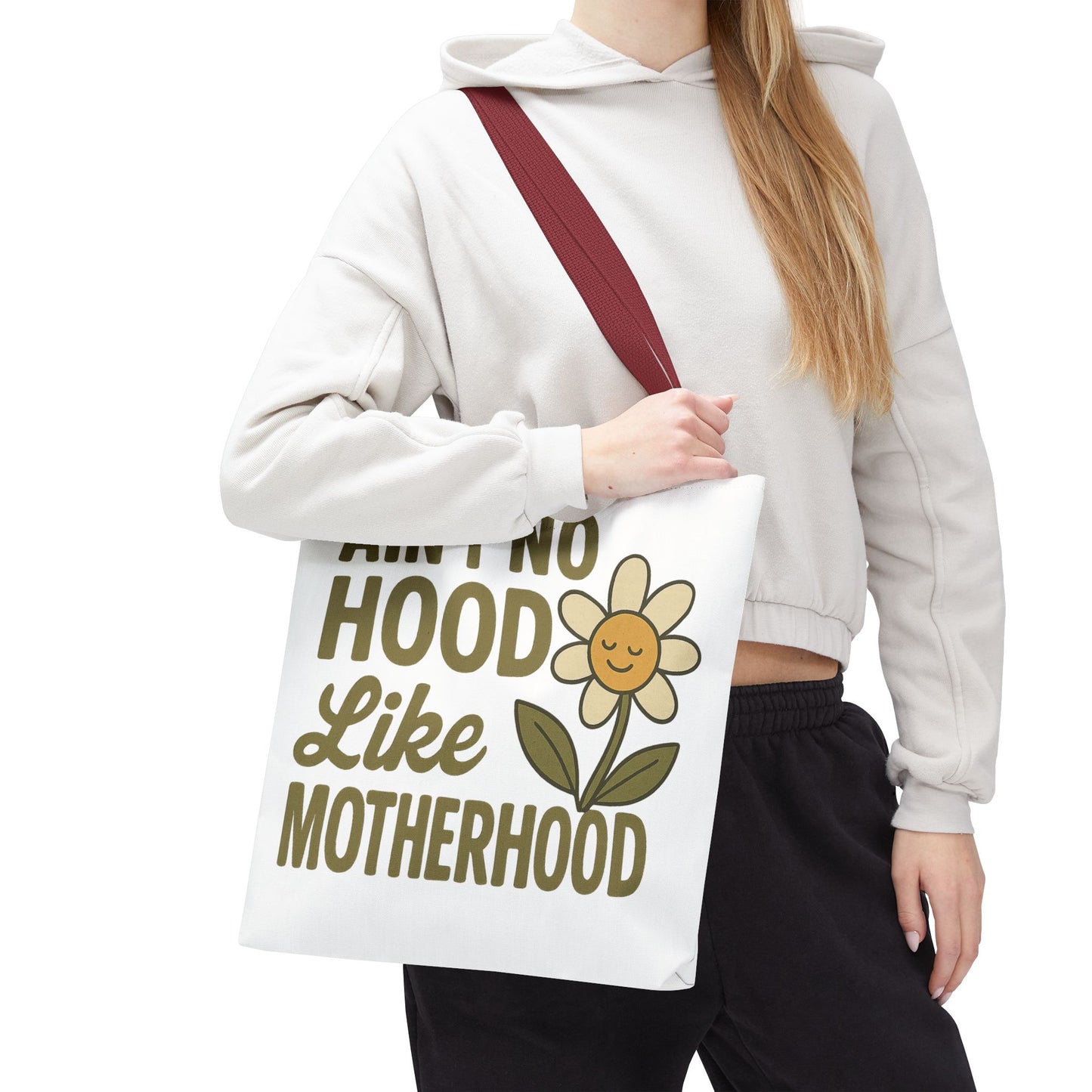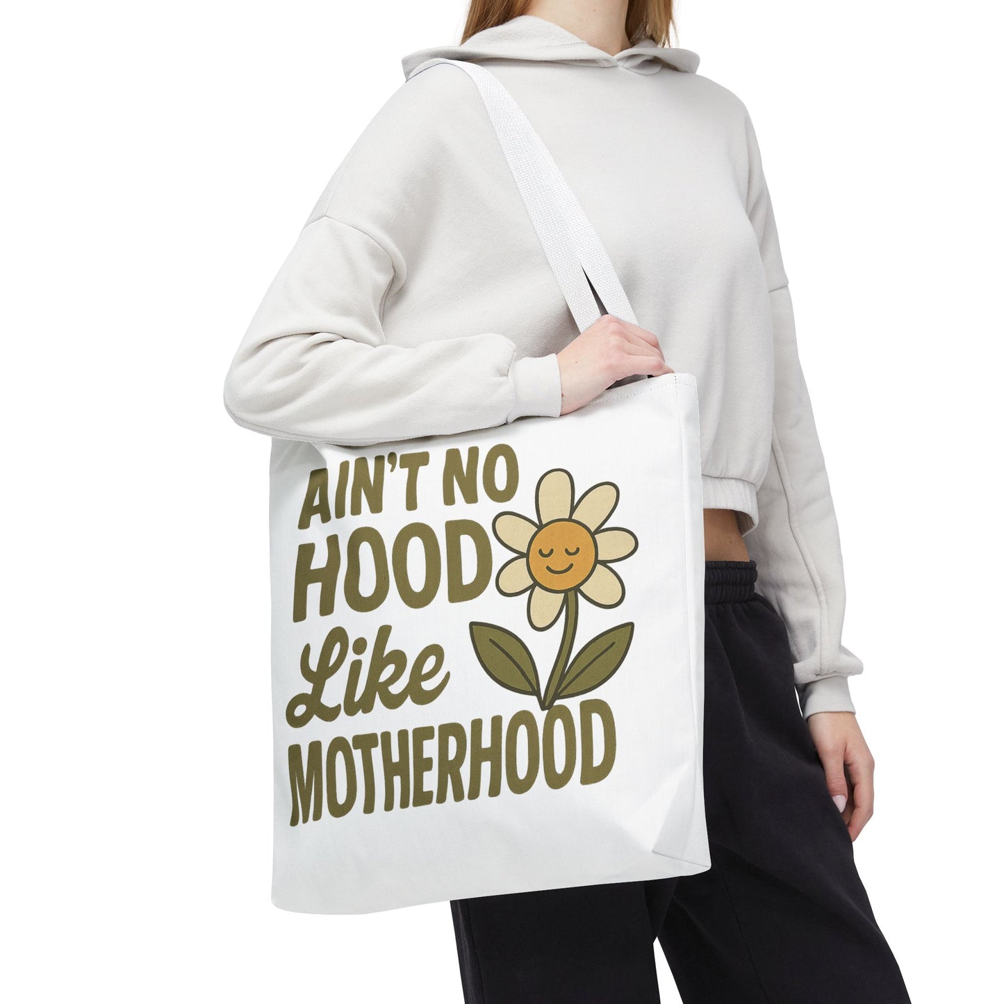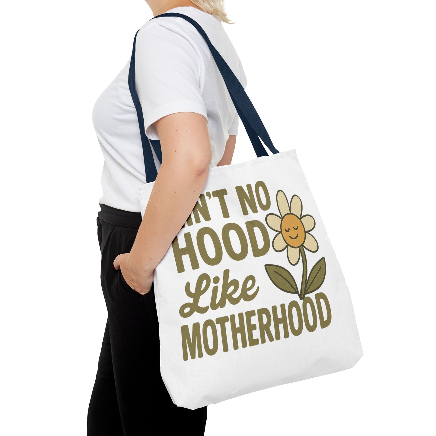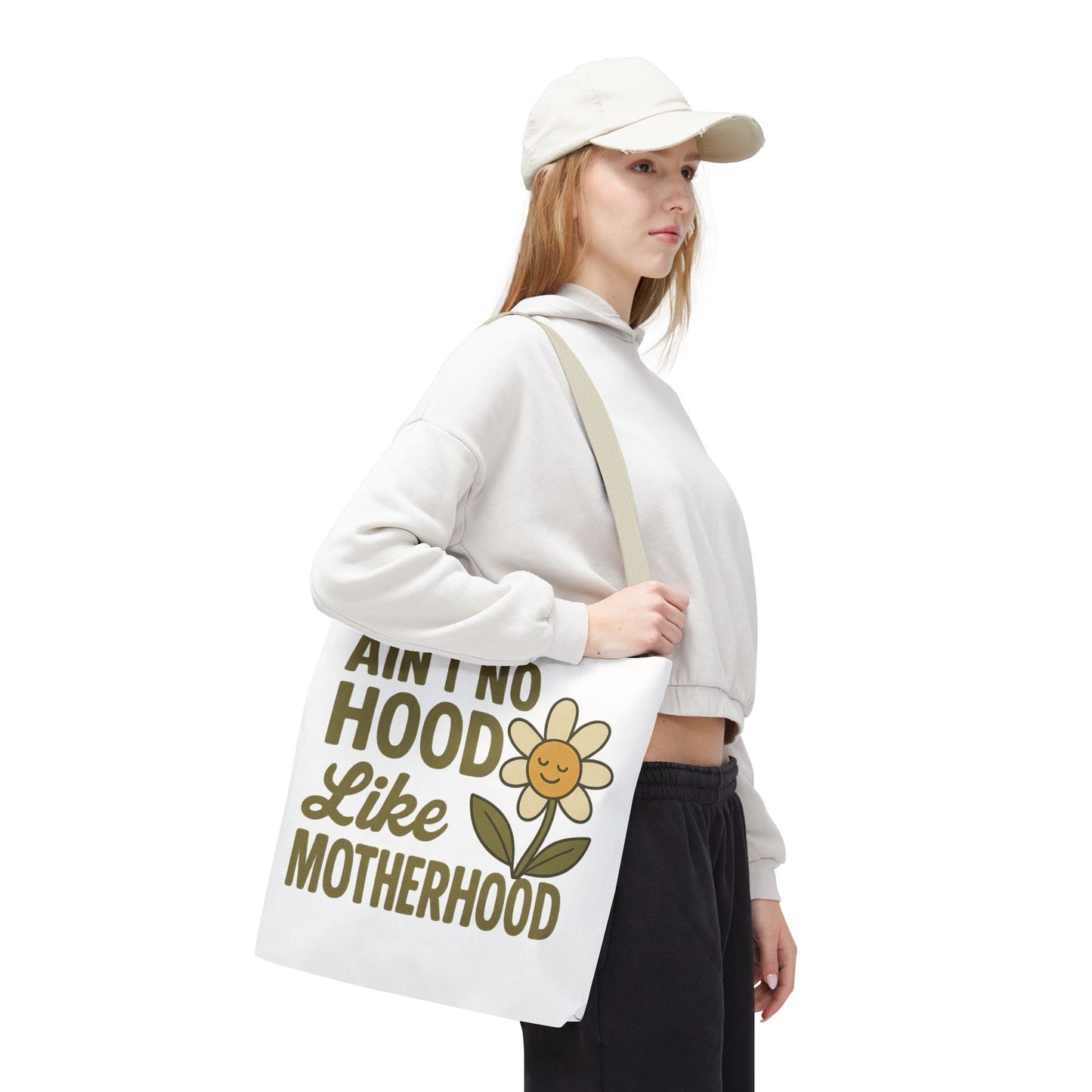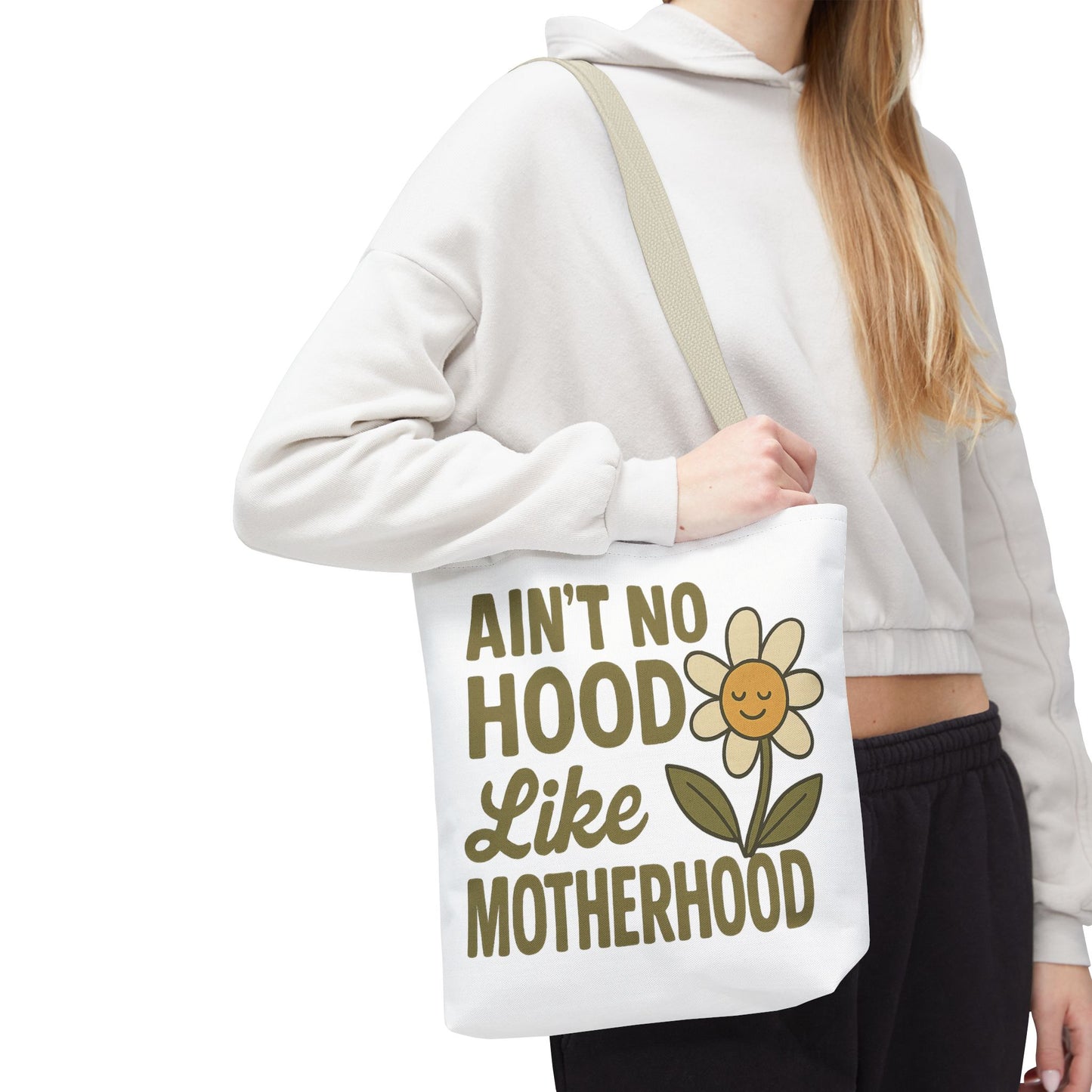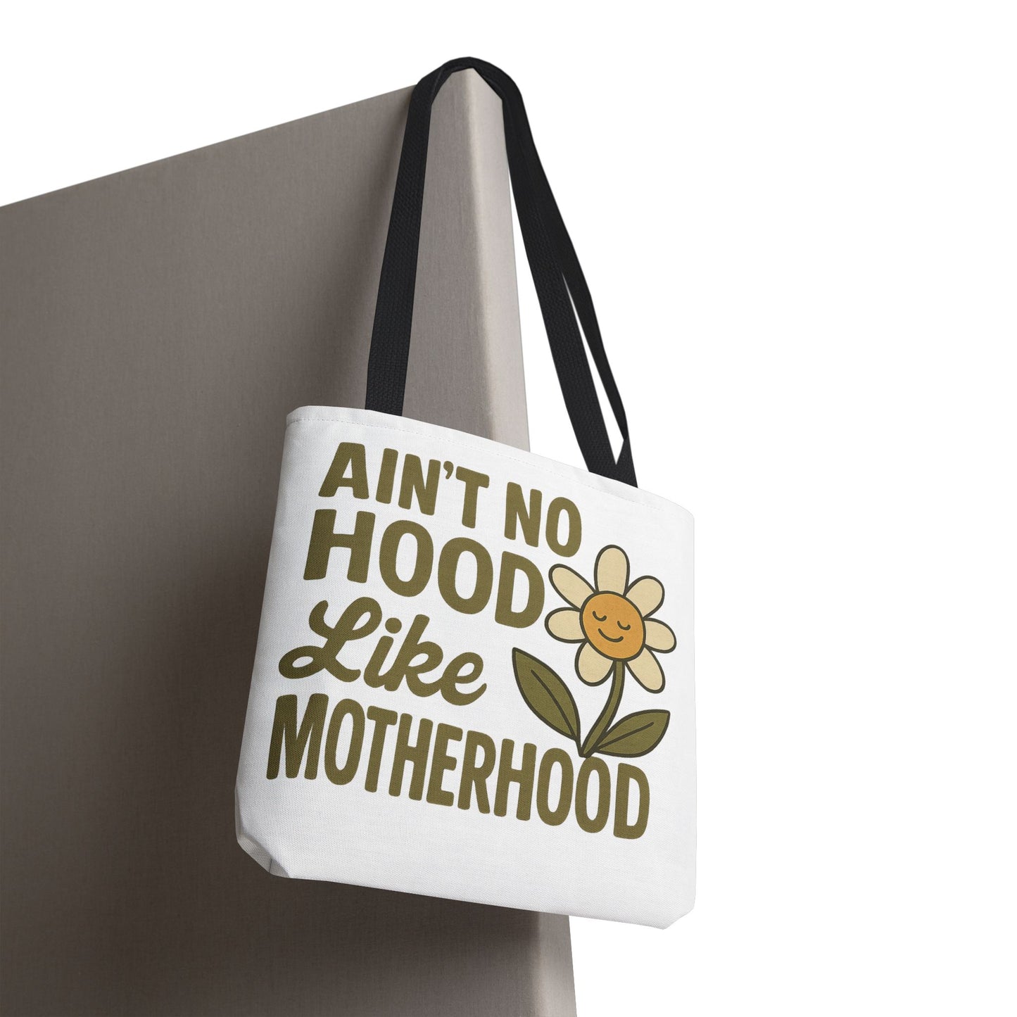 A fun tote bag with the statement "Ain't No Hood Like Motherhood" and a flower design, perfect for moms who want to showcase their love for motherhood. This tote bag is durable, versatile, and stylish, making it suitable for everyday use or as a thoughtful gift for Mother's Day.