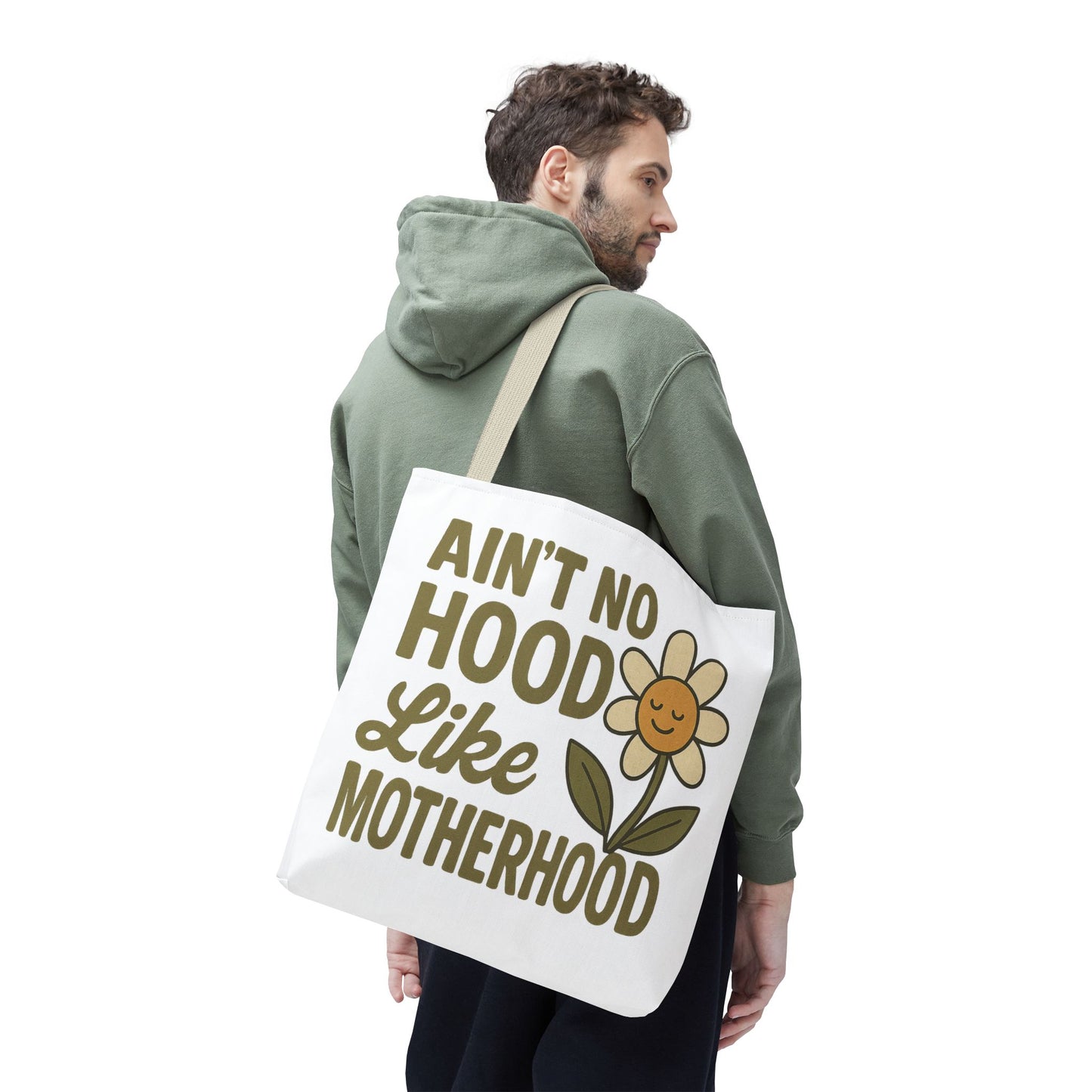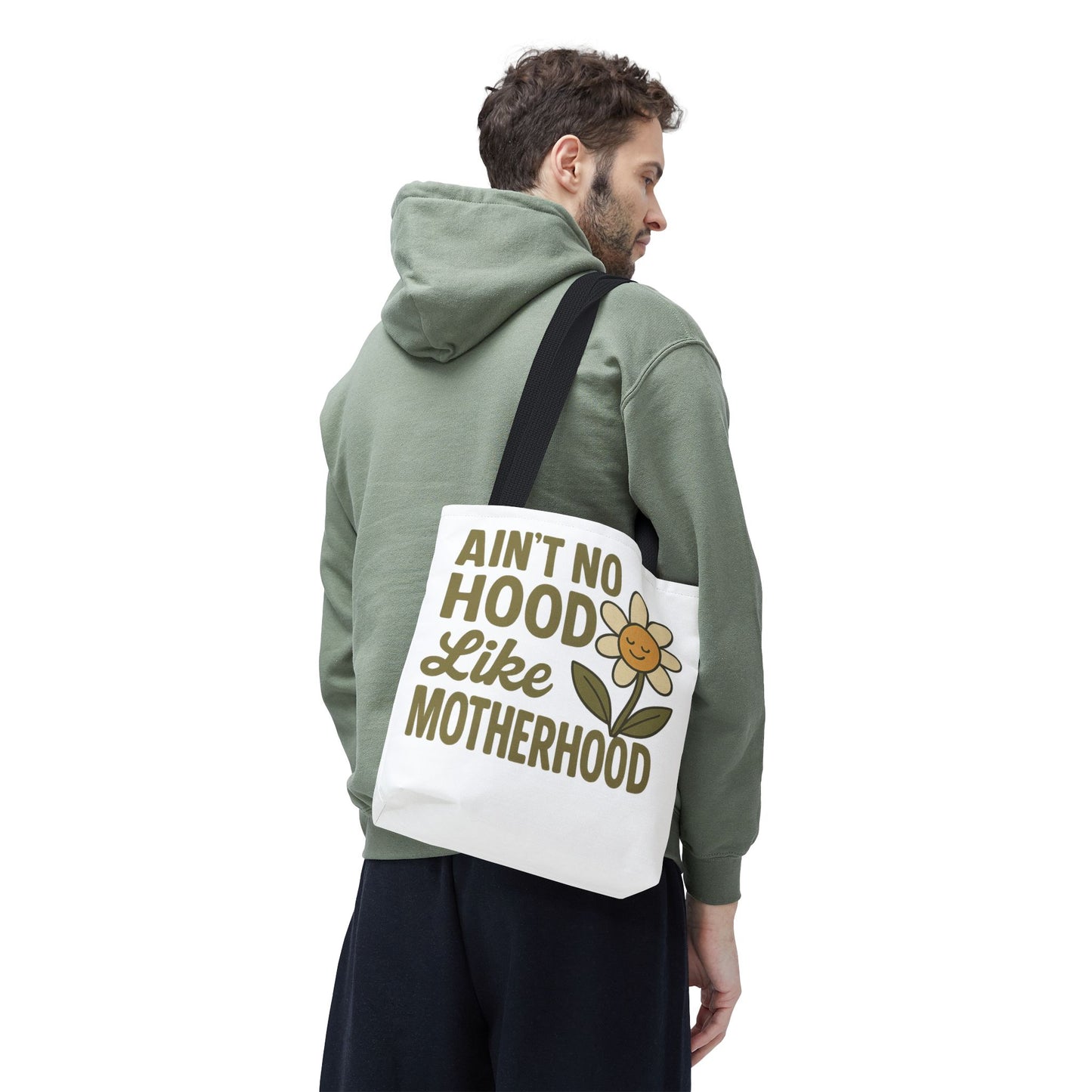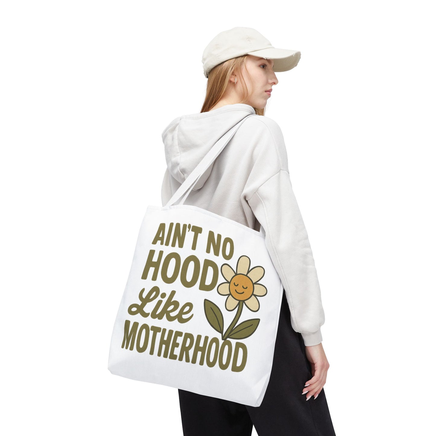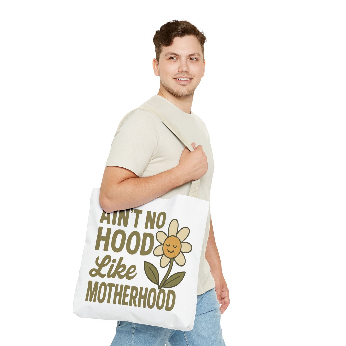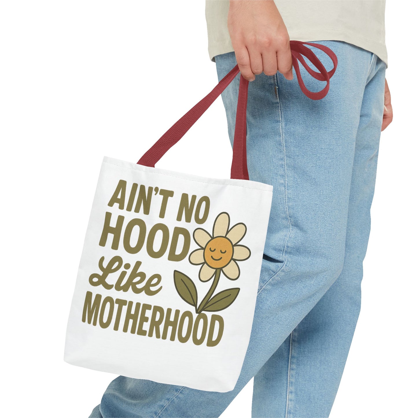 A fun tote bag with the statement "Ain't No Hood Like Motherhood" and a flower design, perfect for moms who want to showcase their love for motherhood. This tote bag is durable, versatile, and stylish, making it suitable for everyday use or as a thoughtful gift for Mother's Day.