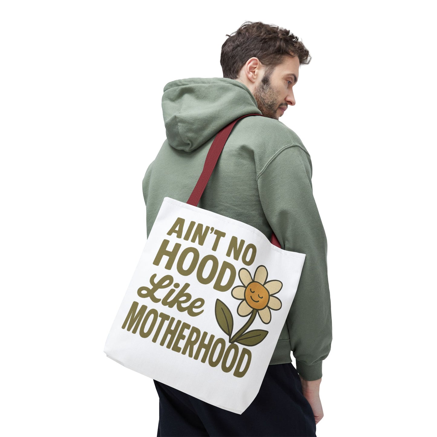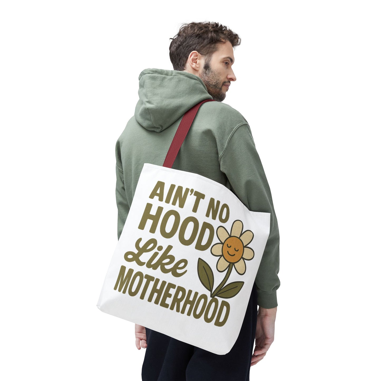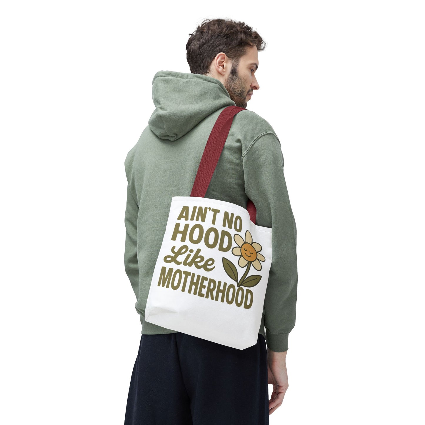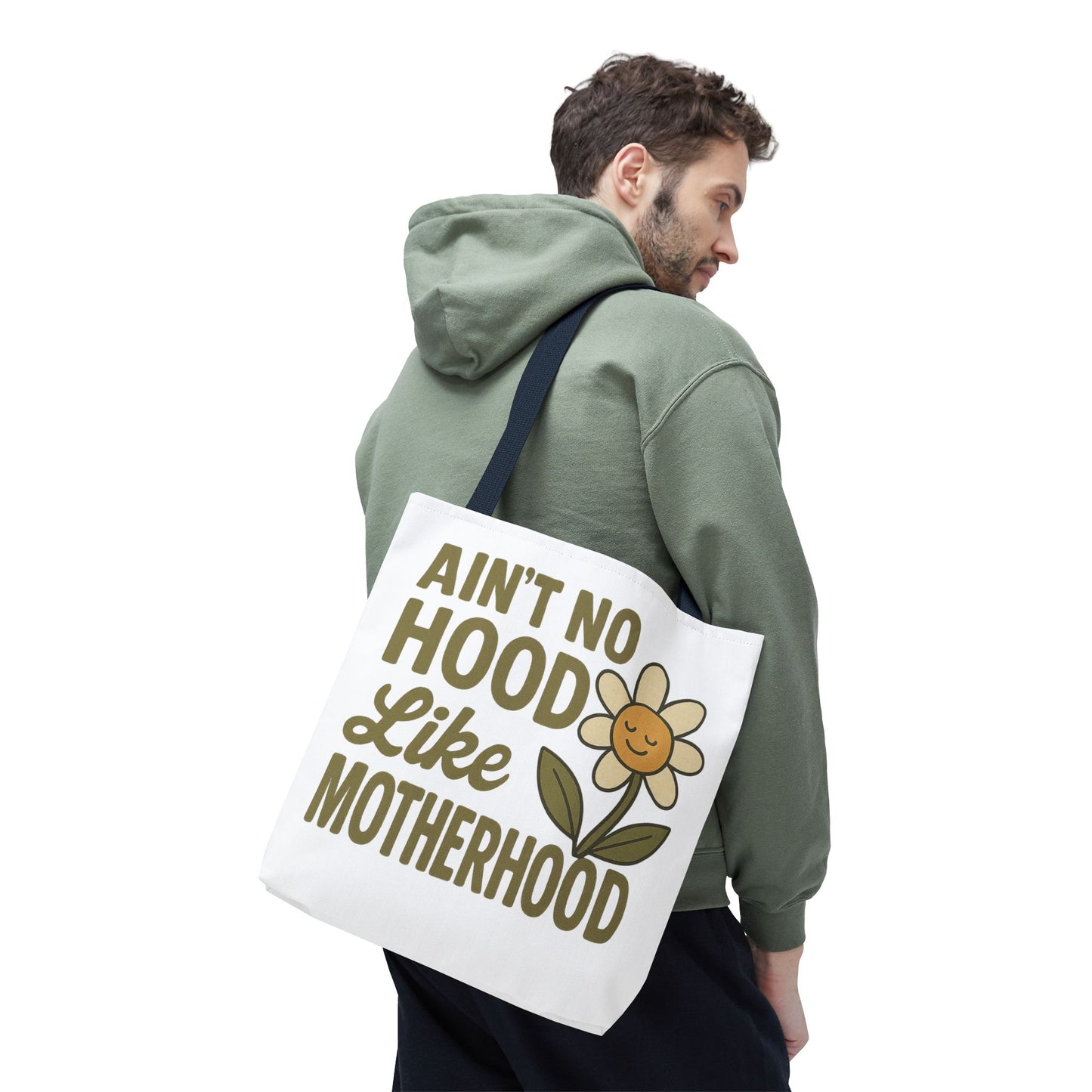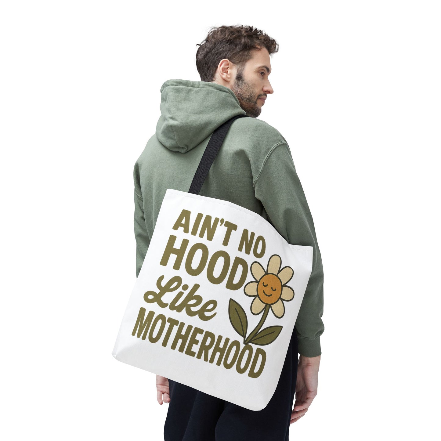 A fun tote bag with the statement "Ain't No Hood Like Motherhood" and a flower design, perfect for moms who want to showcase their love for motherhood. This tote bag is durable, versatile, and stylish, making it suitable for everyday use or as a thoughtful gift for Mother's Day.