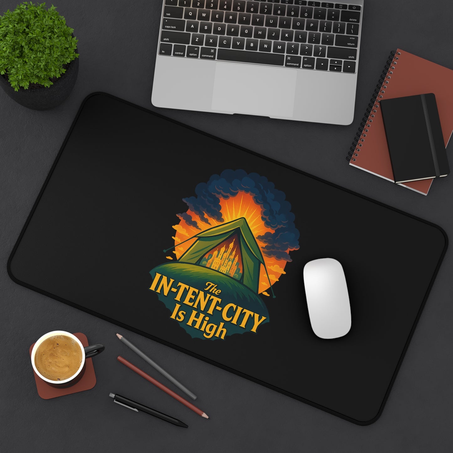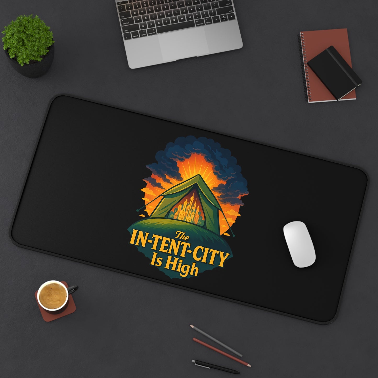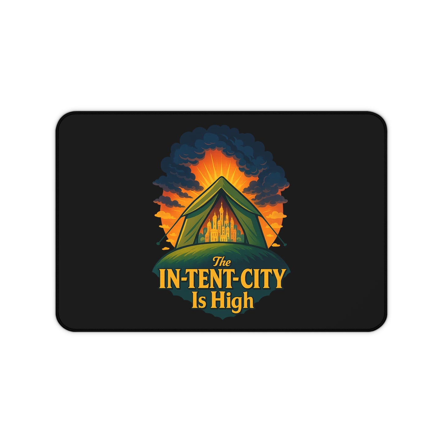 A fun Desk Mat with a city within a tent high on a hill that states 'The In-Tent-City Is High'. This quirky design adds a playful touch to your workspace, creating a fun and laid-back atmosphere. Perfect for those who enjoy unique and whimsical decor. Ideal for gifting on birthdays, holidays, or as a back-to-school present.