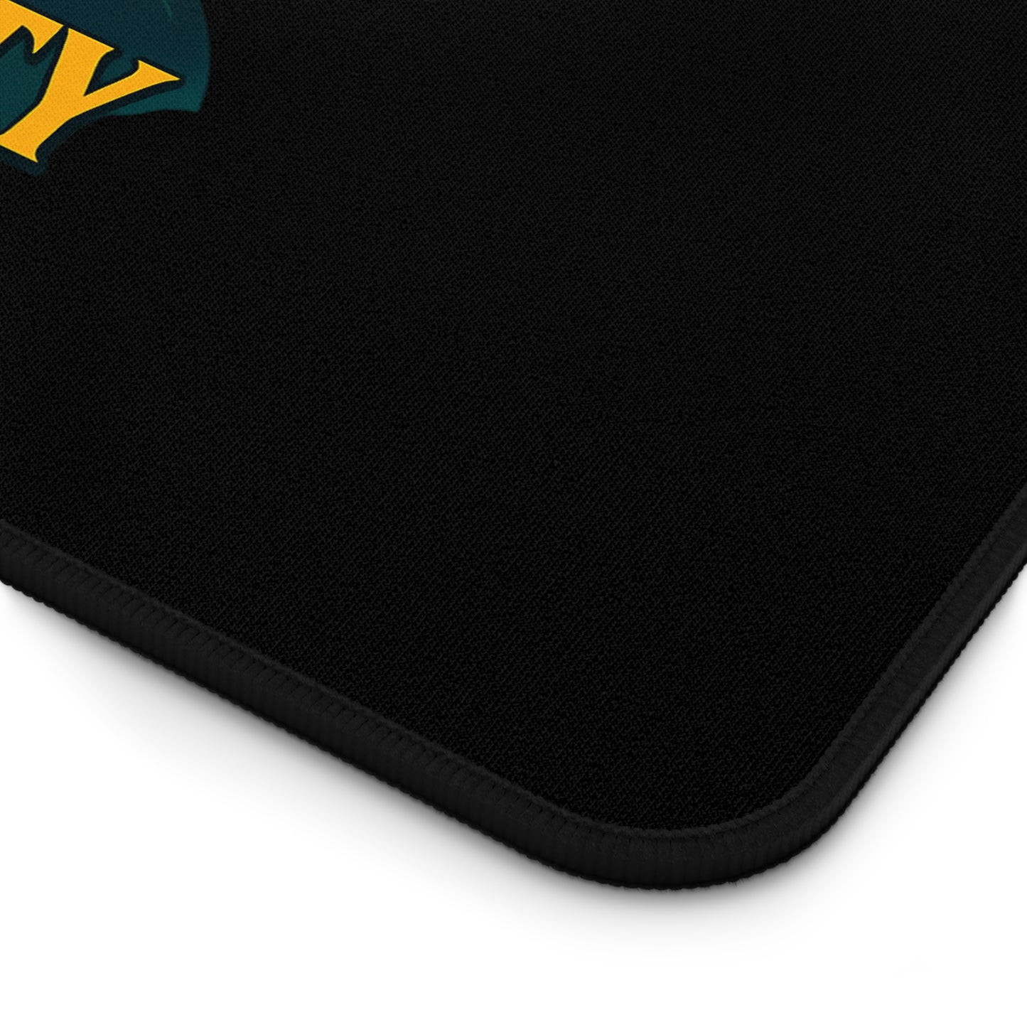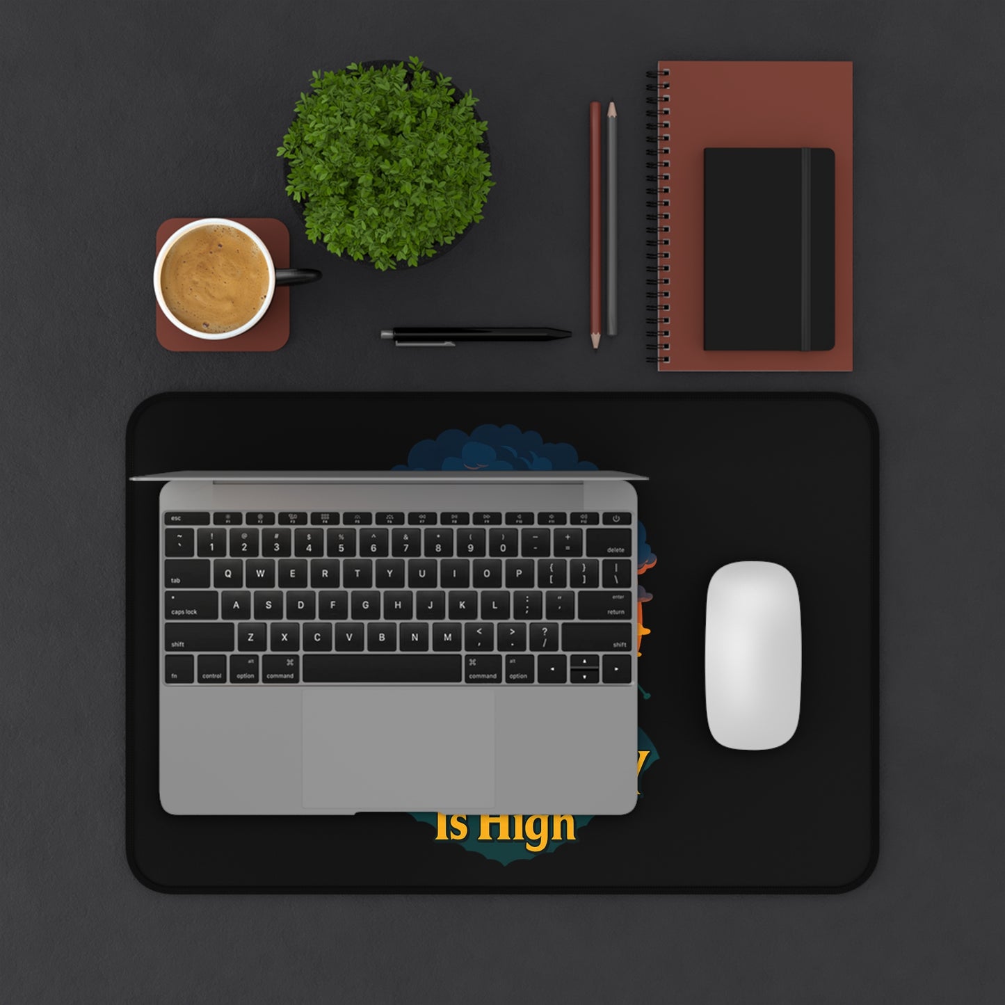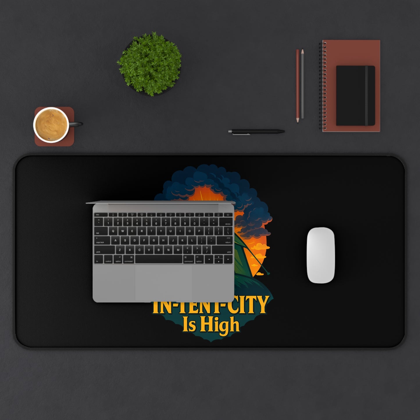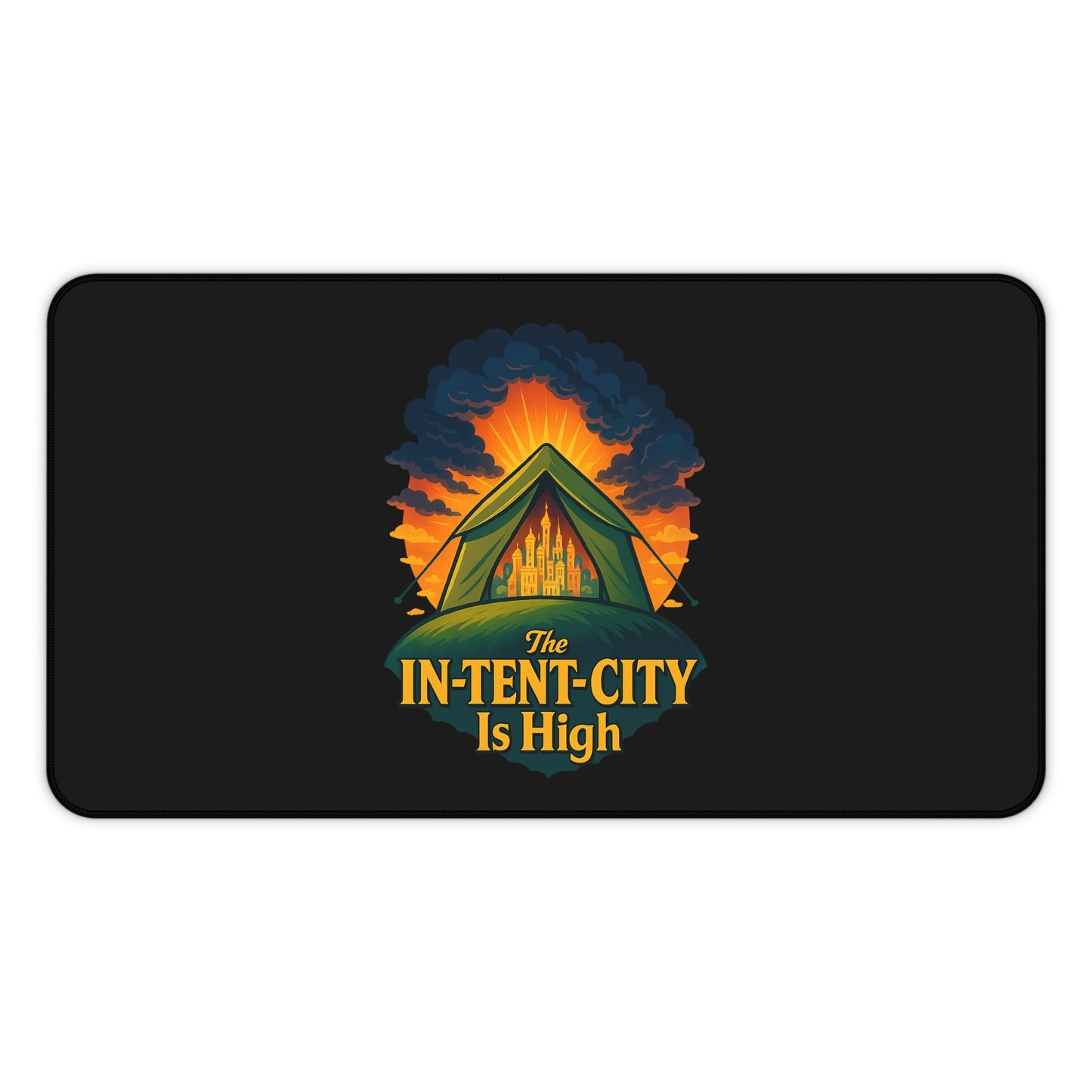A fun Desk Mat with a city within a tent high on a hill that states 'The In-Tent-City Is High'. This quirky design adds a playful touch to your workspace, creating a fun and laid-back atmosphere. Perfect for those who enjoy unique and whimsical decor. Ideal for gifting on birthdays, holidays, or as a back-to-school present.