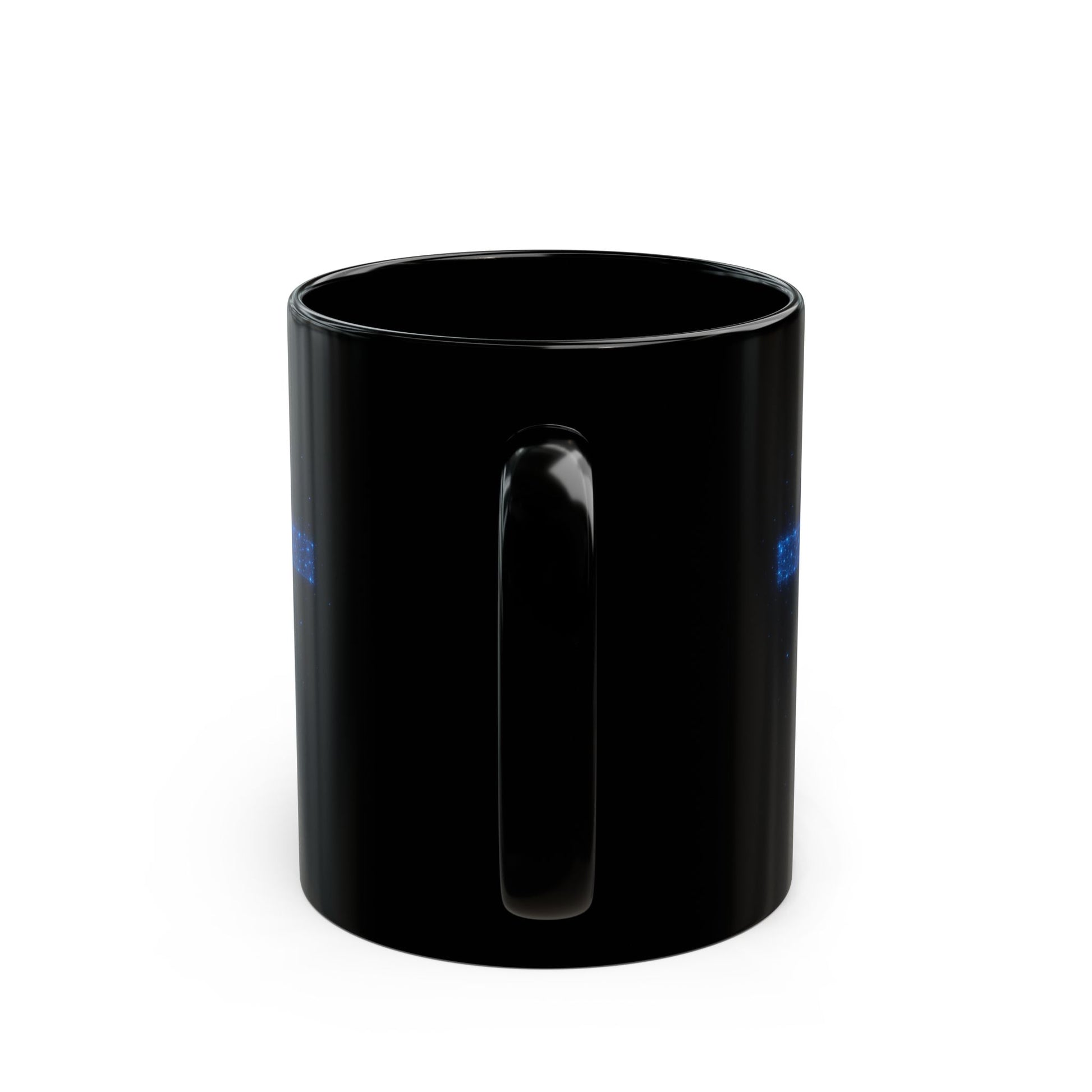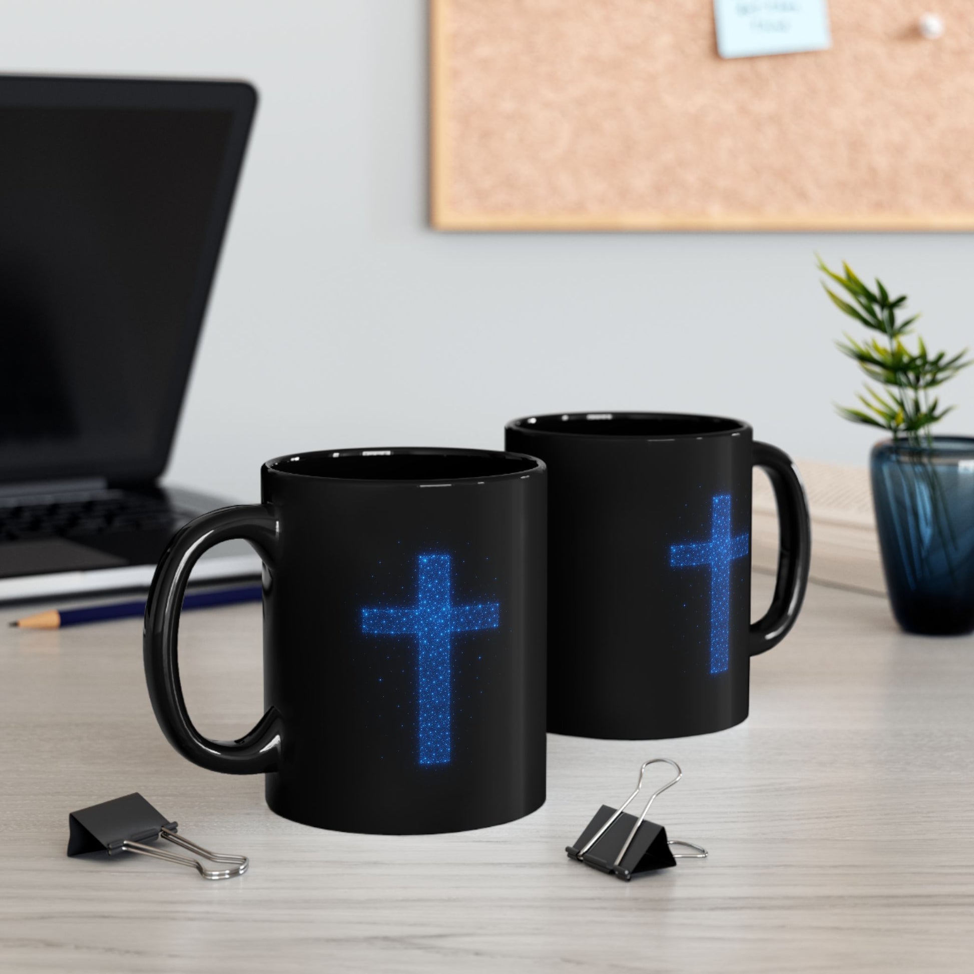 Celestial Cross Mug – Blue Starry Christian Coffee Cup – Faith Based Black Ceramic Mug with Cosmic Cross Design | Religious Gift Idea
