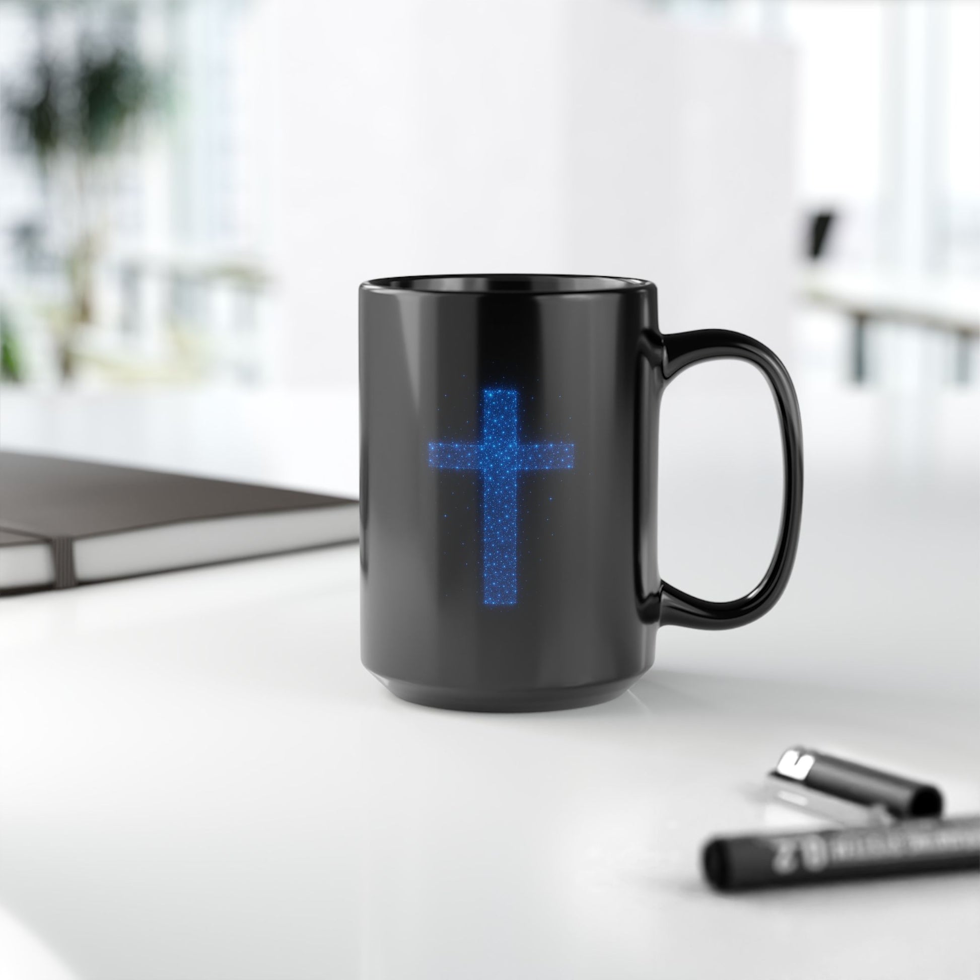Bring faith and inspiration to every sip with our Celestial Cross Mug! This sleek black ceramic coffee cup features a radiant blue cross design made of shimmering, starry details—perfect for cosmic dreamers and faith-filled mornings. While the cross has a glowing look, it is a printed design and does not glow in the dark.