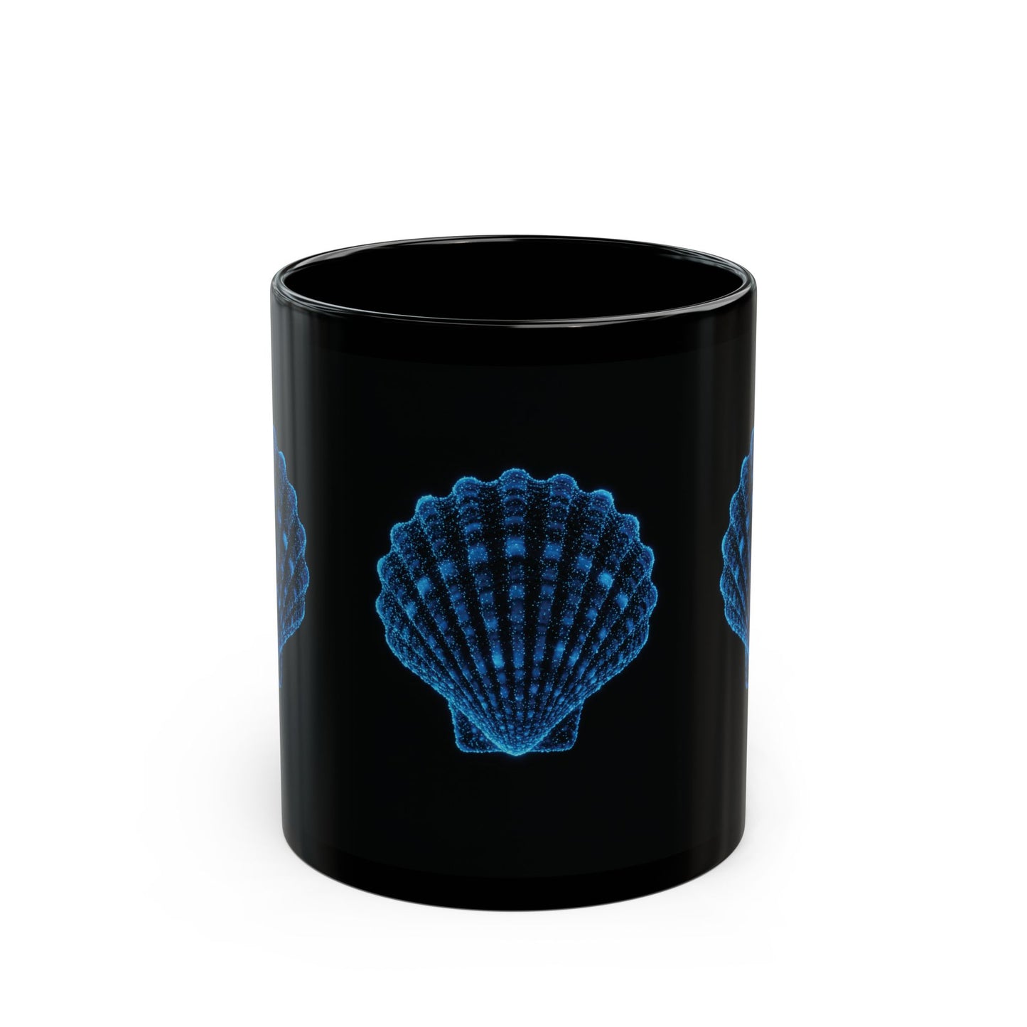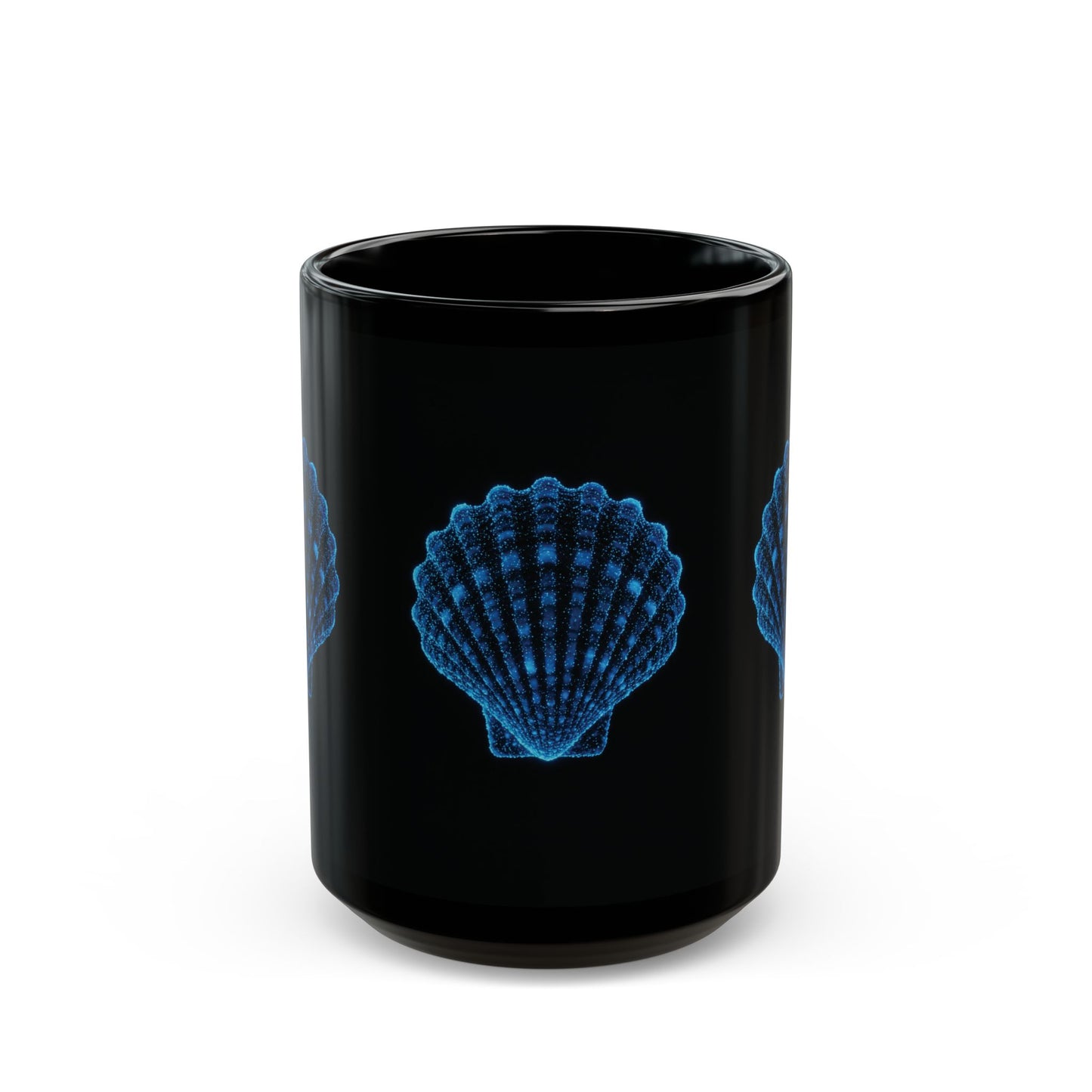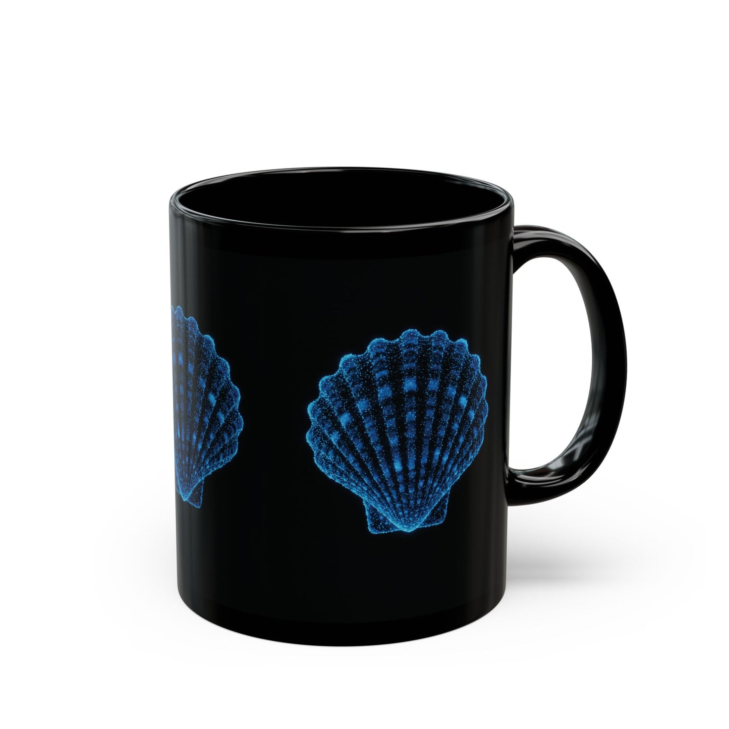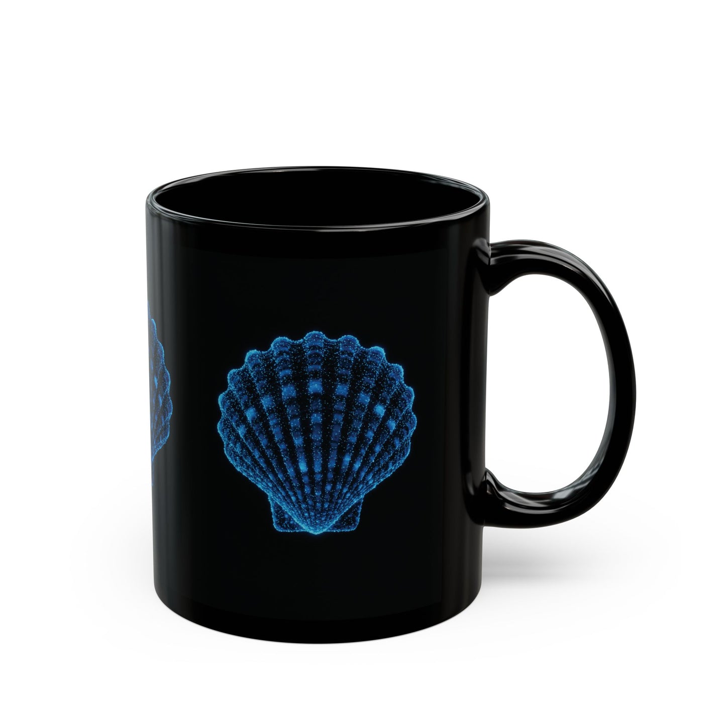 Digital Seashell Mug – Black Ceramic Coffee Cup with Blue Glow Effect Design, Coastal Tech & Y2K Aesthetic, Dishwasher Safe Ocean Gift