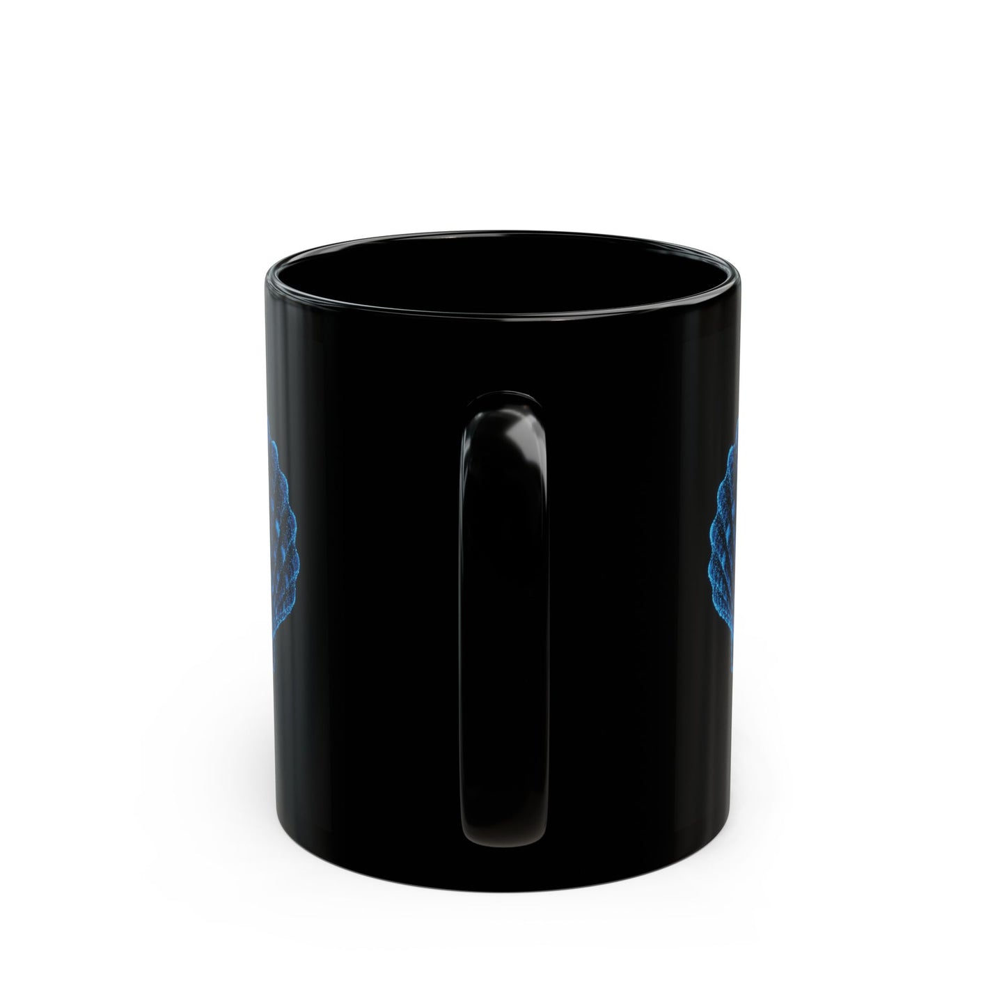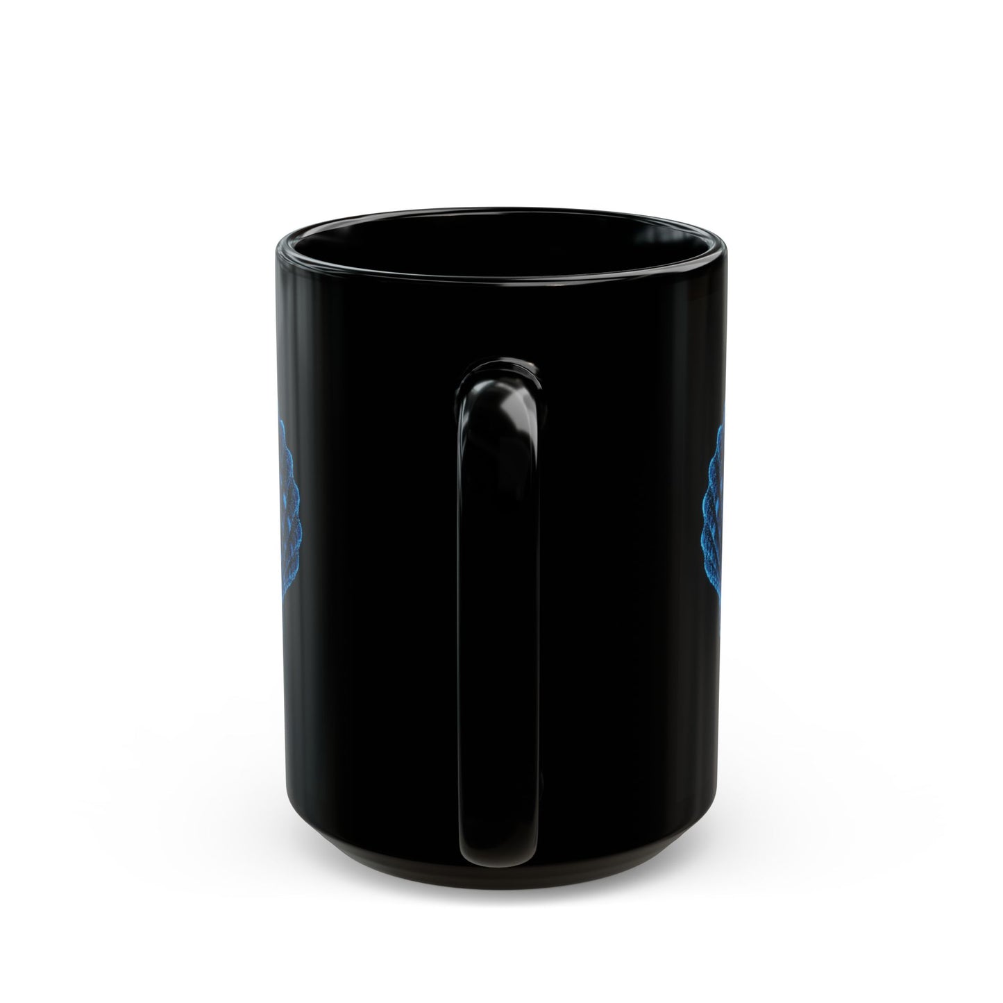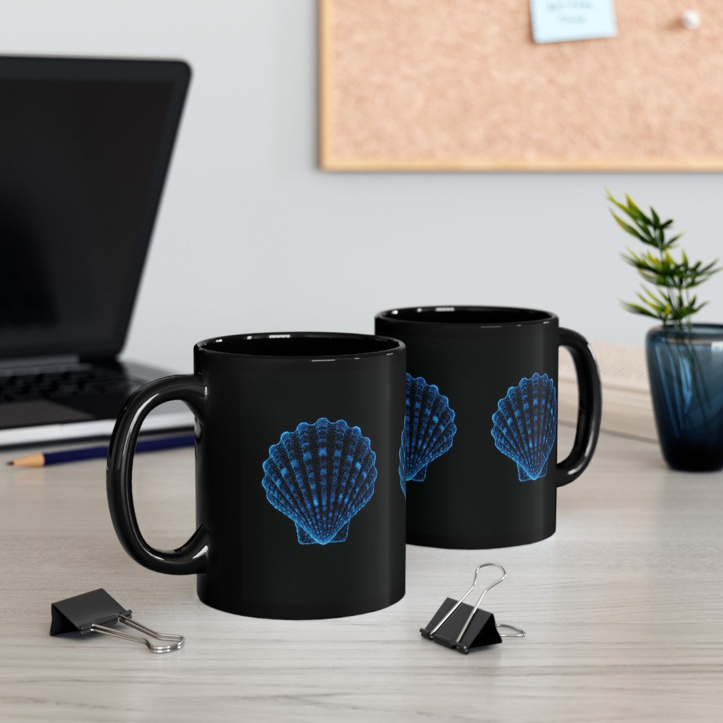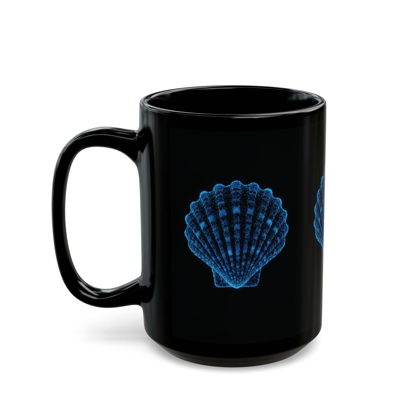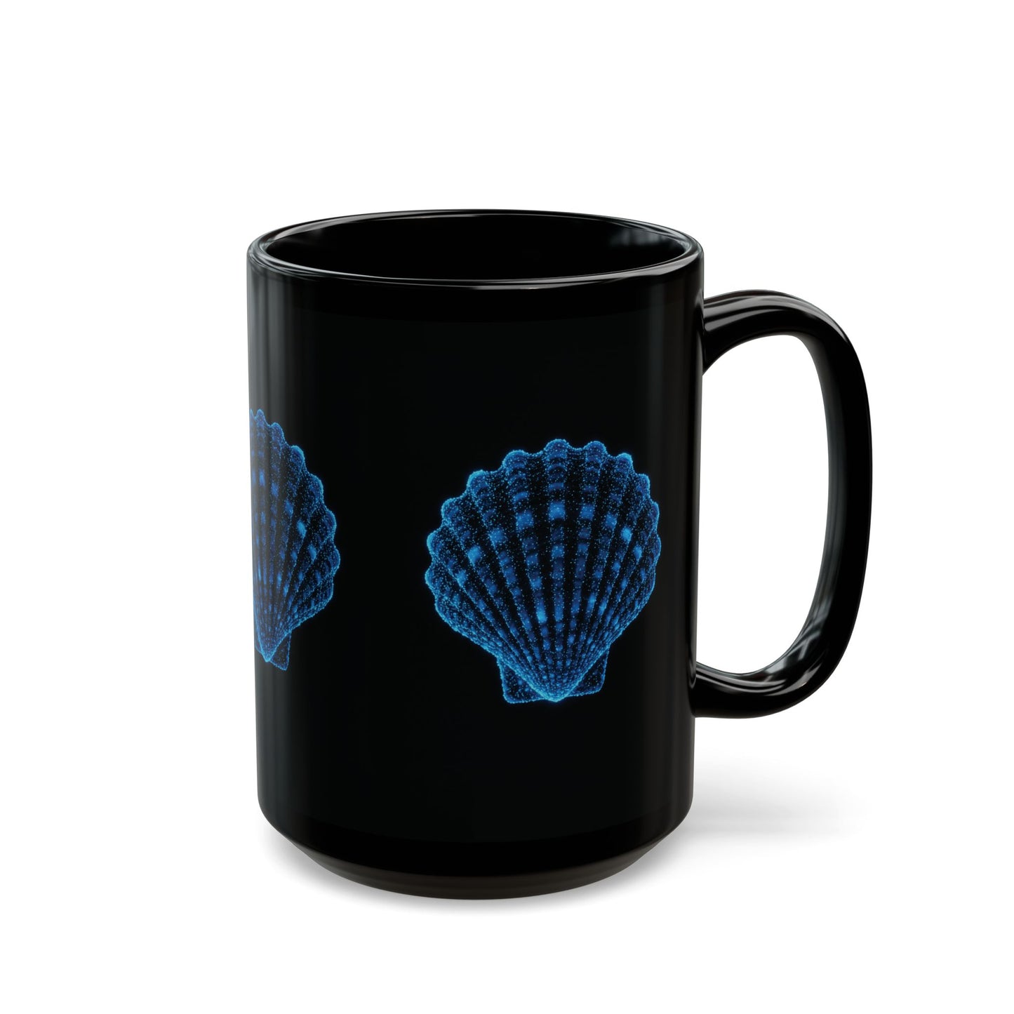 Digital Seashell Mug – Black Ceramic Coffee Cup with Blue Glow Effect Design, Coastal Tech & Y2K Aesthetic, Dishwasher Safe Ocean Gift