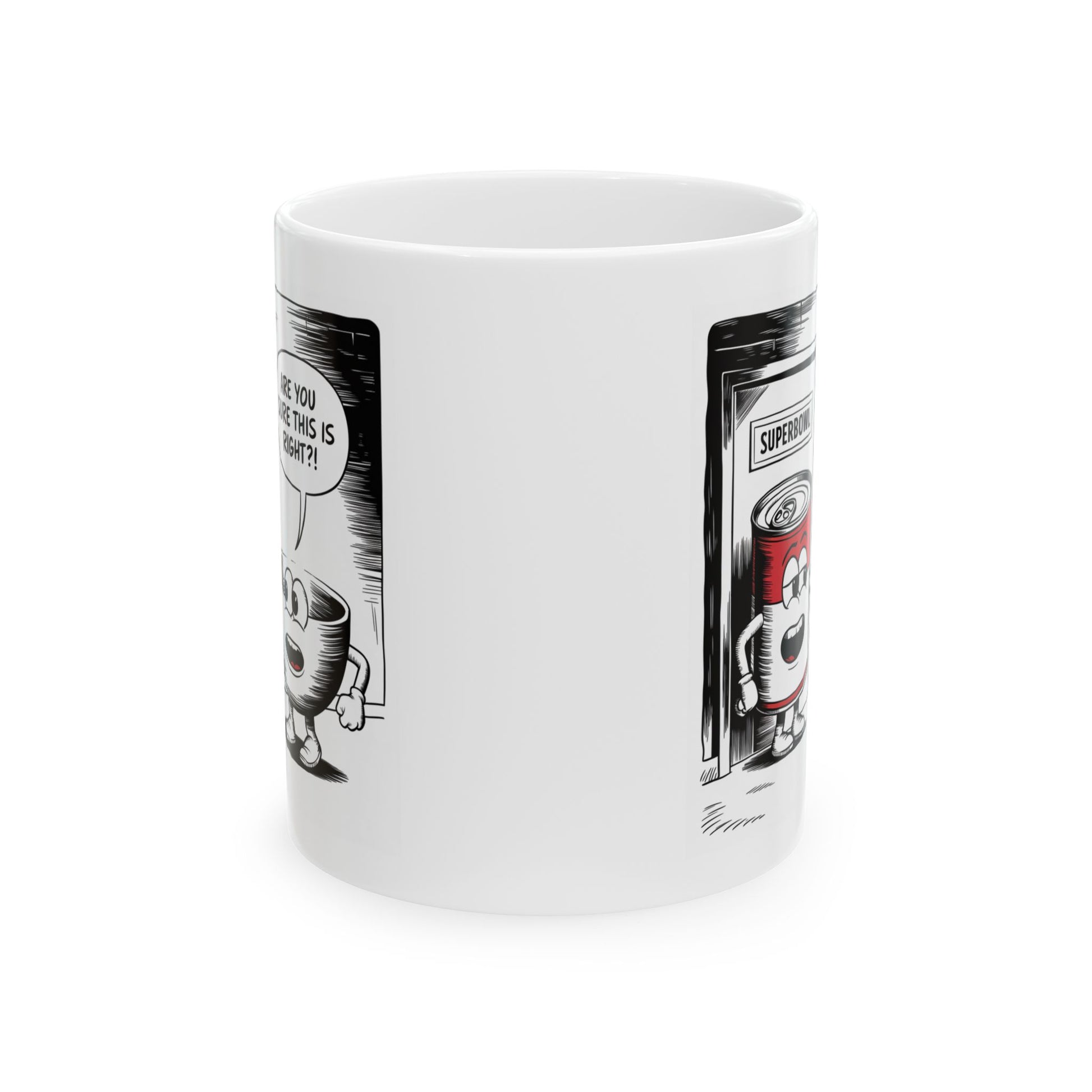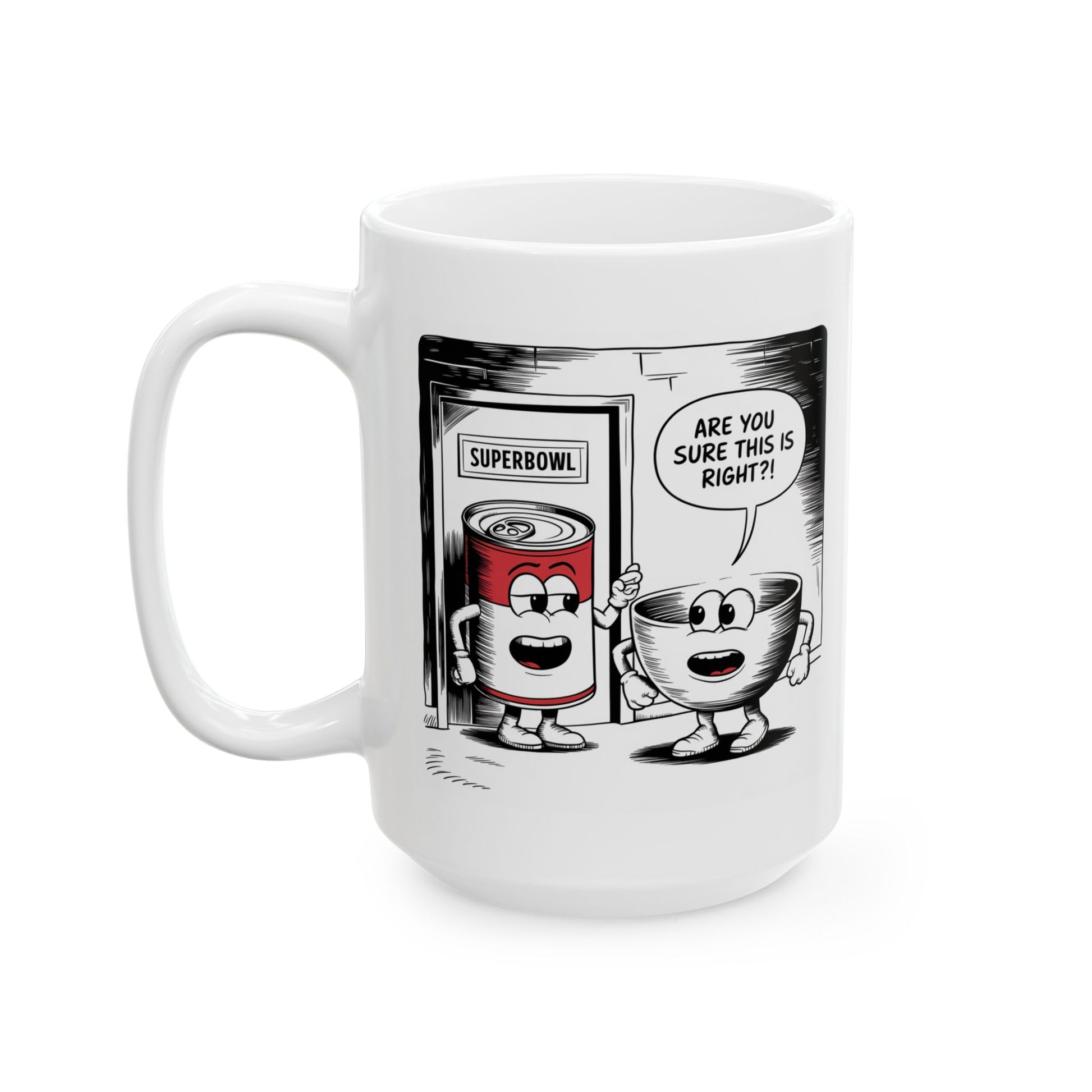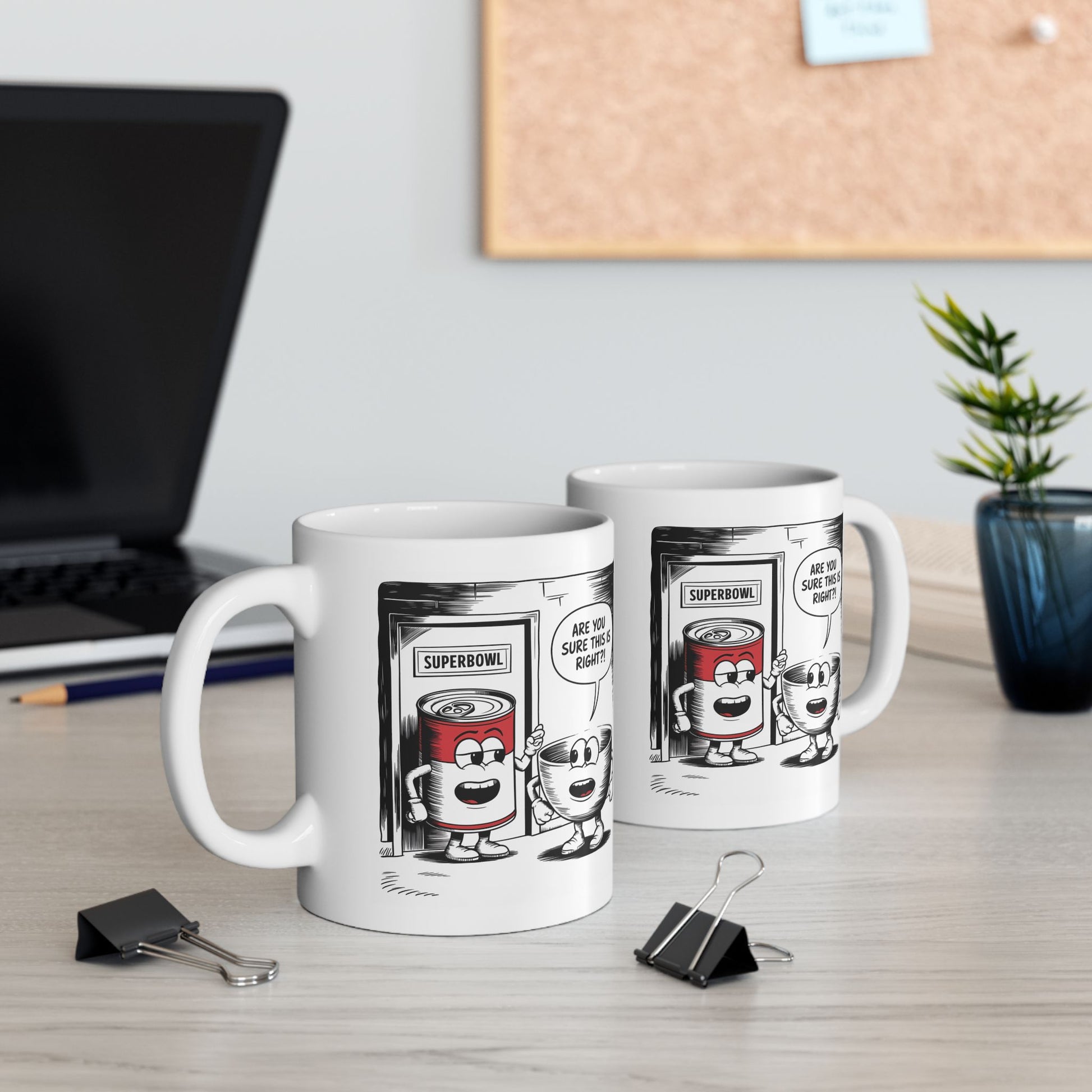 This ceramic mug features a fun comic of a bowl and a can of soup getting ready to enter a door that says 'Superbowl'. It adds a playful touch to your morning coffee or tea routine and is perfect for comic lovers and those who enjoy witty designs. Ideal for gifting during birthdays, holidays, or just to brighten someone's day.