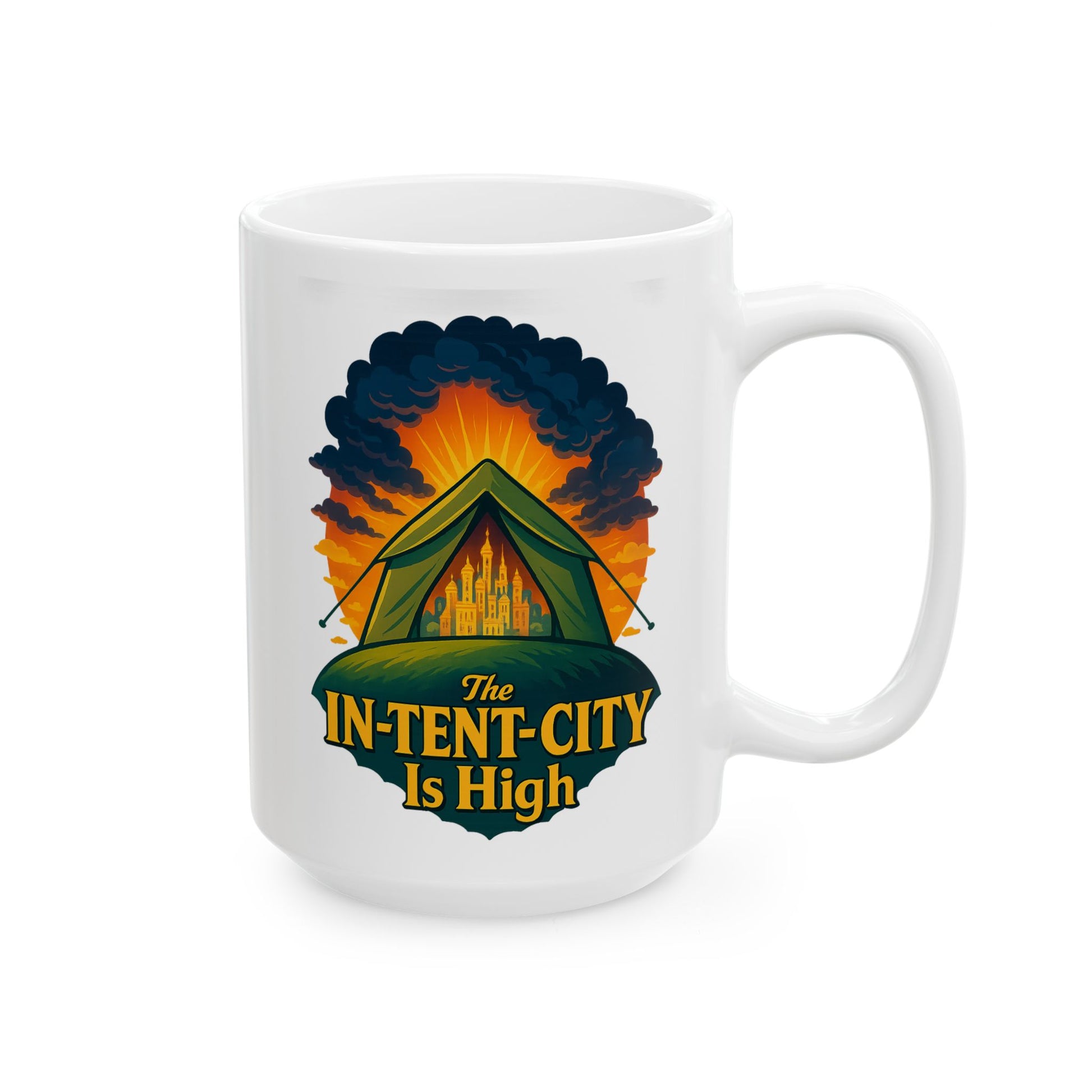 Camping Coffee Mug • The In-Tent-City Is High Pun Cup • Funny Hiking Gift • Outdoors Adventure Mug • Camper Humor Drinkware 11oz 15oz