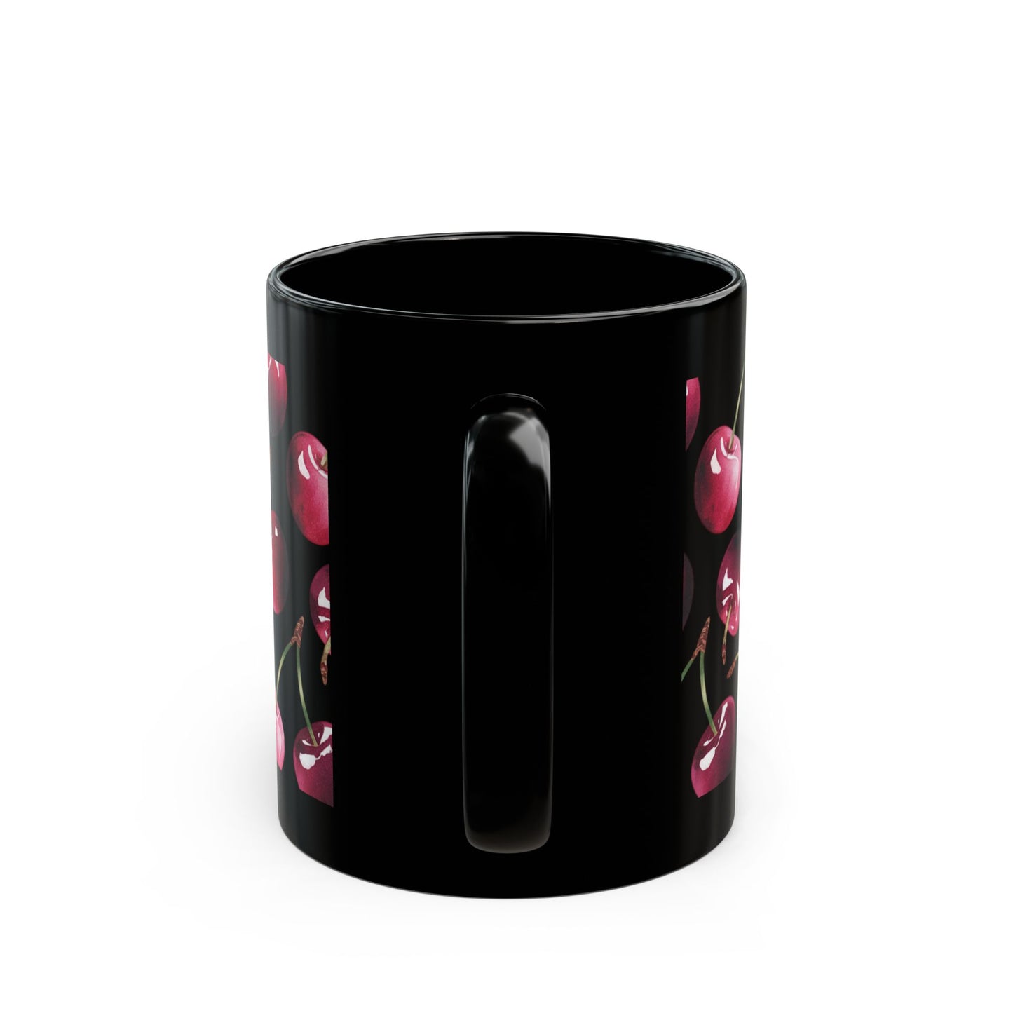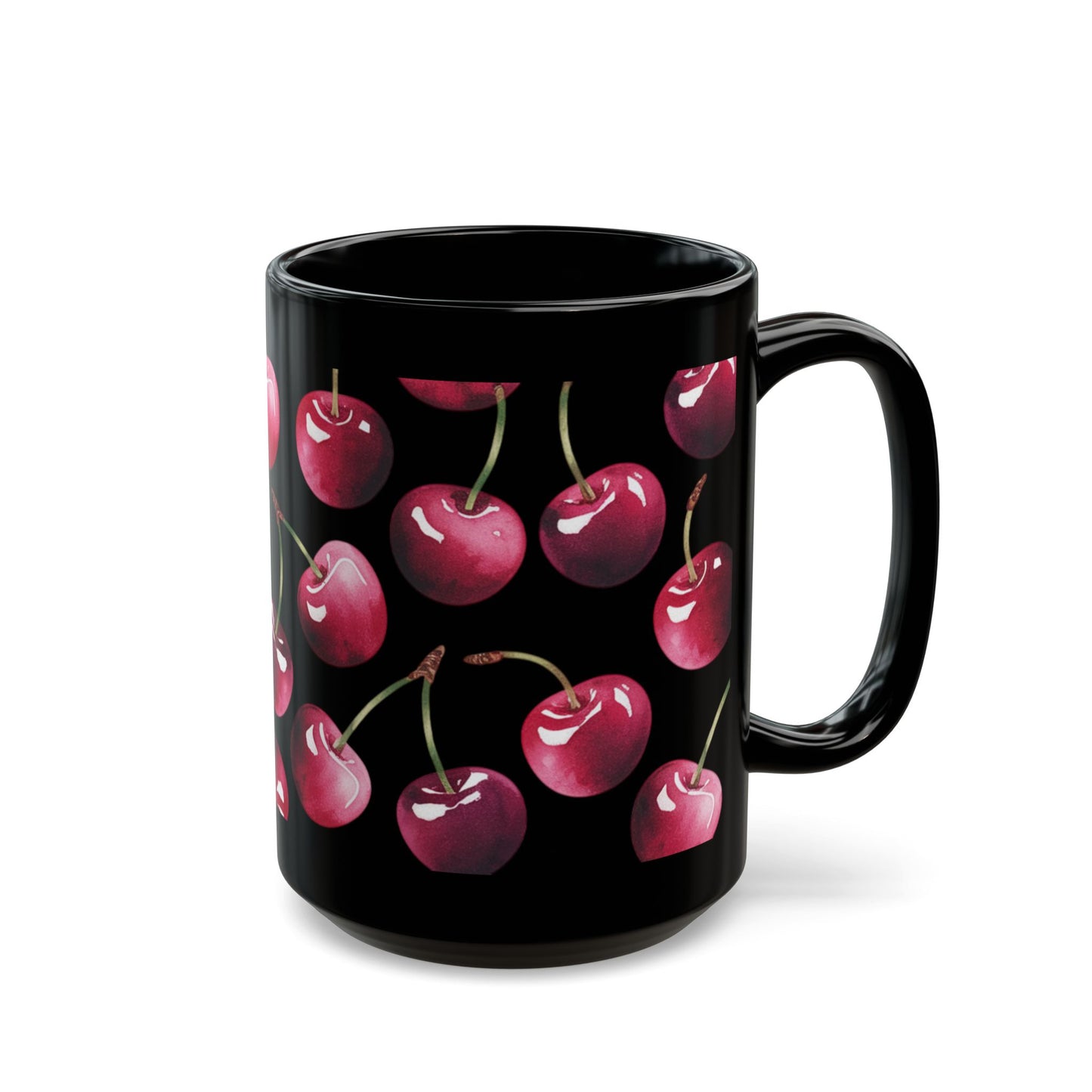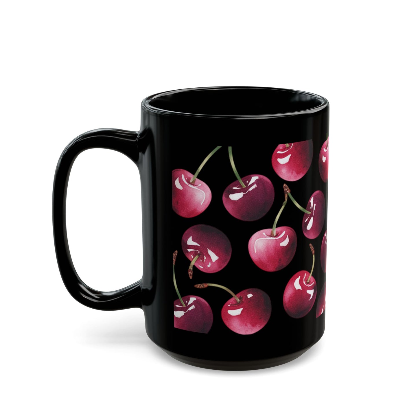 Cherry Coffee Mug – Black Ceramic Cup with Red Cherries Pattern – Cute Fruit Lover Gift – Kitchen Decor – 11oz or 15oz