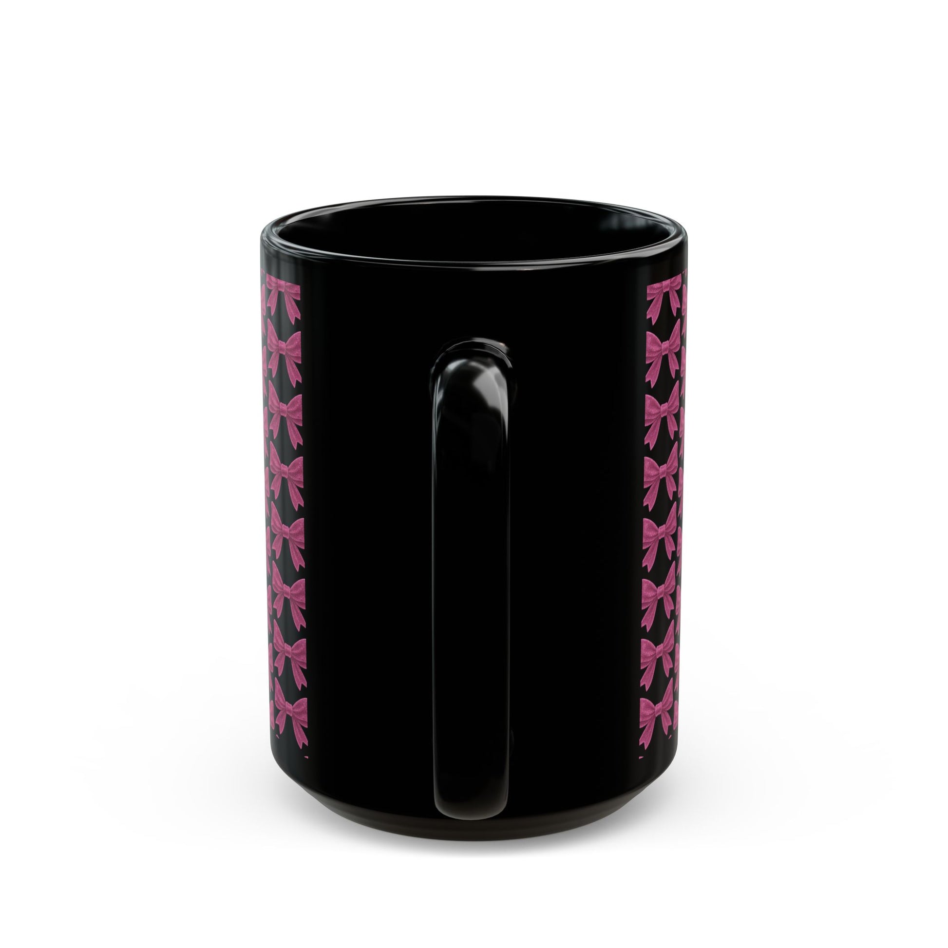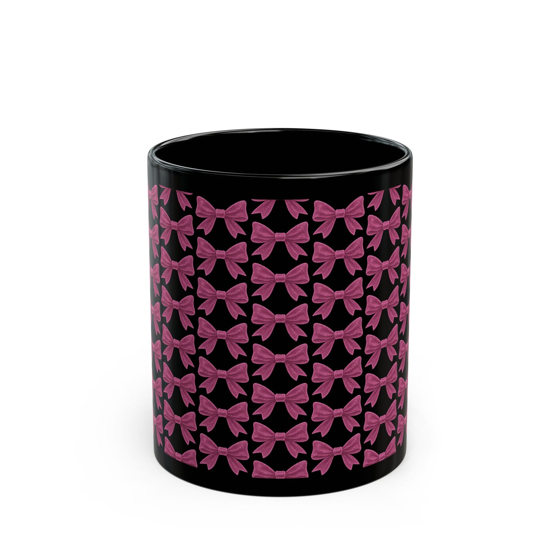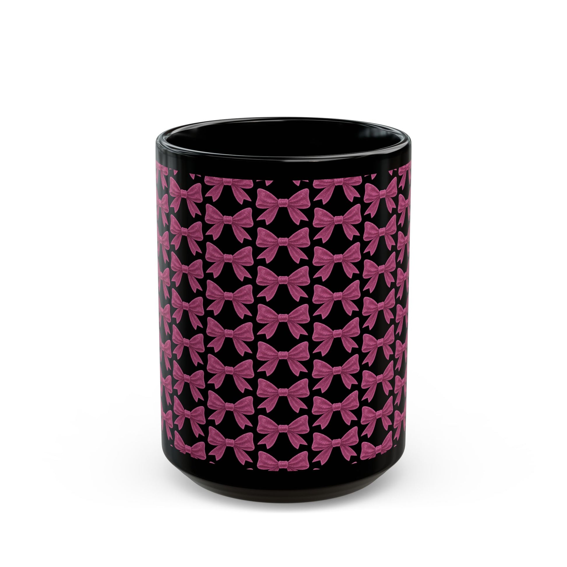 A fun black mug with a Sparkling Pink Bow pattern on it, perfect for adding a touch of whimsy to your morning coffee routine. This mug is ideal for adults who enjoy playful designs and want to start their day with a pop of color. Great for gifting during birthdays, holidays, and special occasions.