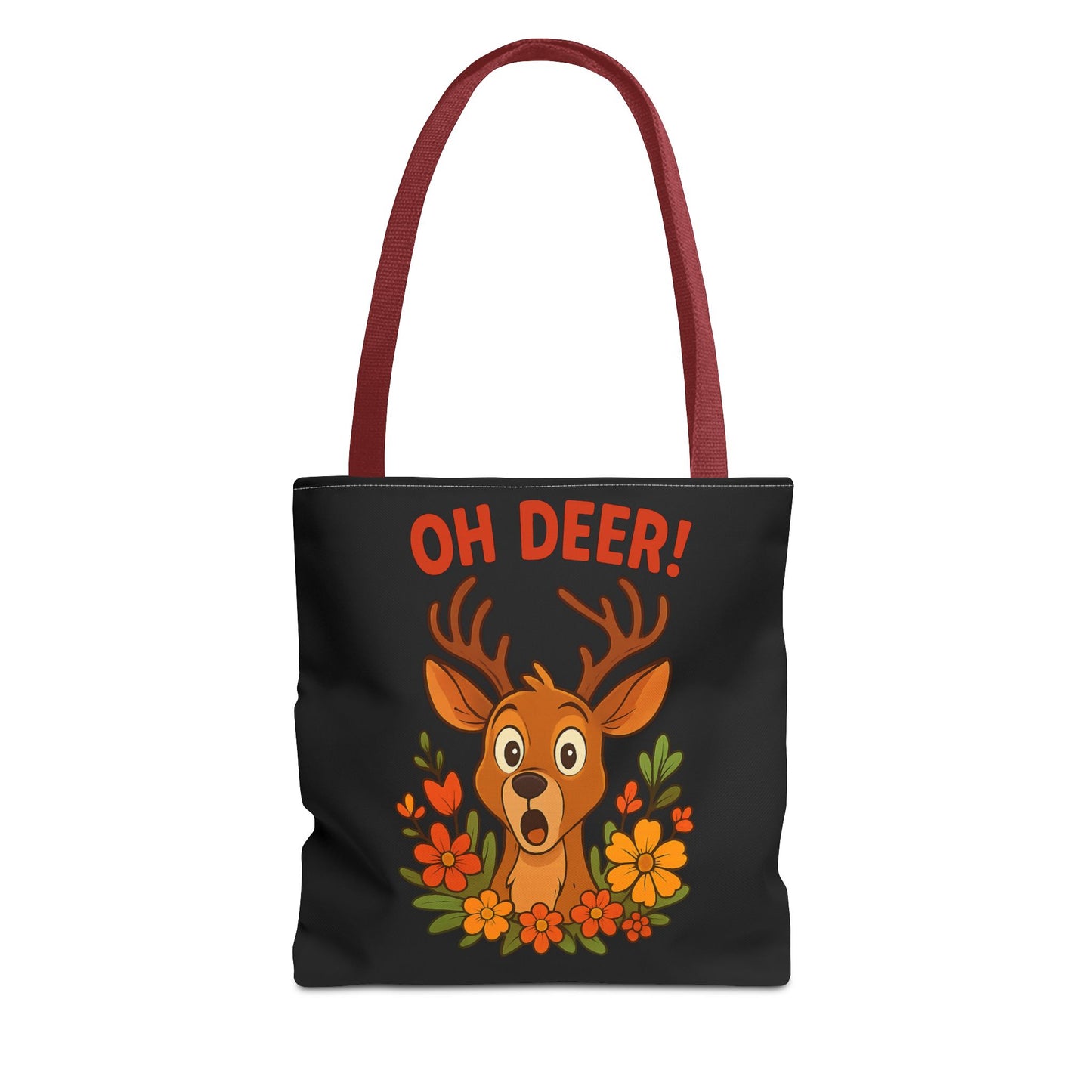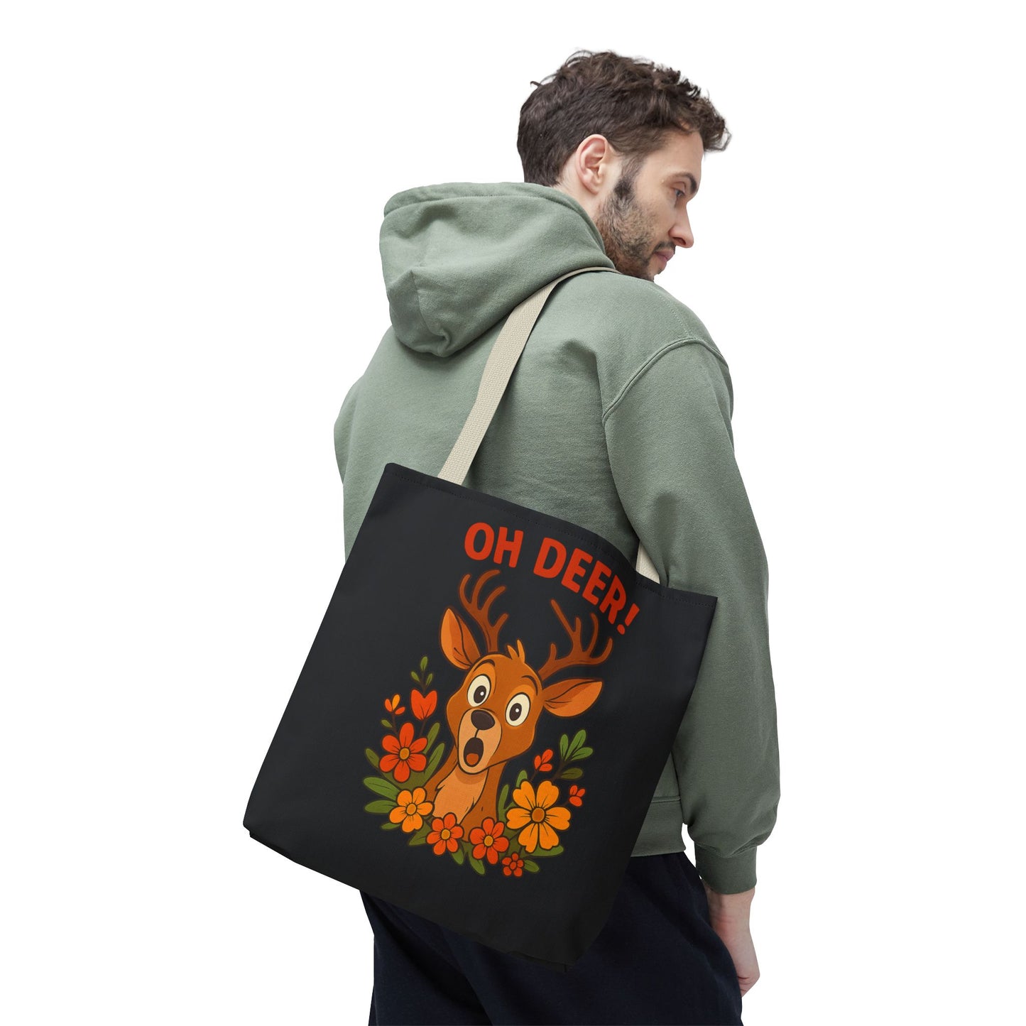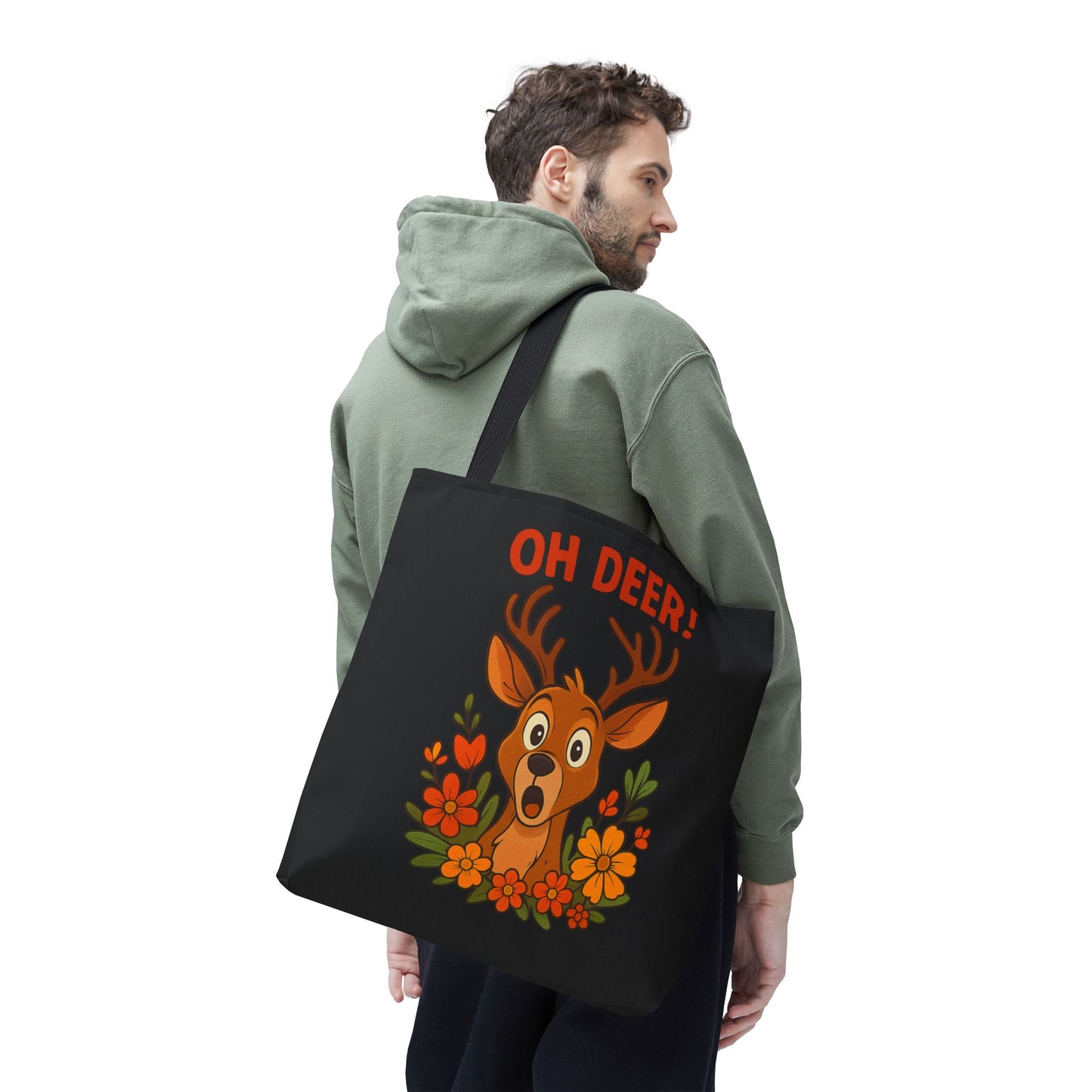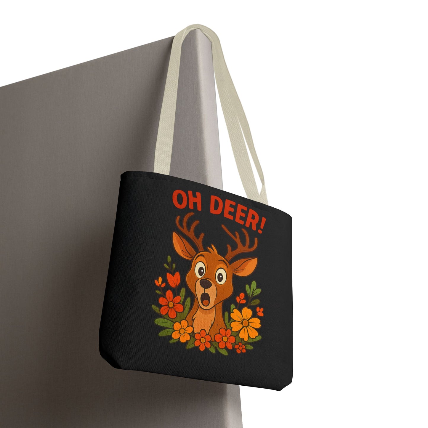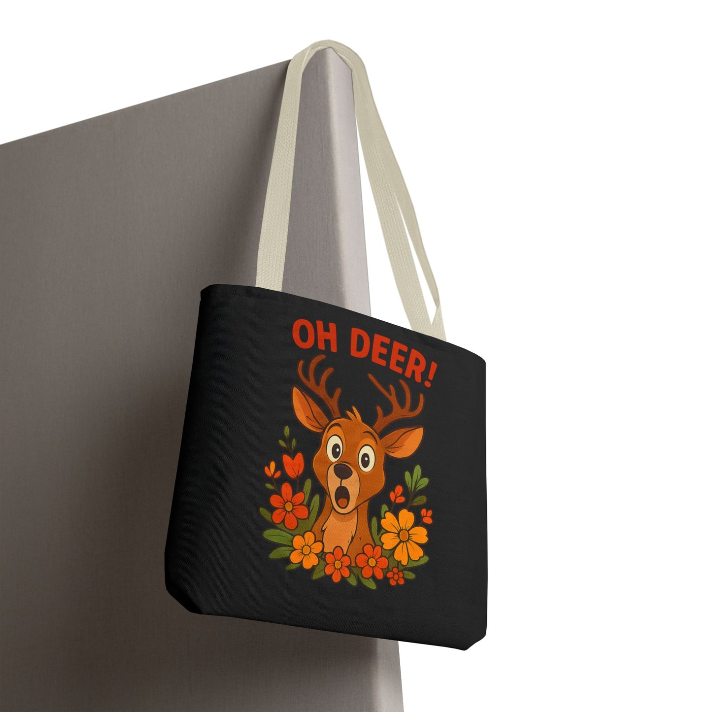 A fun tote bag with a startled Deer on it that states "Oh Deer". Perfect for nature lovers, animal enthusiasts, and those with a sense of humor. This tote bag adds a touch of whimsy to everyday life and is ideal for carrying around books, groceries, or daily essentials. Great for gifting during the holiday season, birthdays, or as a stocking stuffer.