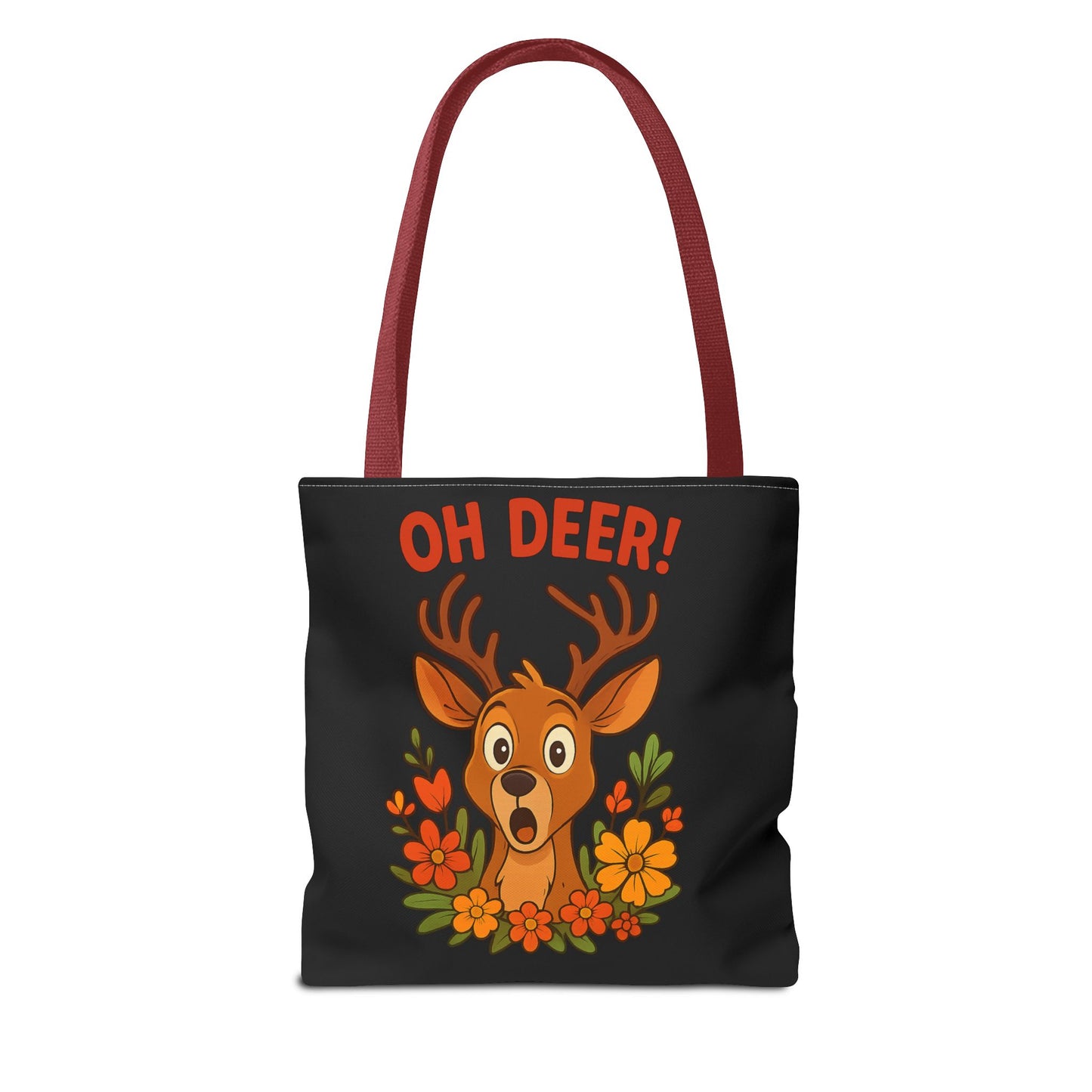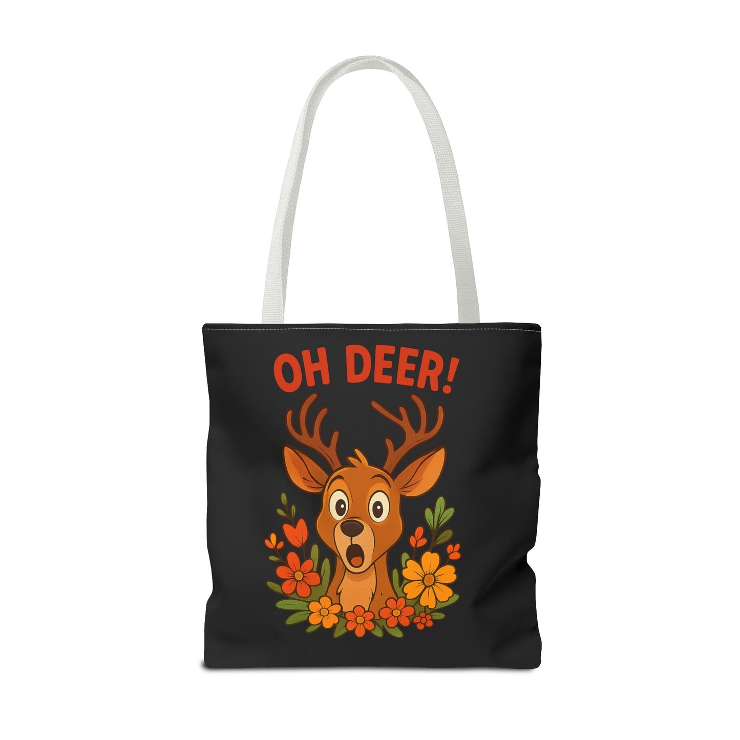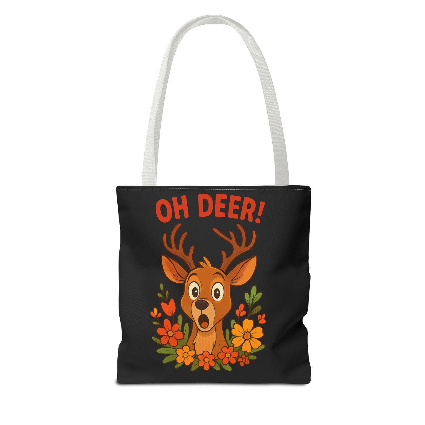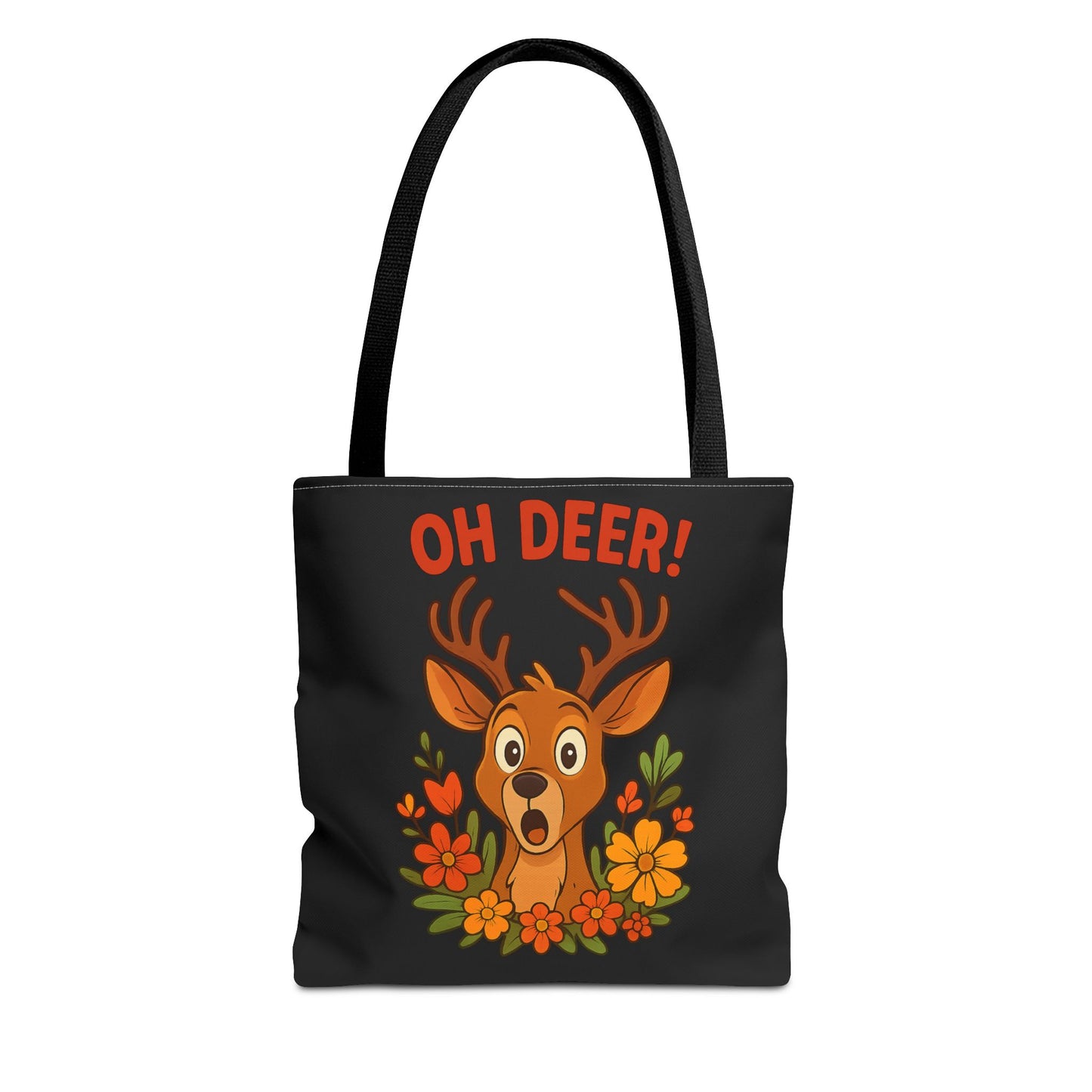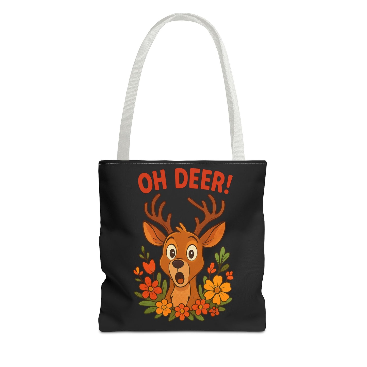 A fun tote bag with a startled Deer on it that states "Oh Deer". Perfect for nature lovers, animal enthusiasts, and those with a sense of humor. This tote bag adds a touch of whimsy to everyday life and is ideal for carrying around books, groceries, or daily essentials. Great for gifting during the holiday season, birthdays, or as a stocking stuffer.