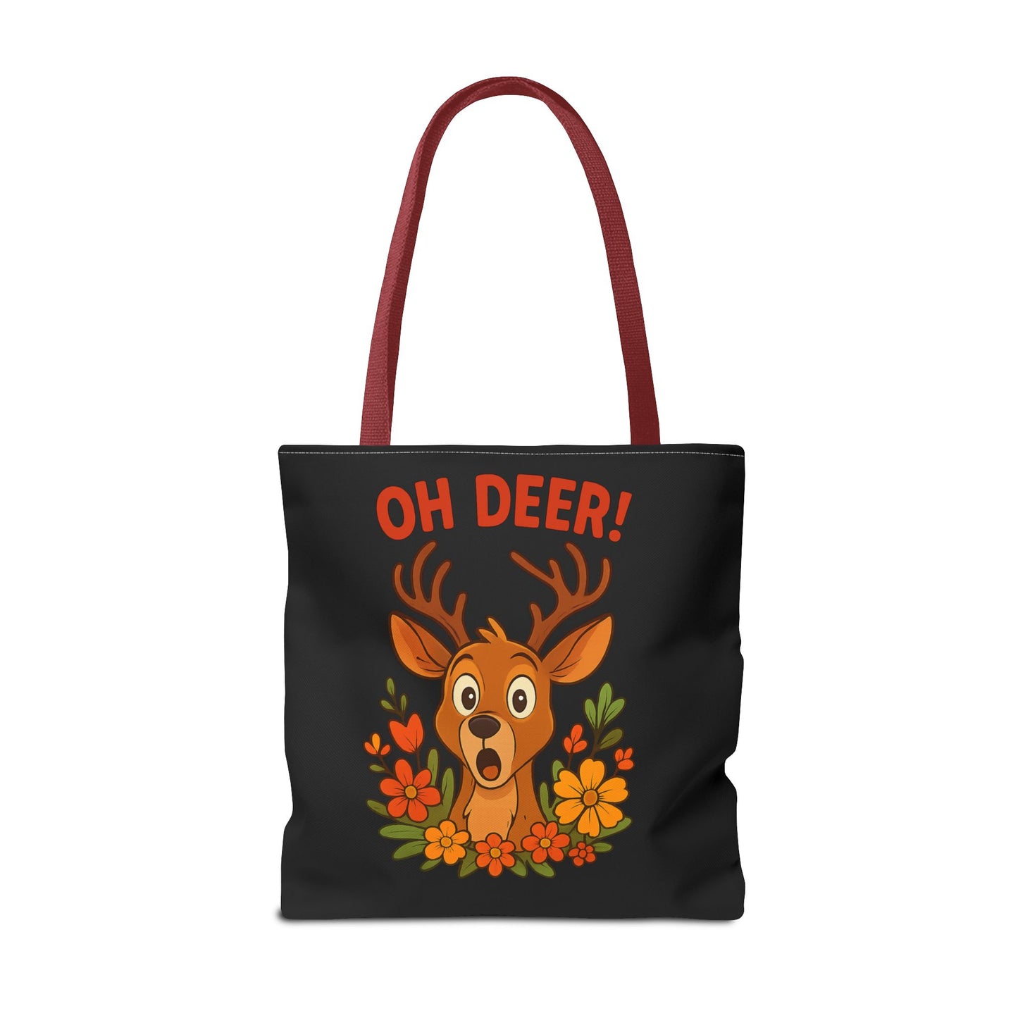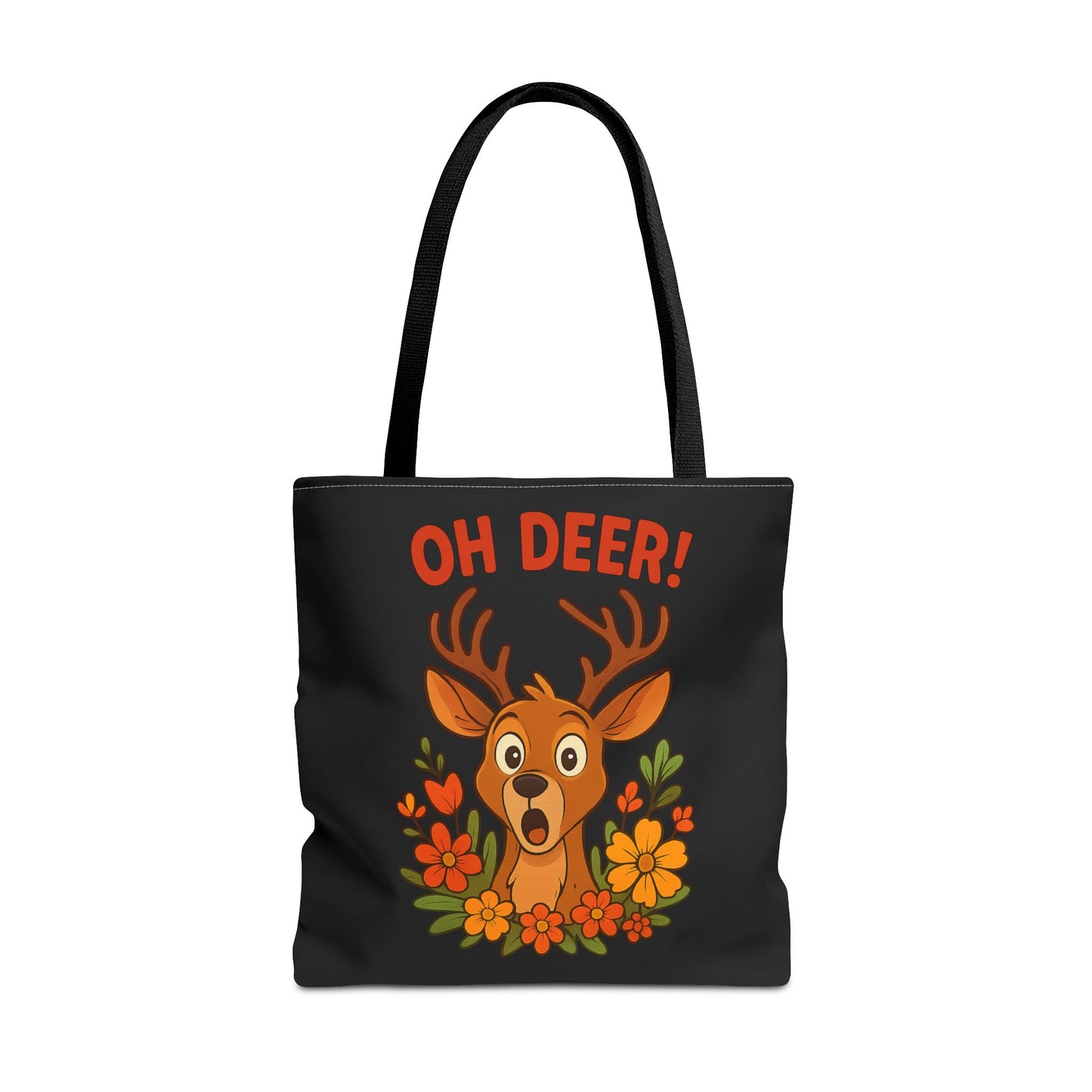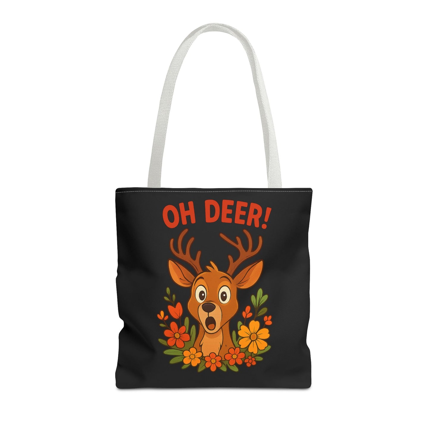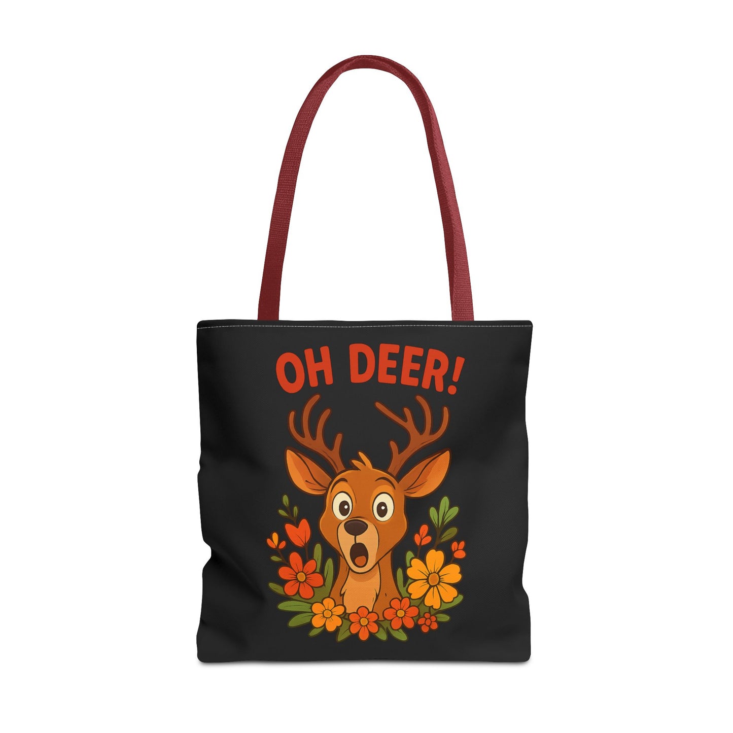 A fun tote bag with a startled Deer on it that states "Oh Deer". Perfect for nature lovers, animal enthusiasts, and those with a sense of humor. This tote bag adds a touch of whimsy to everyday life and is ideal for carrying around books, groceries, or daily essentials. Great for gifting during the holiday season, birthdays, or as a stocking stuffer.
