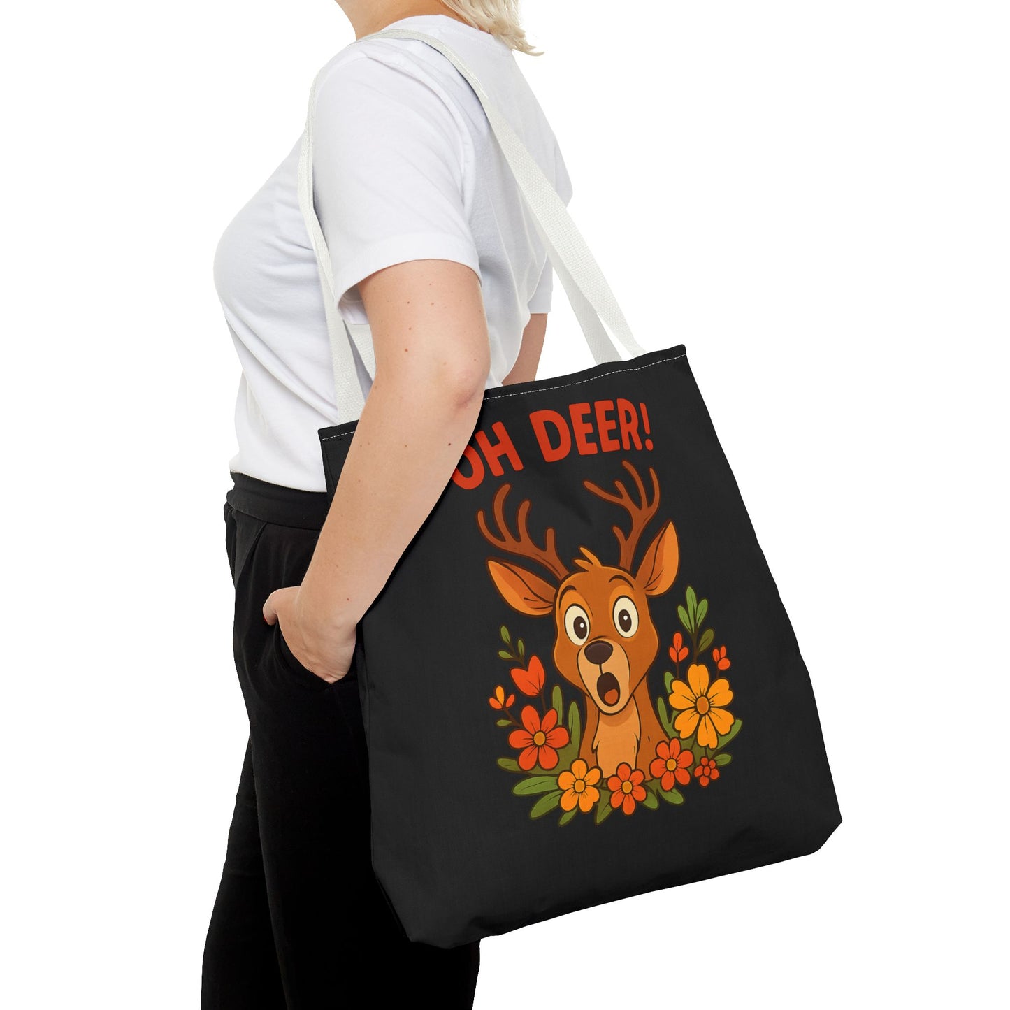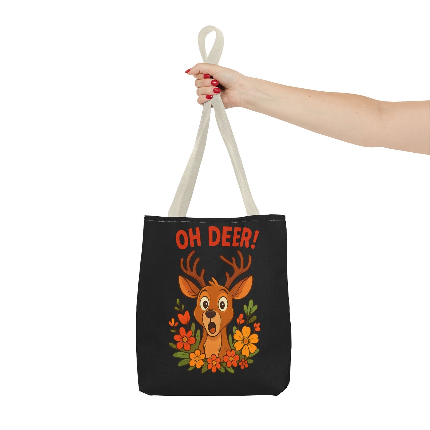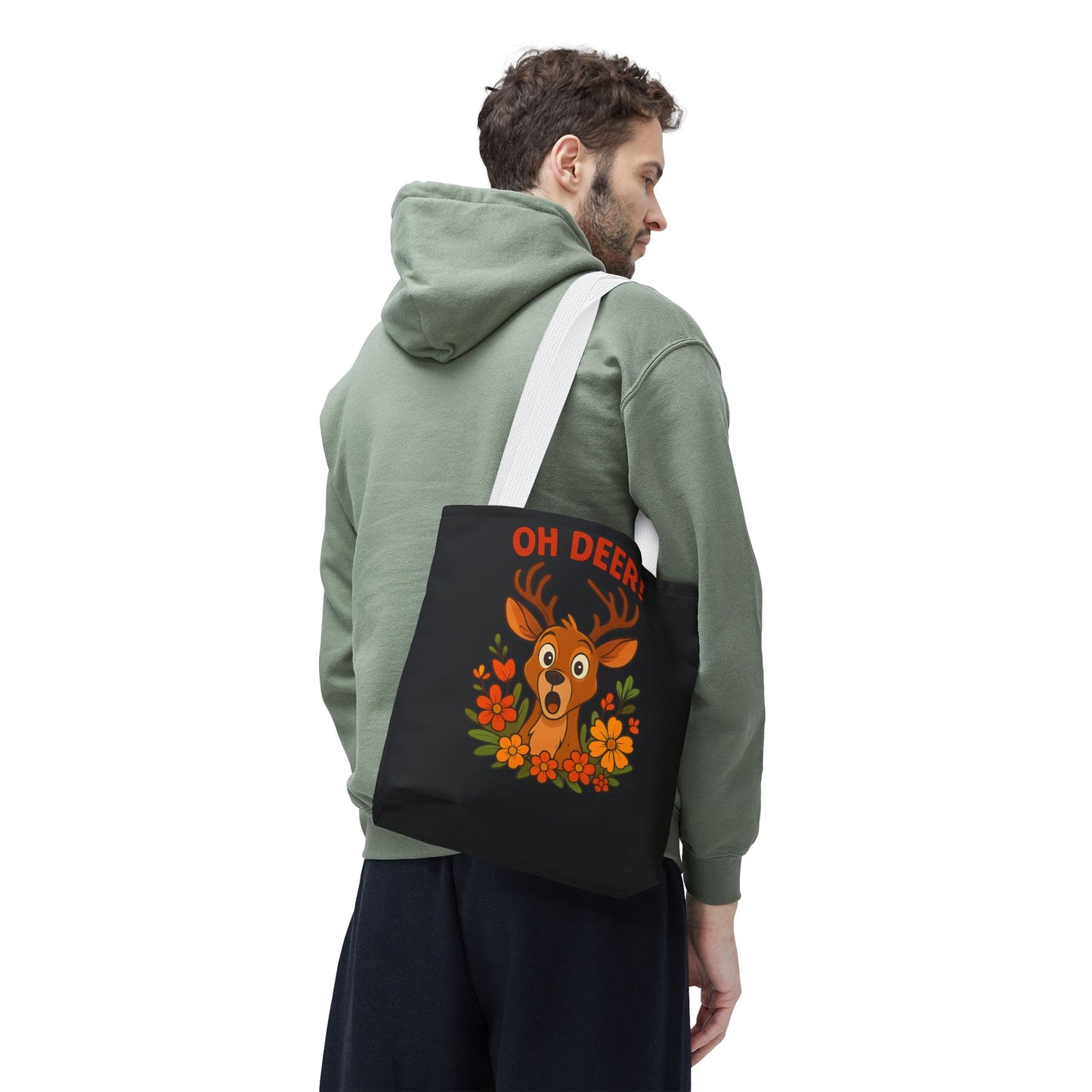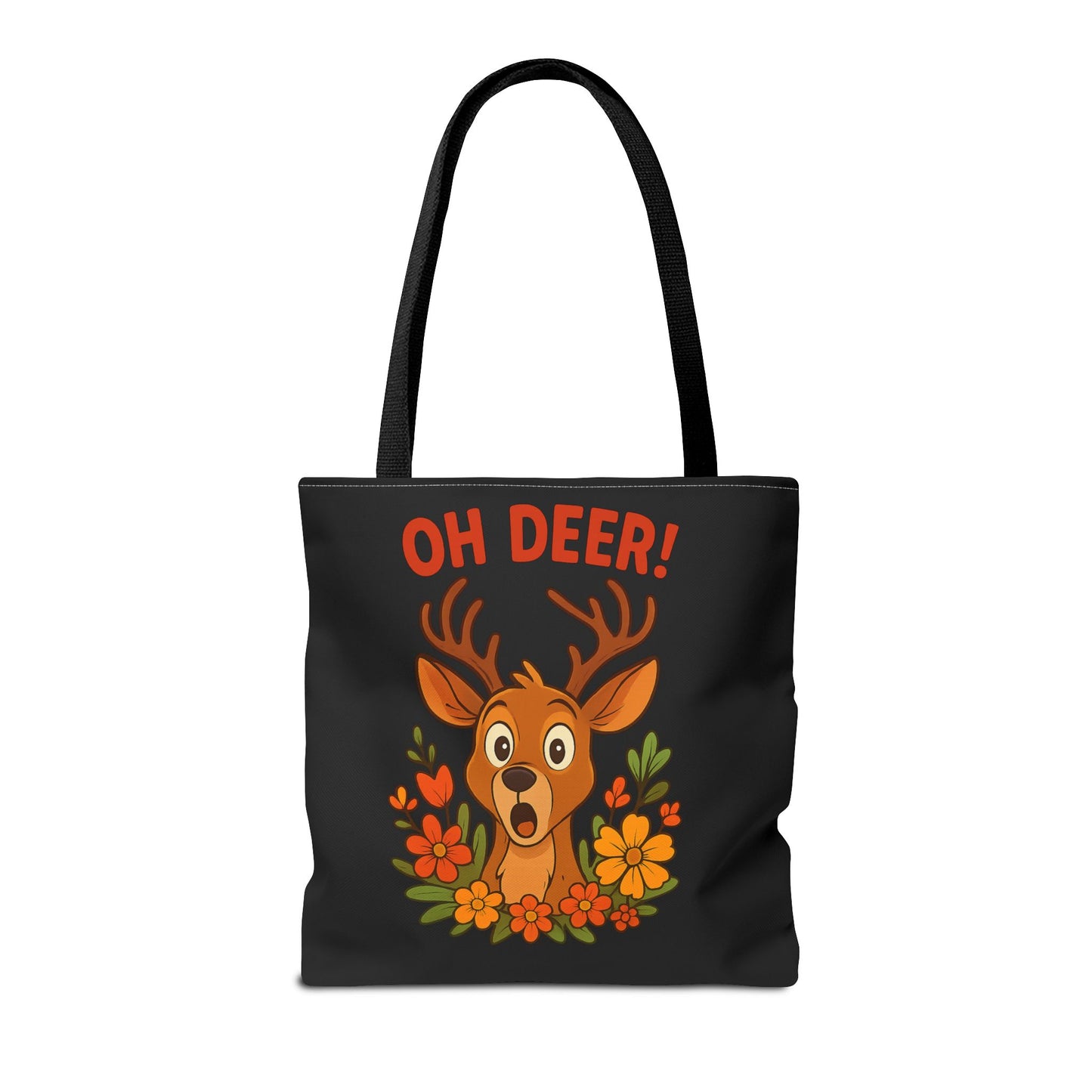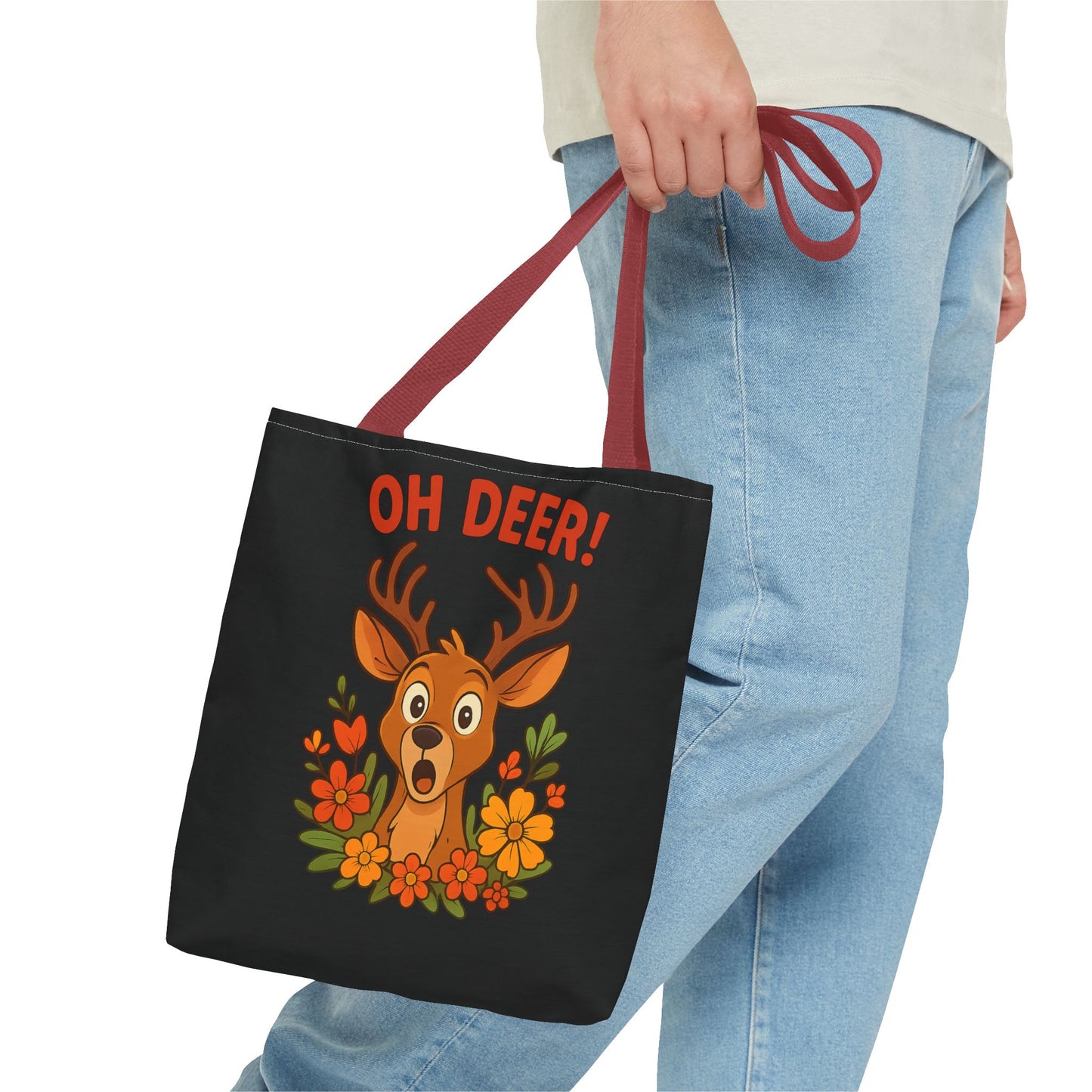 A fun tote bag with a startled Deer on it that states "Oh Deer". Perfect for nature lovers, animal enthusiasts, and those with a sense of humor. This tote bag adds a touch of whimsy to everyday life and is ideal for carrying around books, groceries, or daily essentials. Great for gifting during the holiday season, birthdays, or as a stocking stuffer.