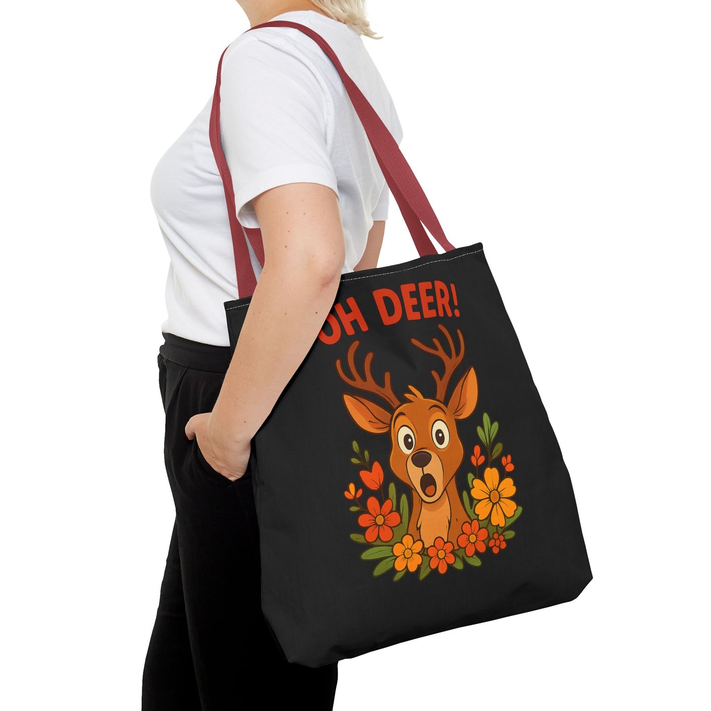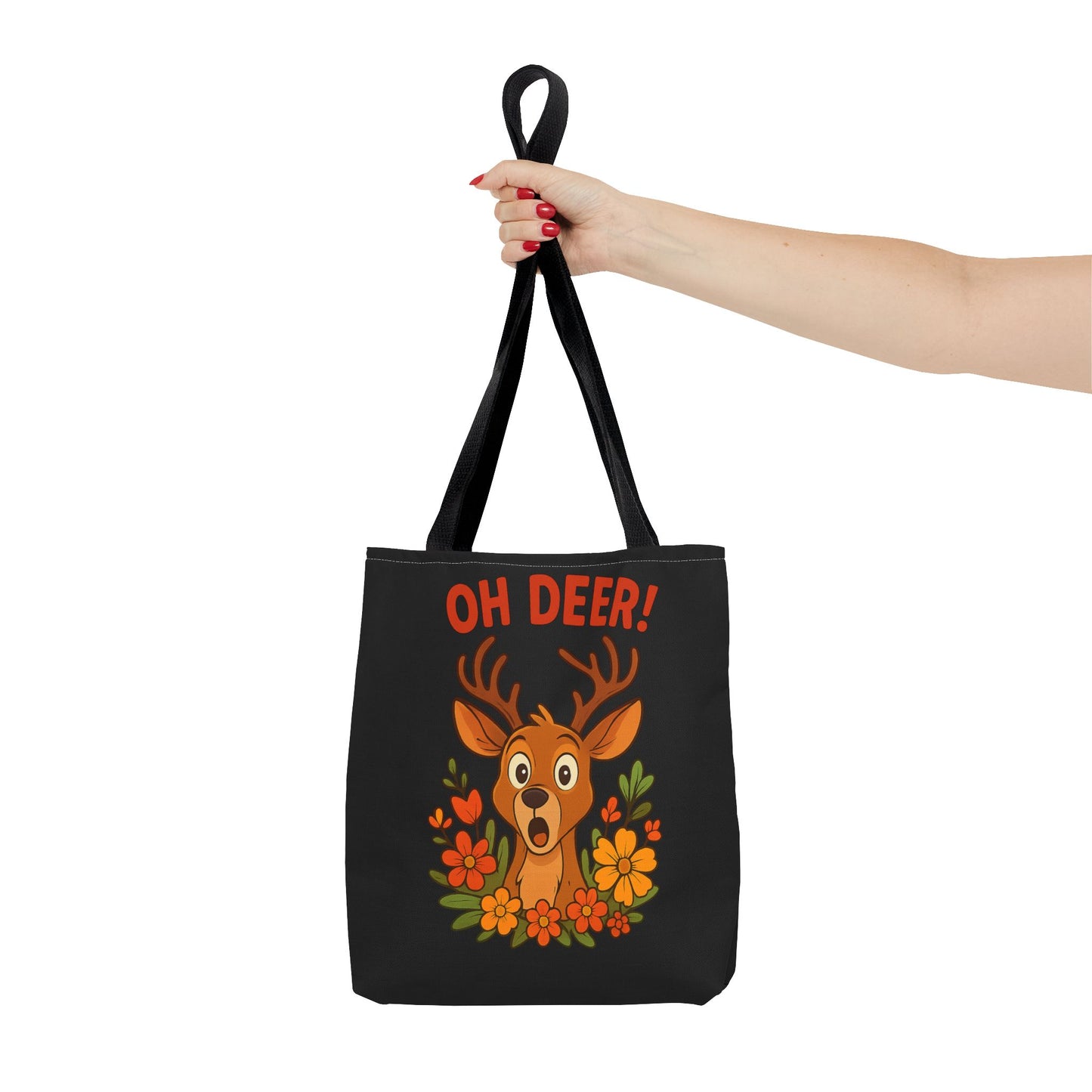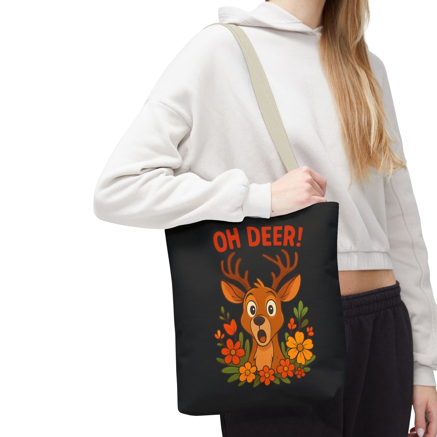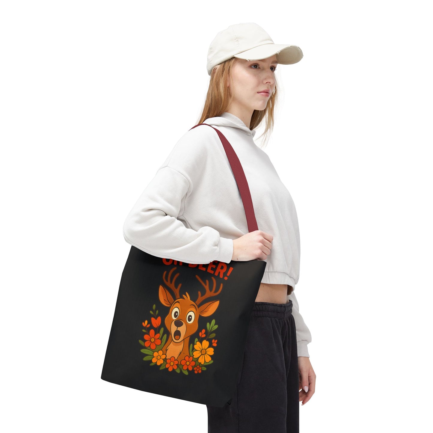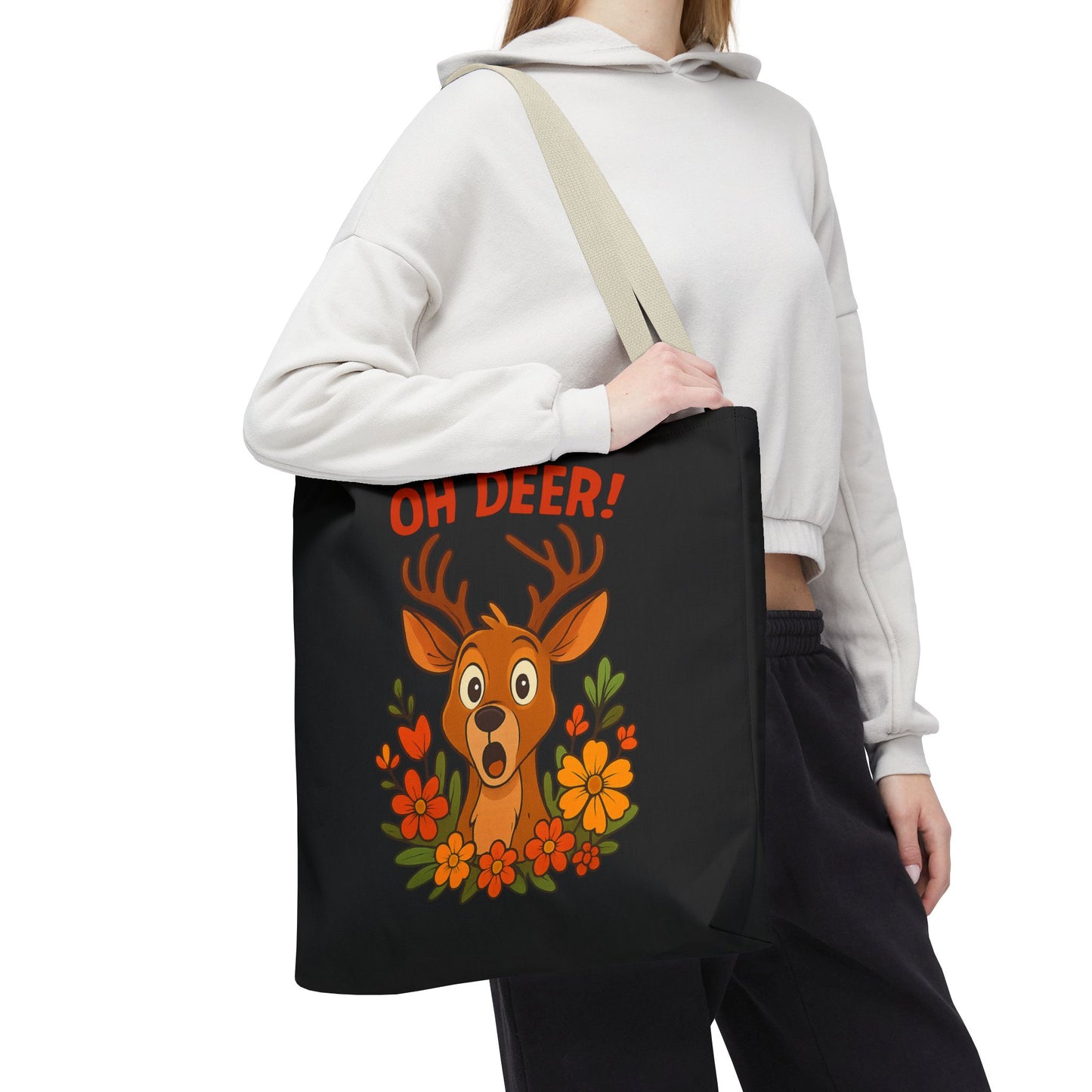 A fun tote bag with a startled Deer on it that states "Oh Deer". Perfect for nature lovers, animal enthusiasts, and those with a sense of humor. This tote bag adds a touch of whimsy to everyday life and is ideal for carrying around books, groceries, or daily essentials. Great for gifting during the holiday season, birthdays, or as a stocking stuffer.