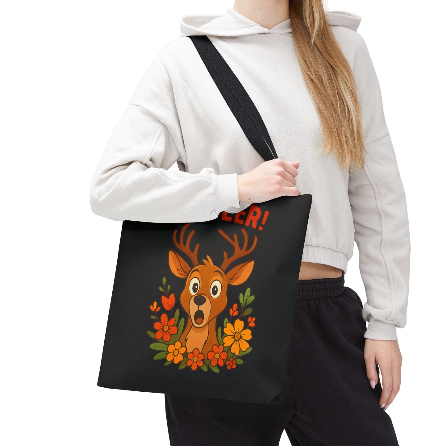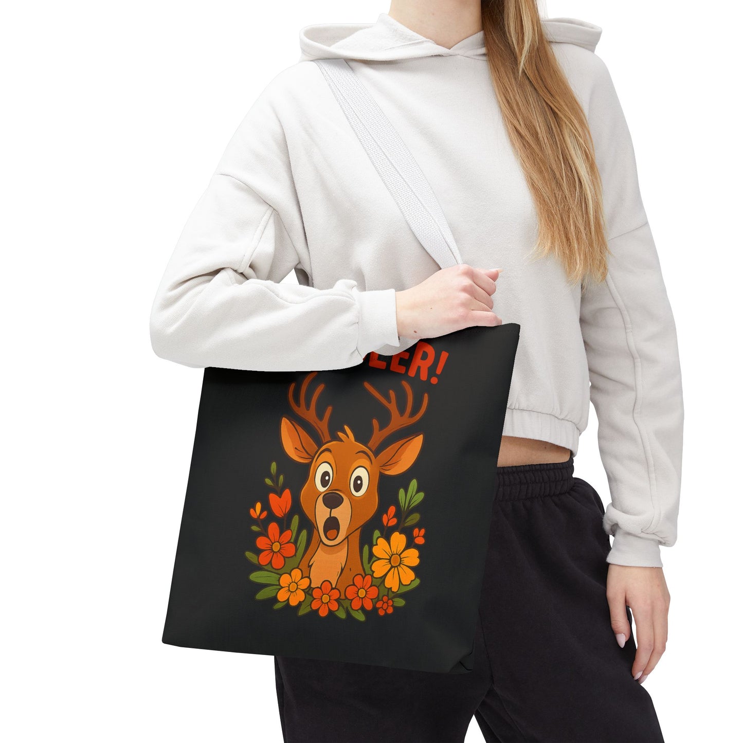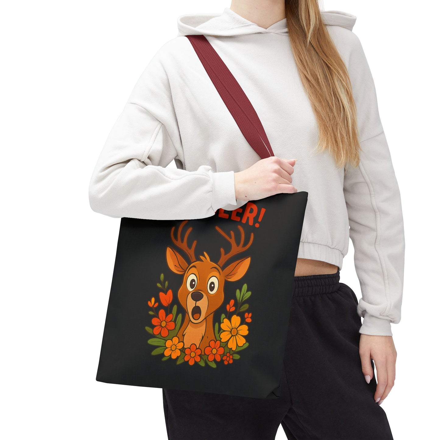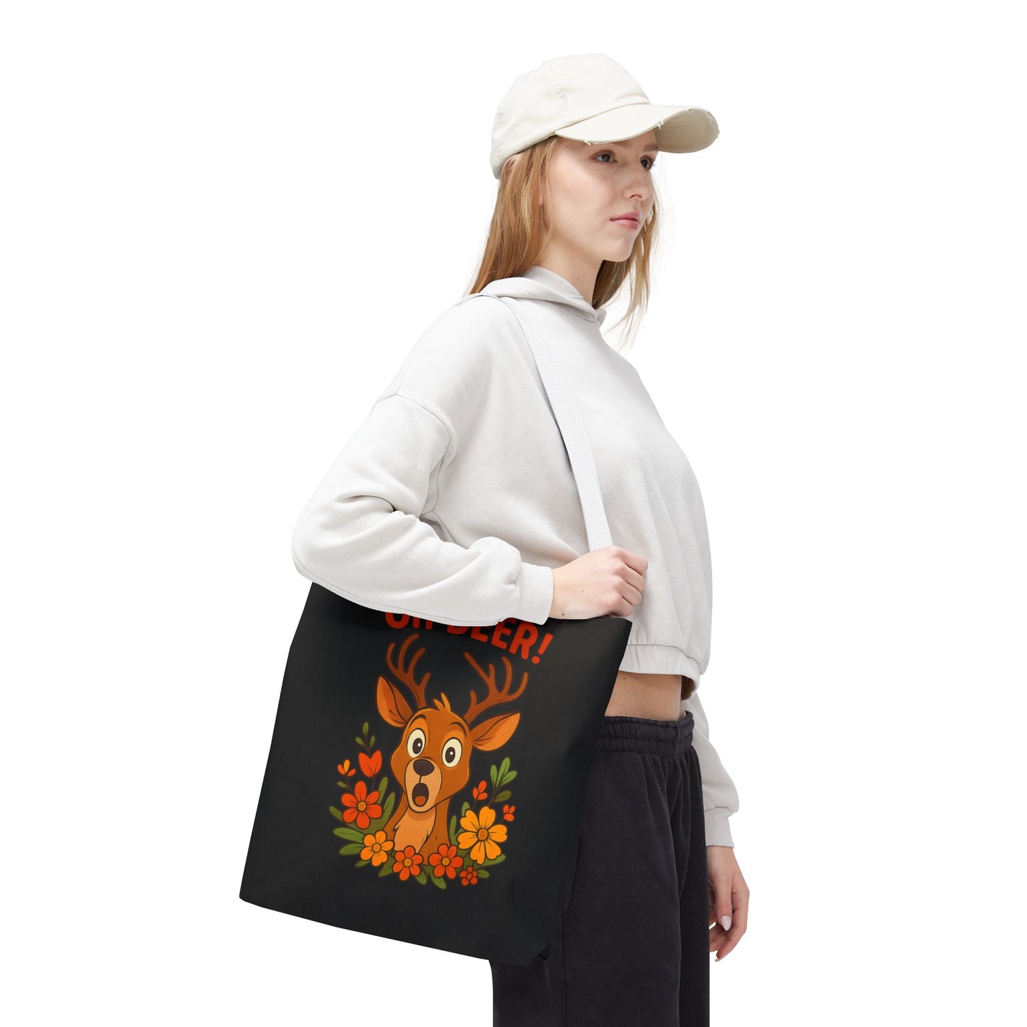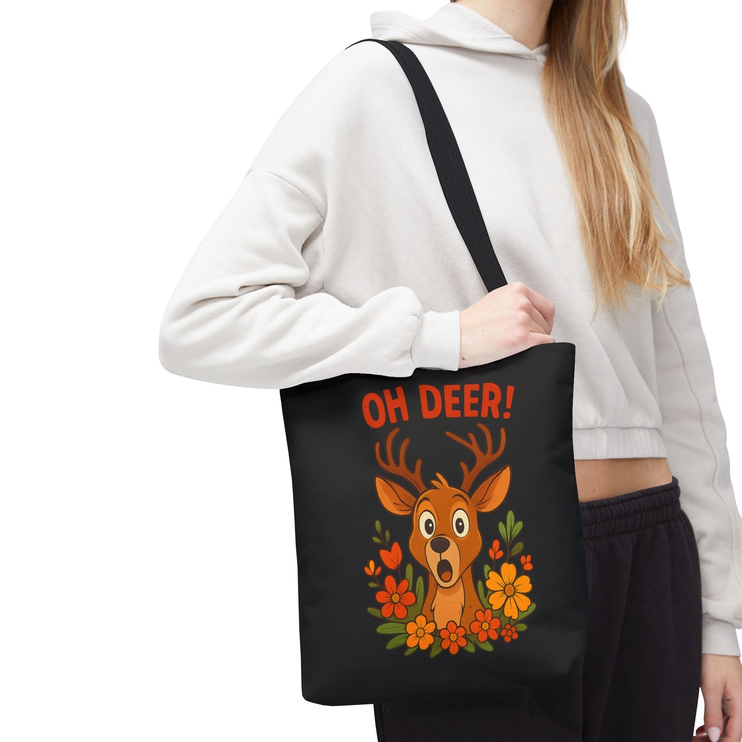 A fun tote bag with a startled Deer on it that states "Oh Deer". Perfect for nature lovers, animal enthusiasts, and those with a sense of humor. This tote bag adds a touch of whimsy to everyday life and is ideal for carrying around books, groceries, or daily essentials. Great for gifting during the holiday season, birthdays, or as a stocking stuffer.