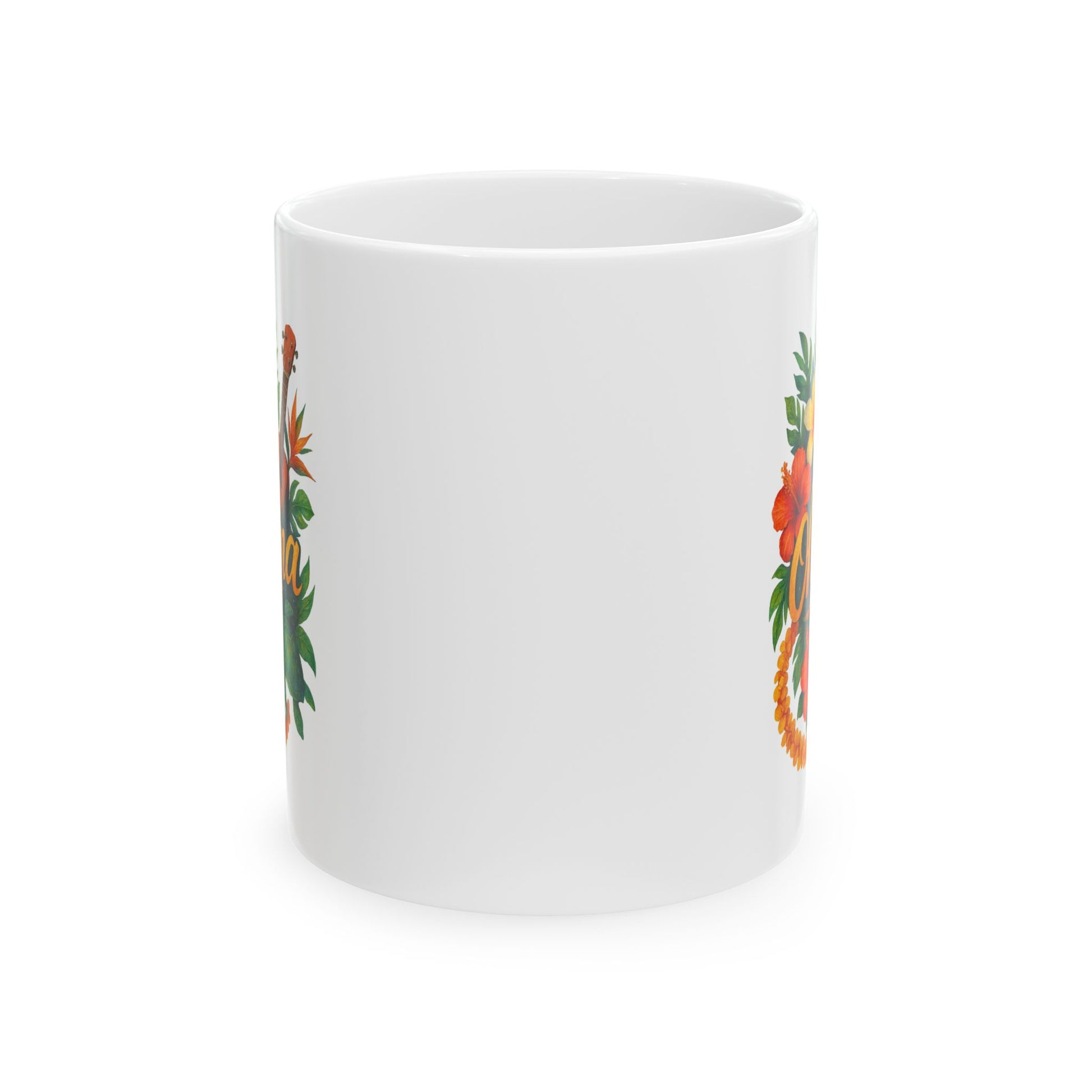 This tropical-themed ceramic mug is bursting with lush Hawaiian beauty, featuring bold hibiscus flowers, rich green leaves, a classic ukulele, and the word "Ohana" front and center. It's perfect for sipping your morning coffee, gifting to loved ones, or adding an island accent to your kitchen.