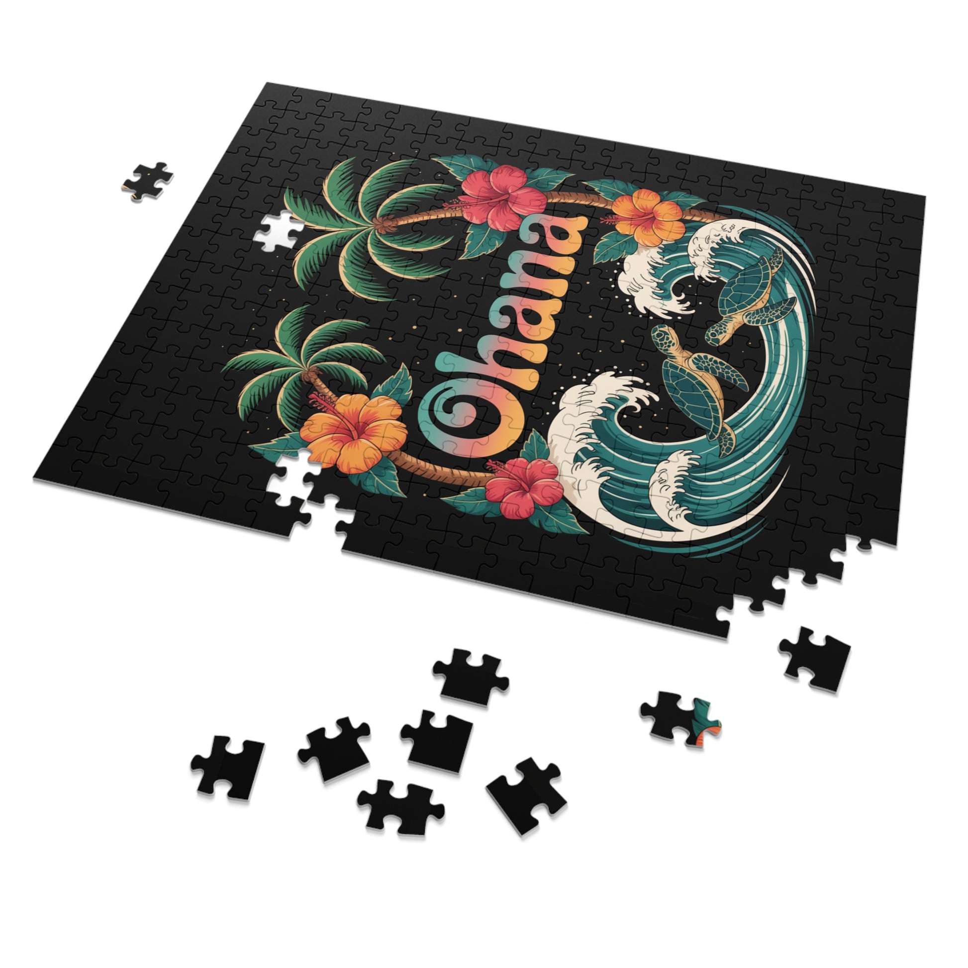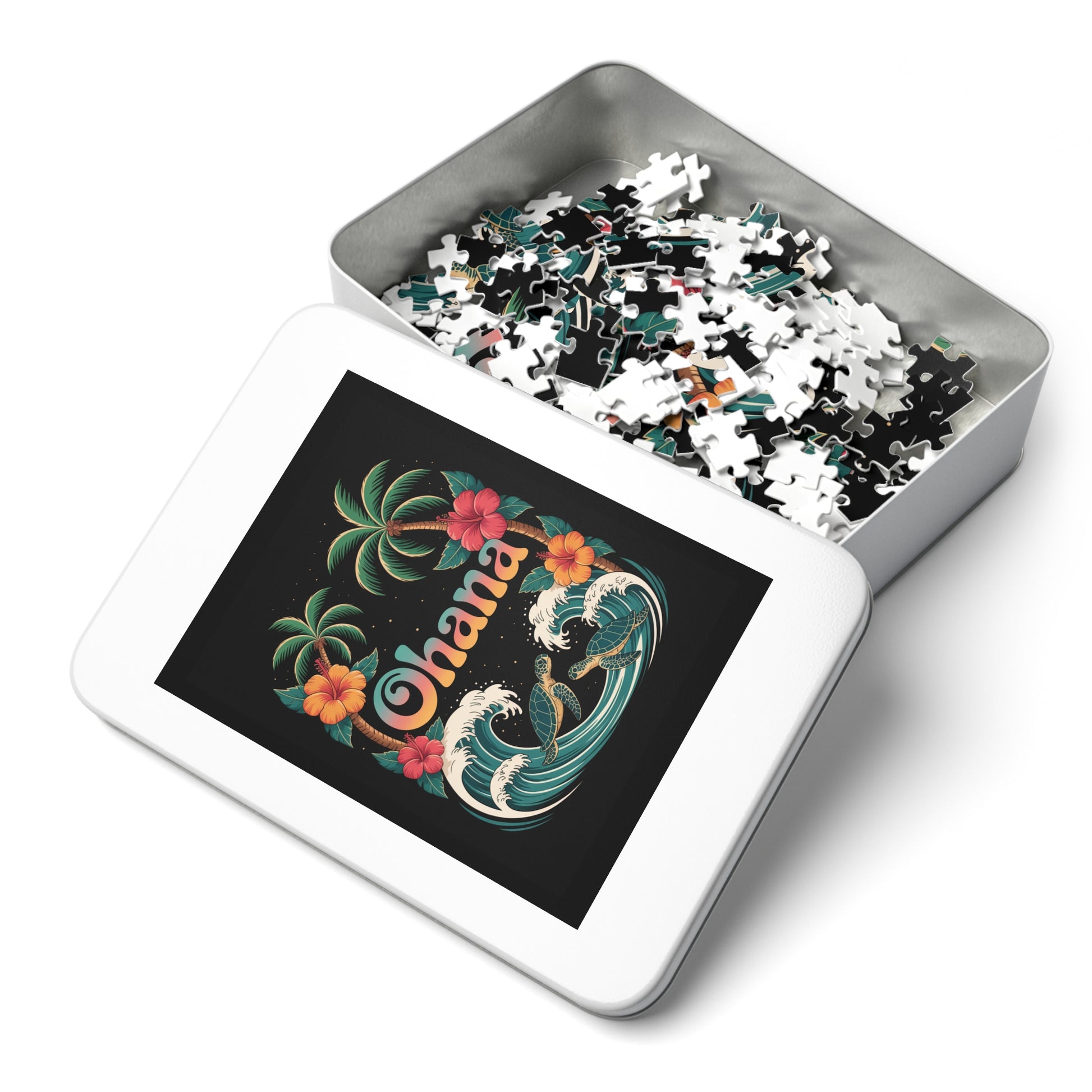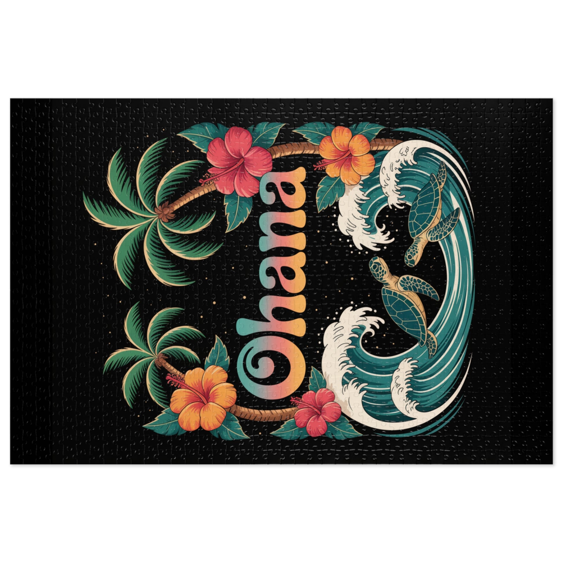 Embrace island vibes and meaningful connection with this Ohana Jigsaw Puzzle! Featuring a vibrant retro design with palm trees, hibiscus flowers, sea turtles, and crashing ocean waves, this puzzle brings the warmth of Hawaii to your tabletop.
