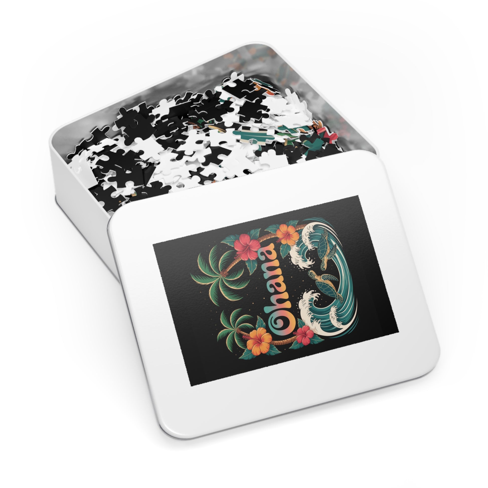 Ohana Jigsaw Puzzle - Retro Hawaiian Sea Turtle & Palm Tree Puzzle for Family Fun, Gift, or Decor - Tropical Beach Aesthetic Puzzle