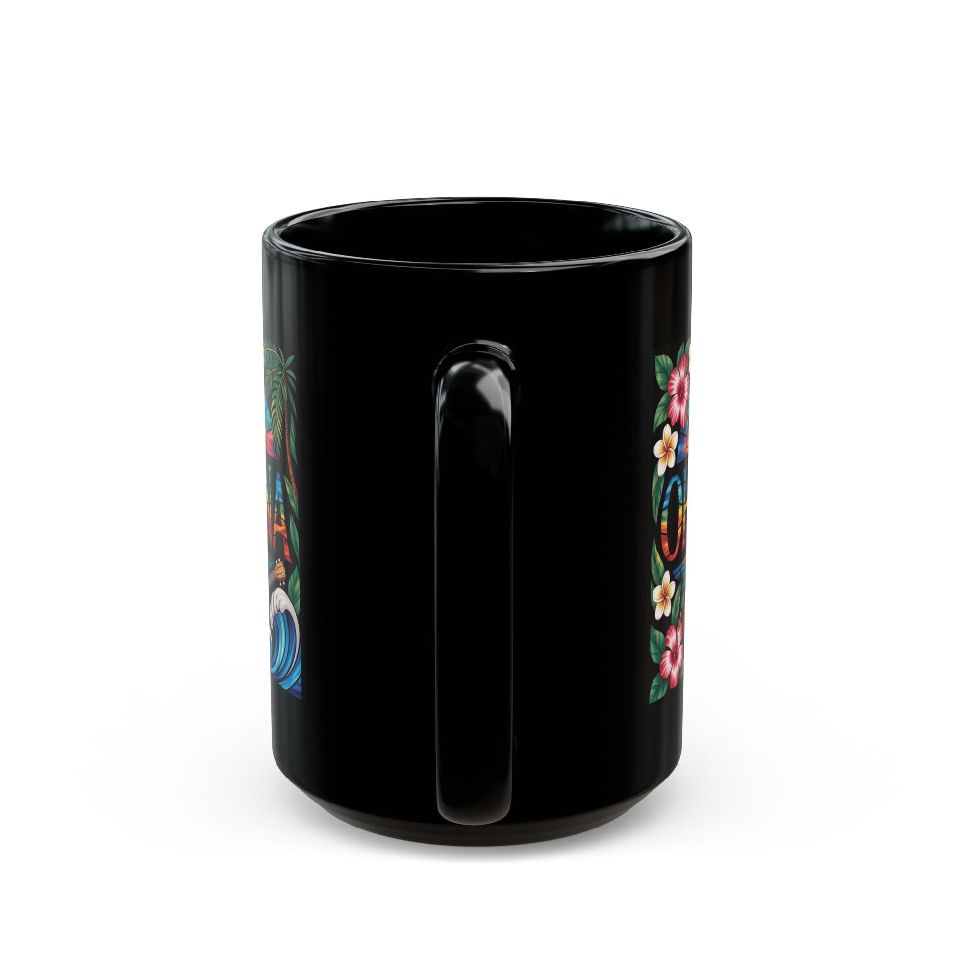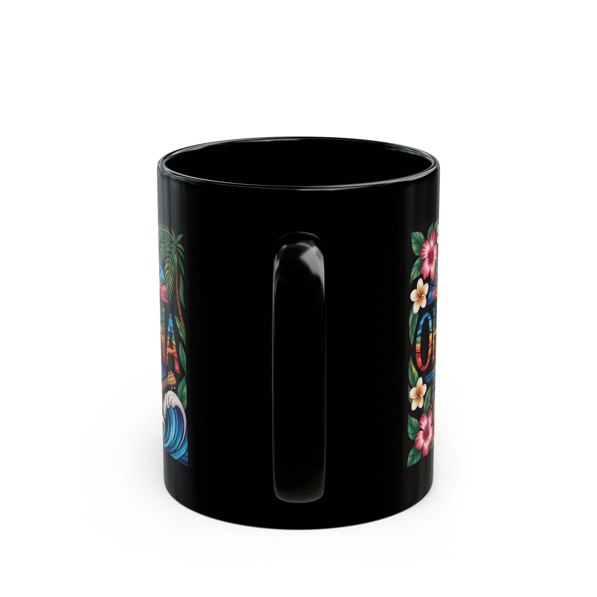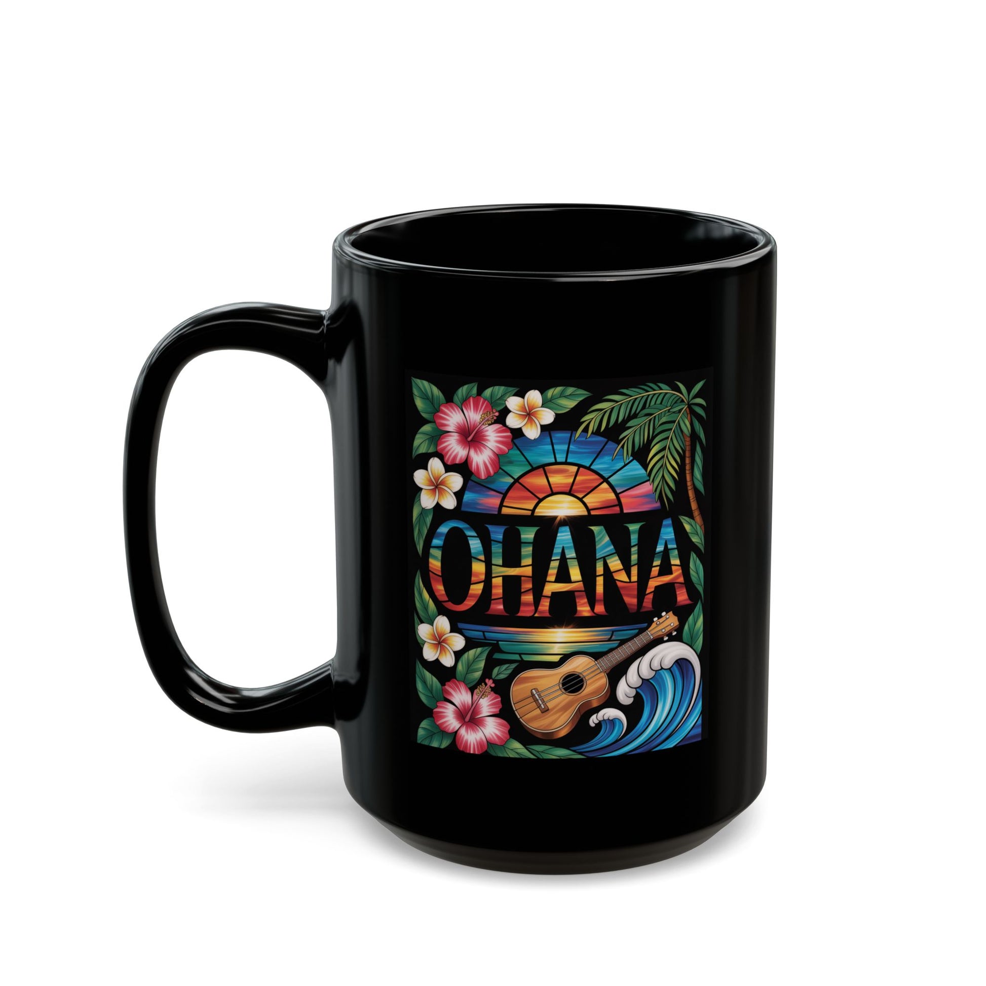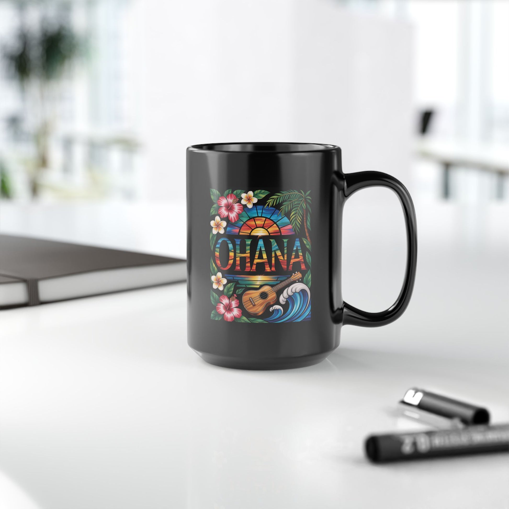 Bring the spirit of aloha to your morning routine with our vibrant Ohana Mug, featuring a bold tropical design inspired by the beauty of the Hawaiian islands. This black ceramic coffee cup showcases a sunset backdrop, lush palm trees, colorful hibiscus flowers, a ukulele, and a wave crashing on the shore—all surrounding the word "OHANA", which means family in Hawaiian culture.
