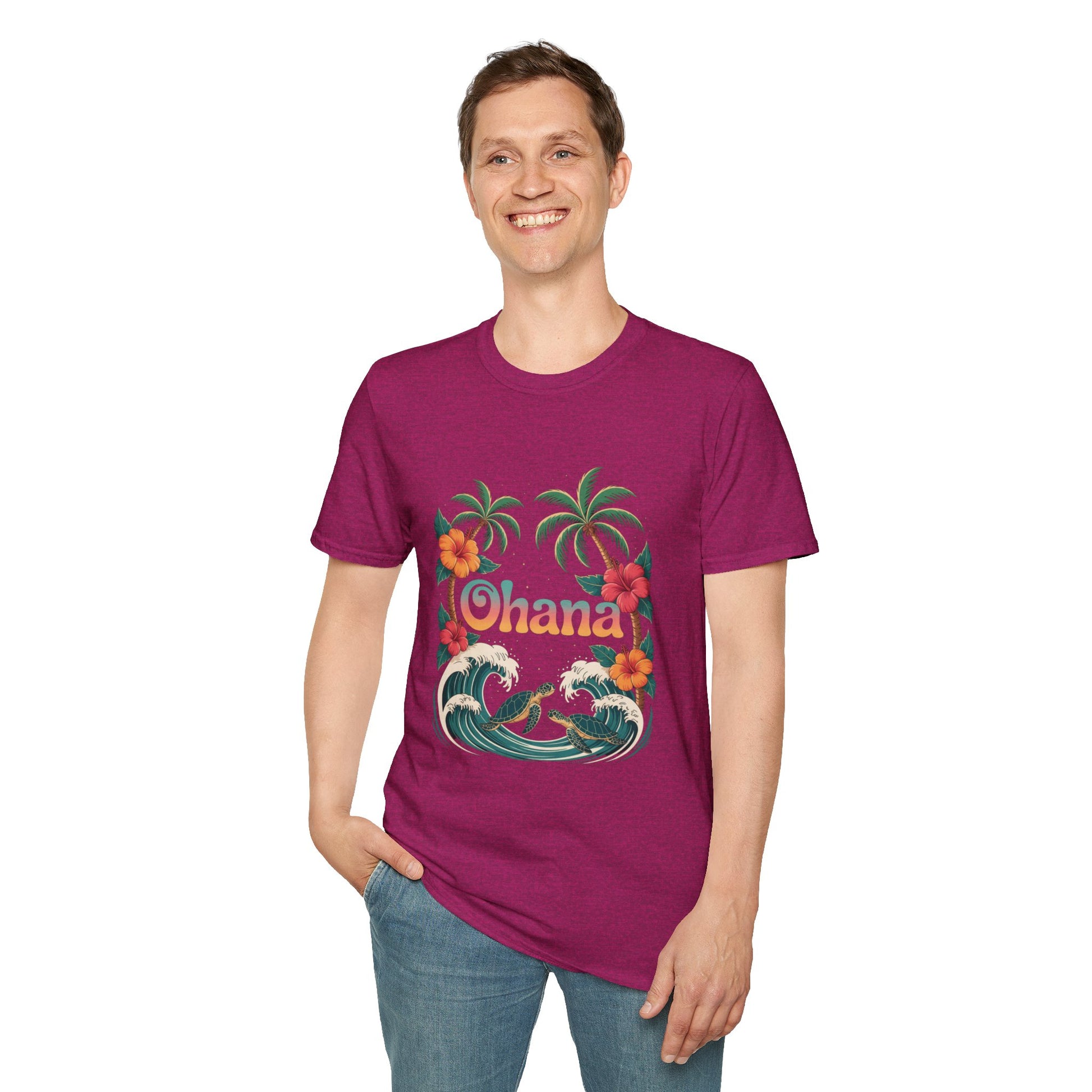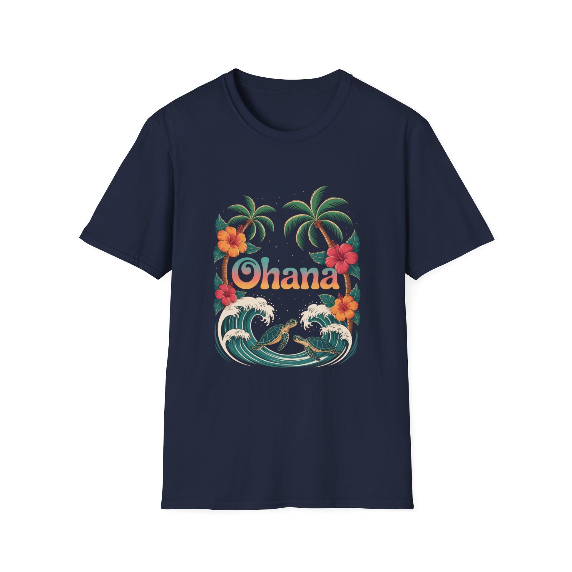 Designed for comfort and bold island flair, this t-shirt is perfect for anyone who loves retro vibes, ocean life, and the heartwarming meaning of ohana—because ohana means family, and family is everything.