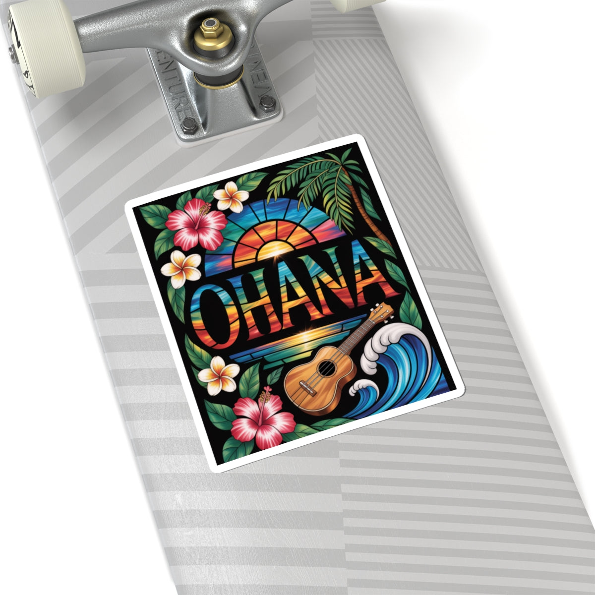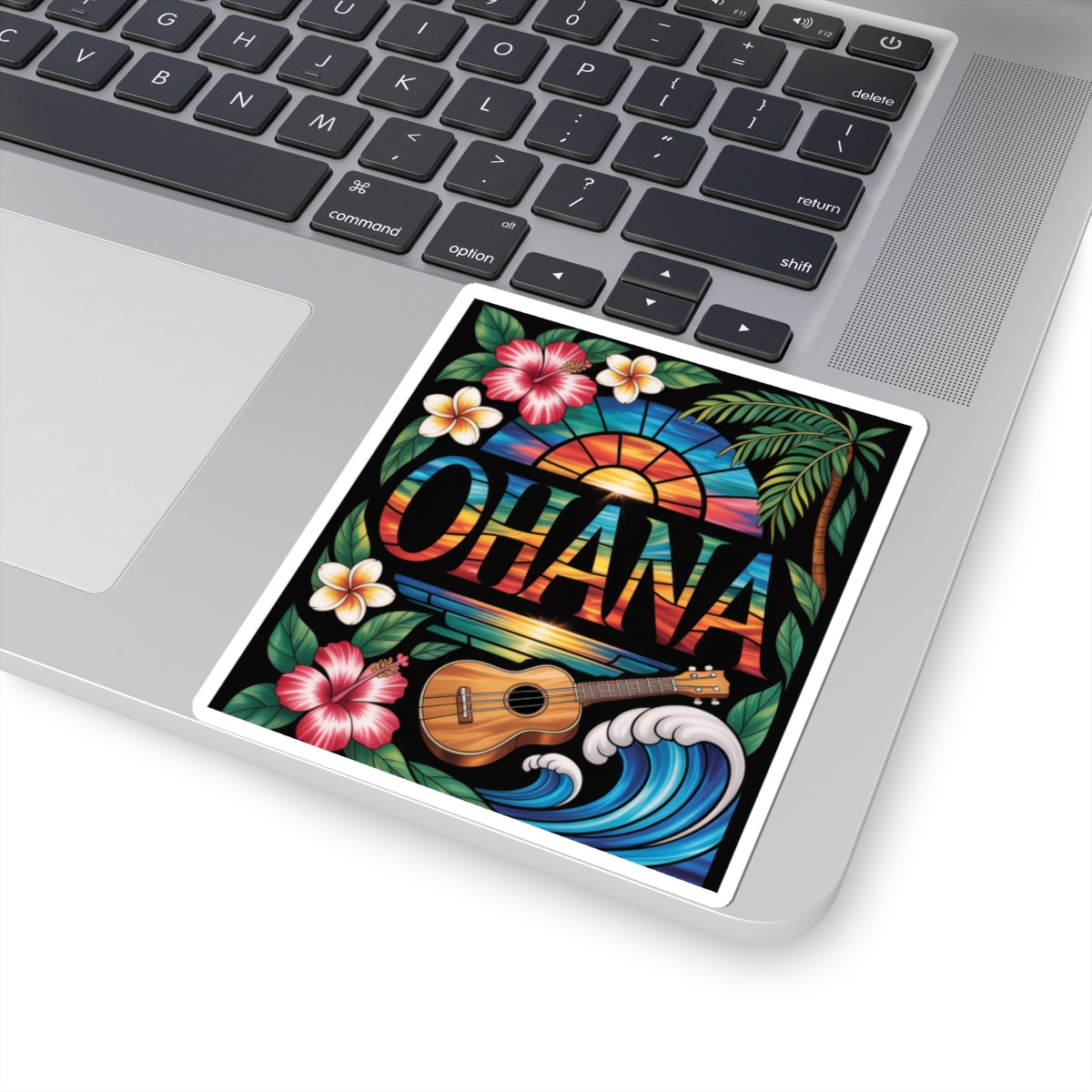 Ohana Sticker - Hawaiian Aesthetic Decal, Tropical Sunset, Ukulele, Hibiscus Flowers, Aloha Vibes