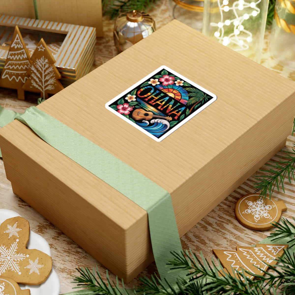 Celebrate island vibes and family love with this Ohana Sticker, inspired by the colorful charm of the Hawaiian islands. This vibrant vinyl decal features a sunset, palm trees, tropical flowers, waves, and a ukulele surrounding the word “OHANA”—a Hawaiian term for family and connection.