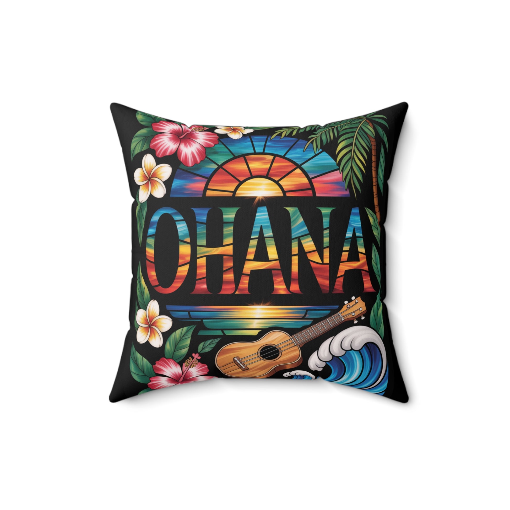 Ohana Throw Pillow – Hawaiian Sunset Cushion with Ukulele & Tropical Flowers, Aloha Decor, Beach House Accent, Family Gift, Island Living