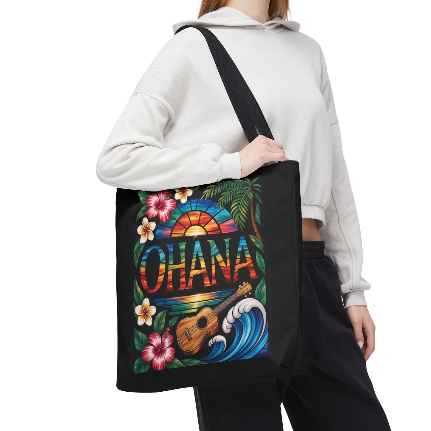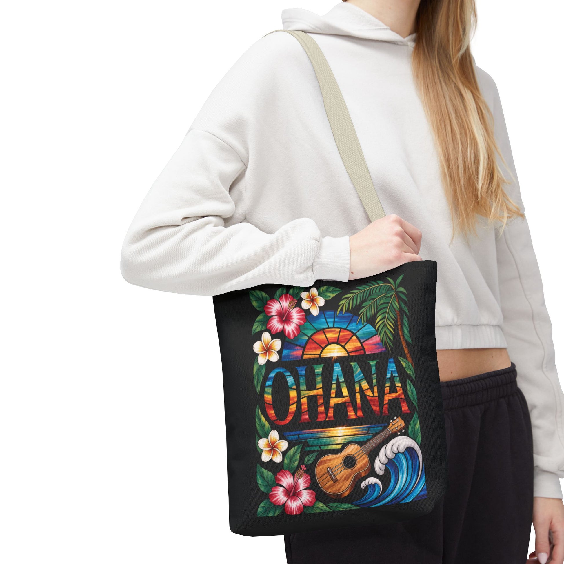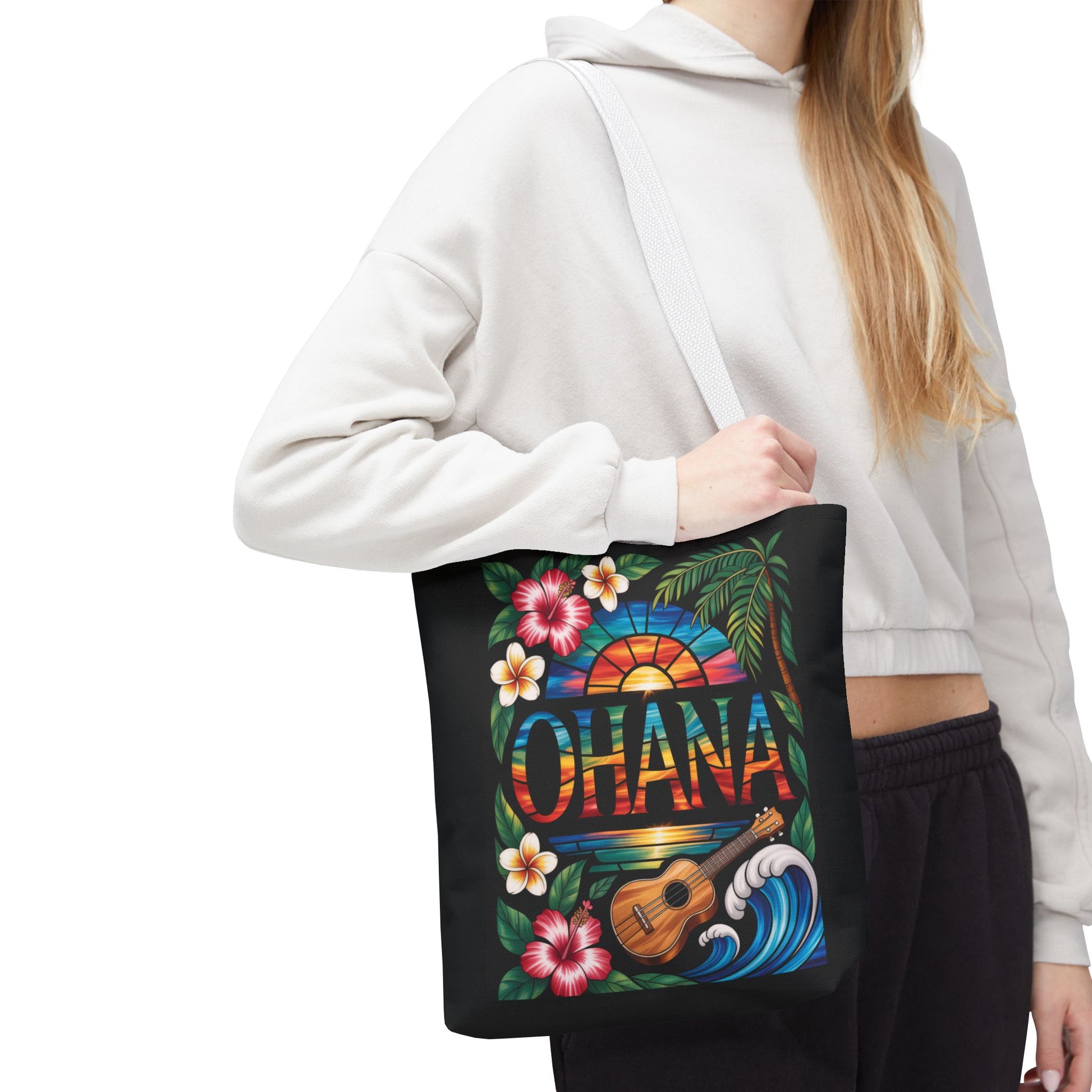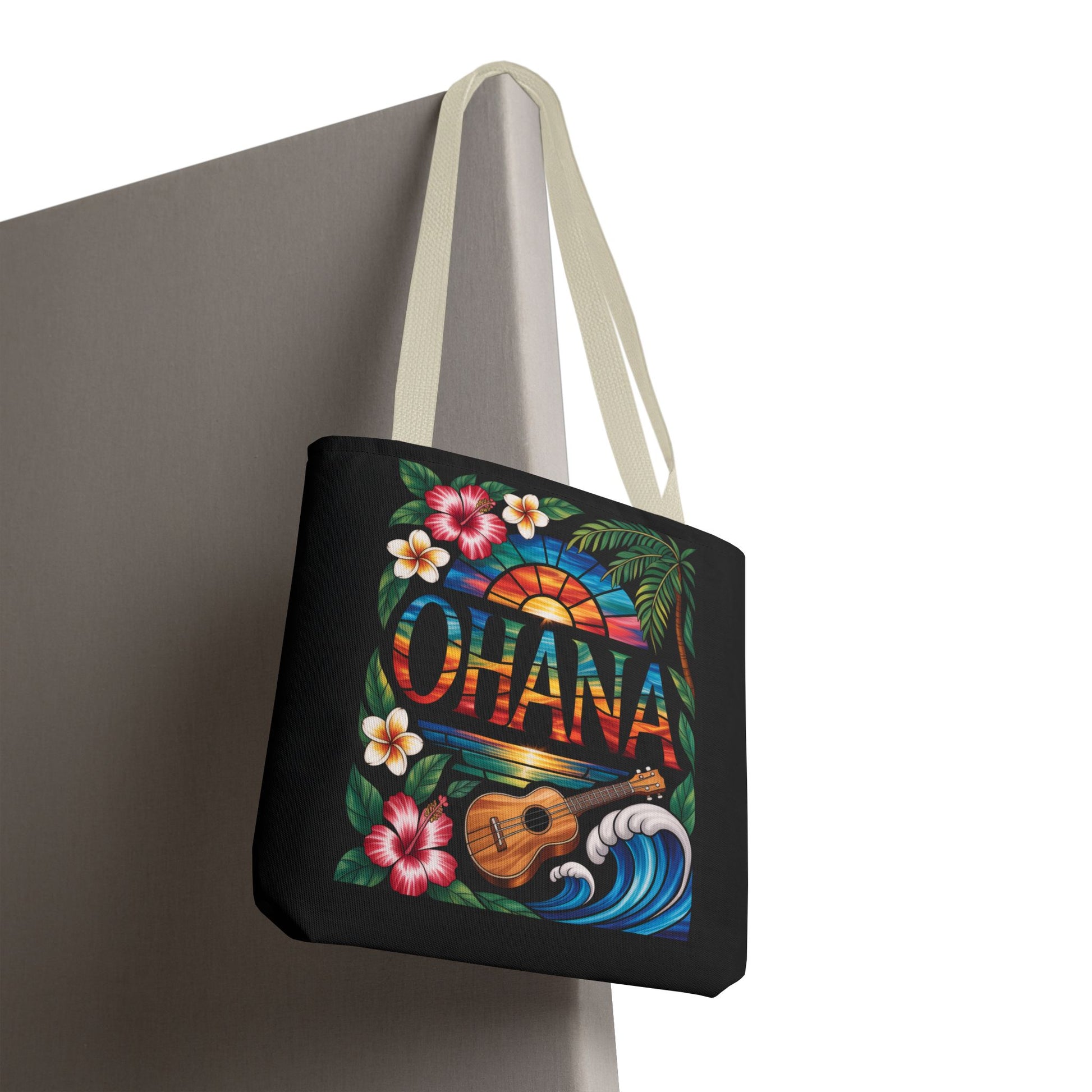 Ohana Tote Bag – Hawaiian Tropical Beach Bag with Ukulele, Sunset & Hibiscus Flowers, Island Gift for Women, Aloha Family Vibes