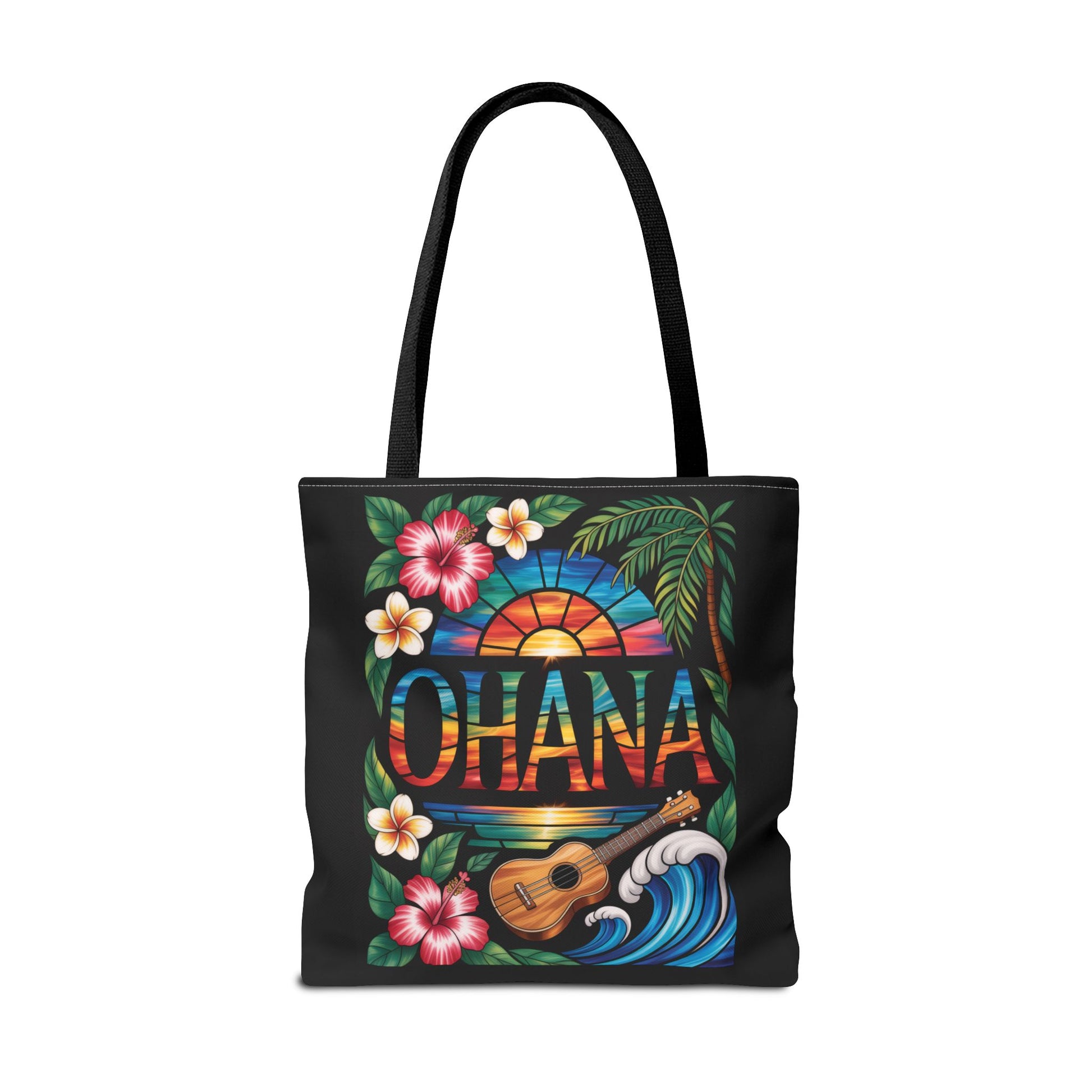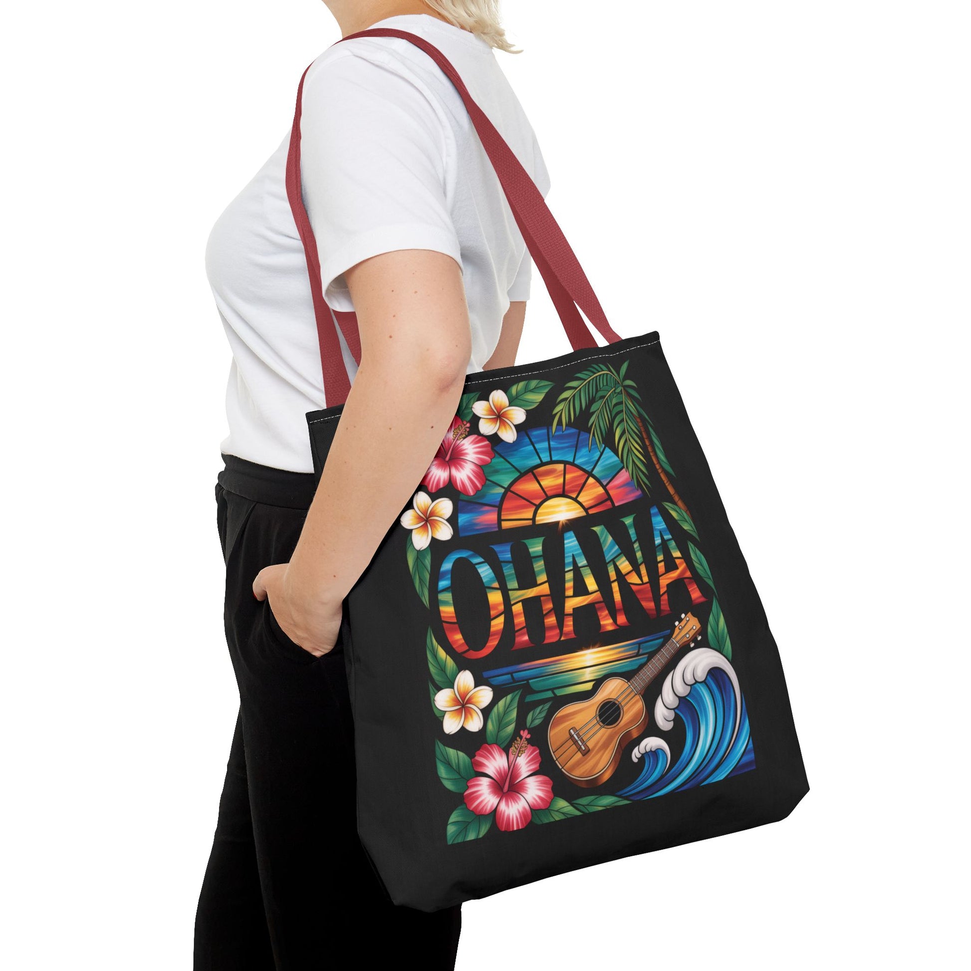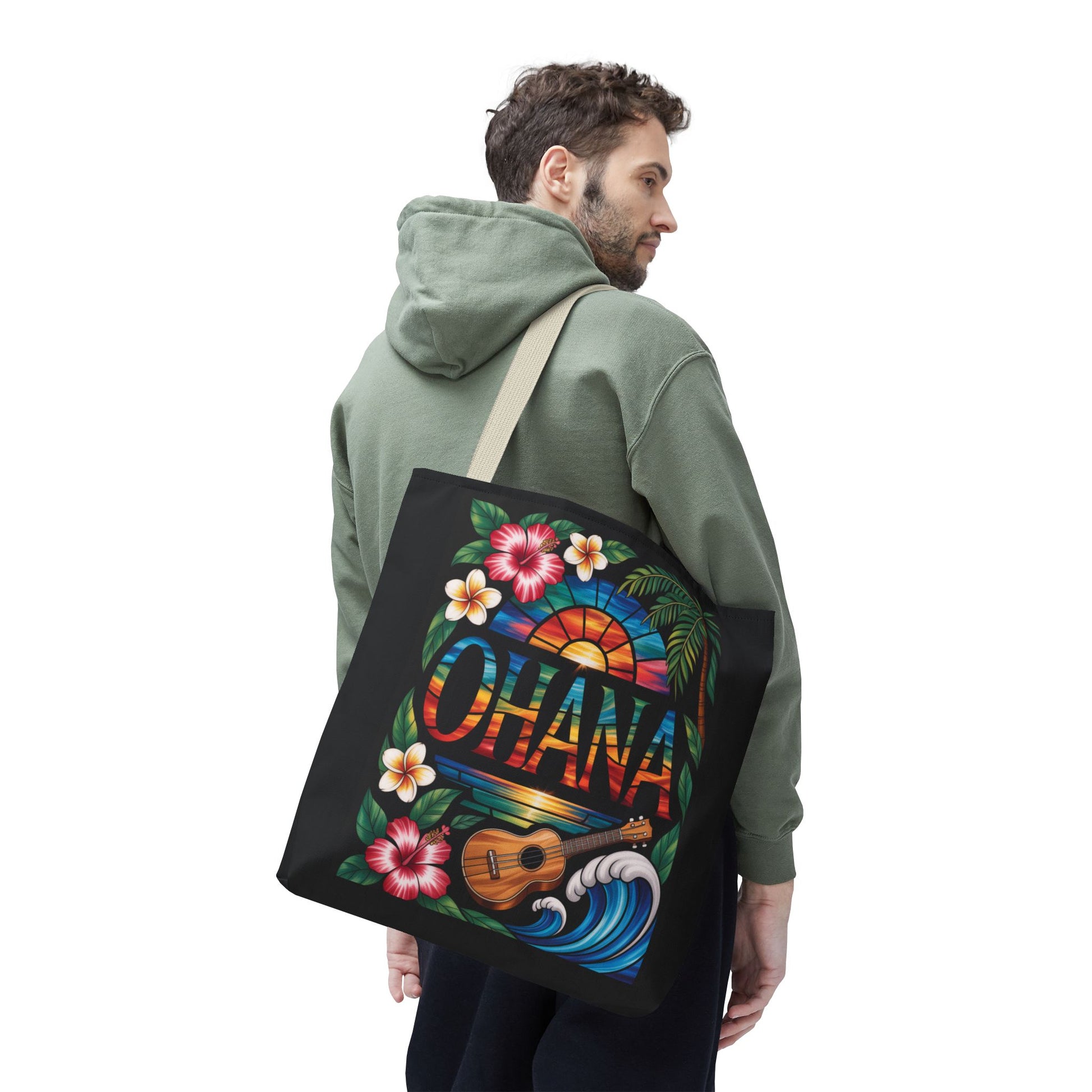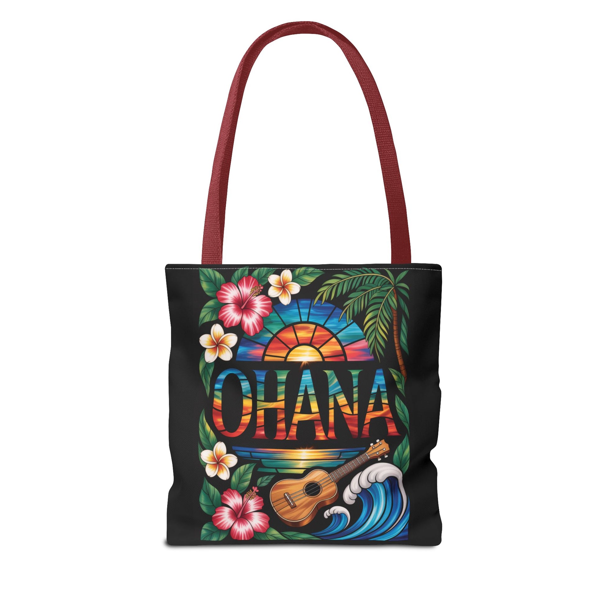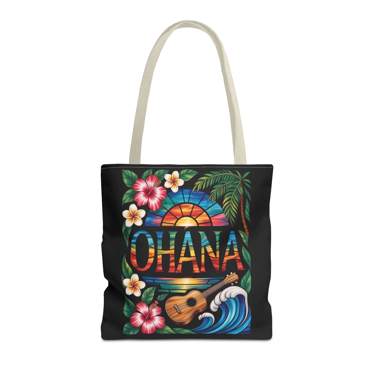 Ohana Tote Bag – Hawaiian Tropical Beach Bag with Ukulele, Sunset & Hibiscus Flowers, Island Gift for Women, Aloha Family Vibes