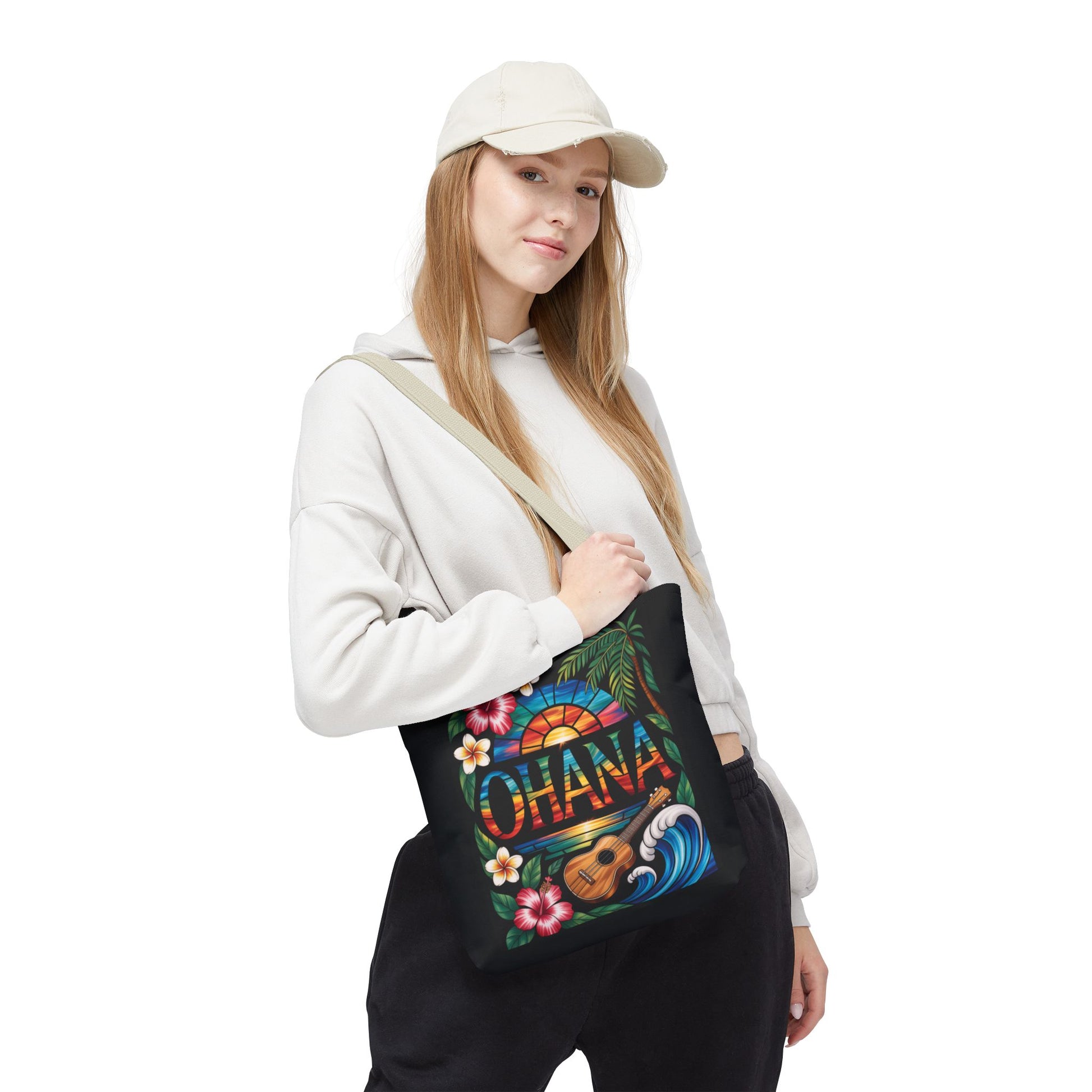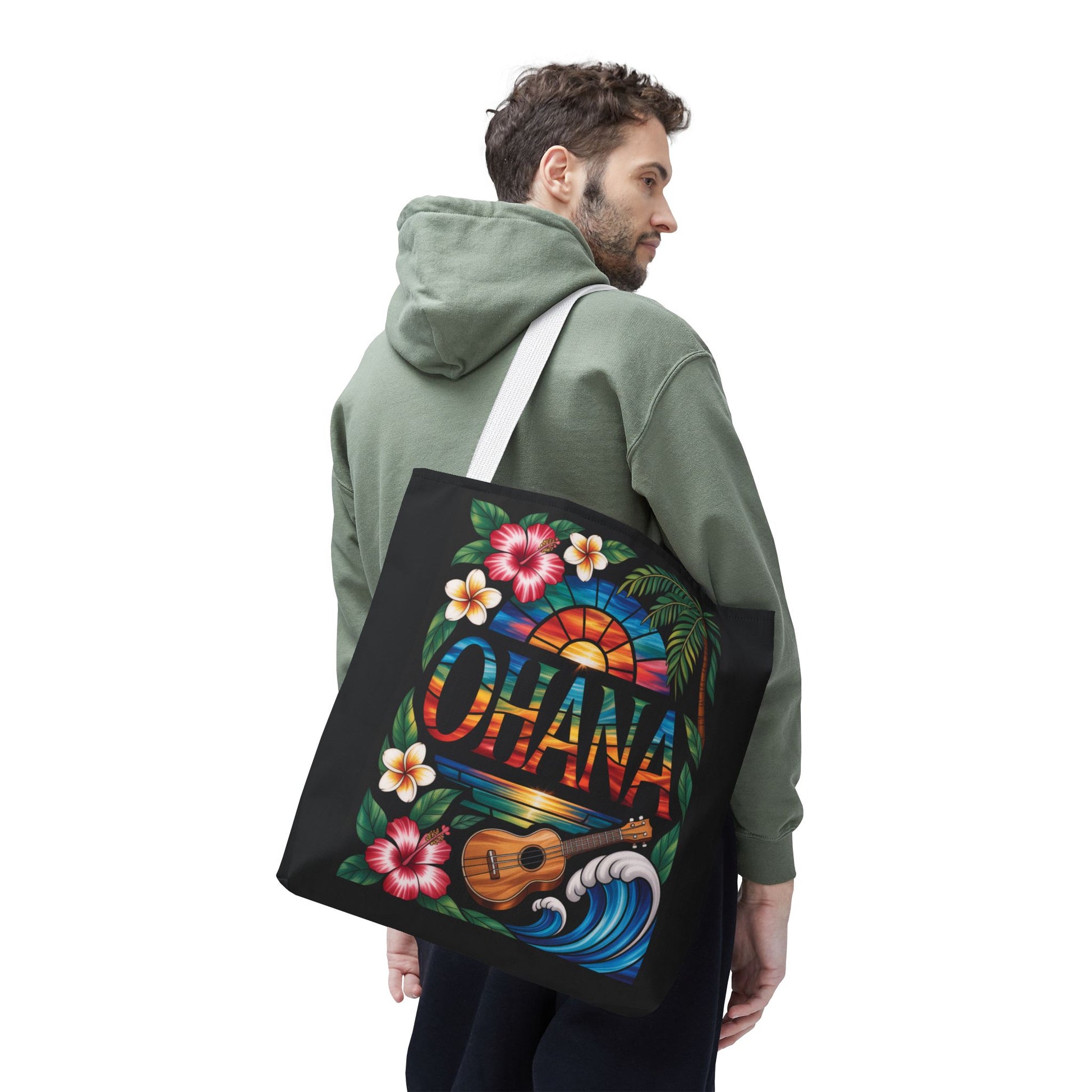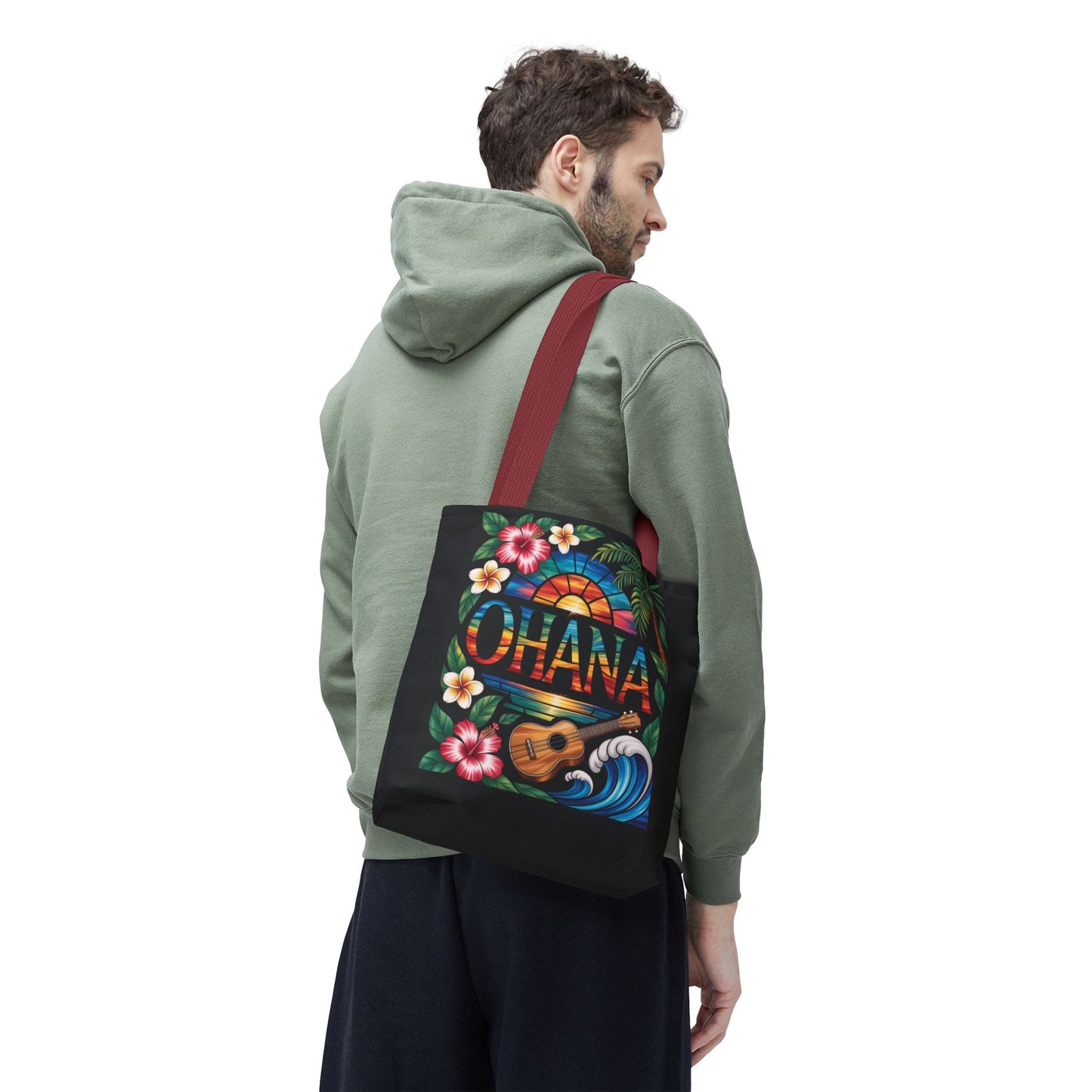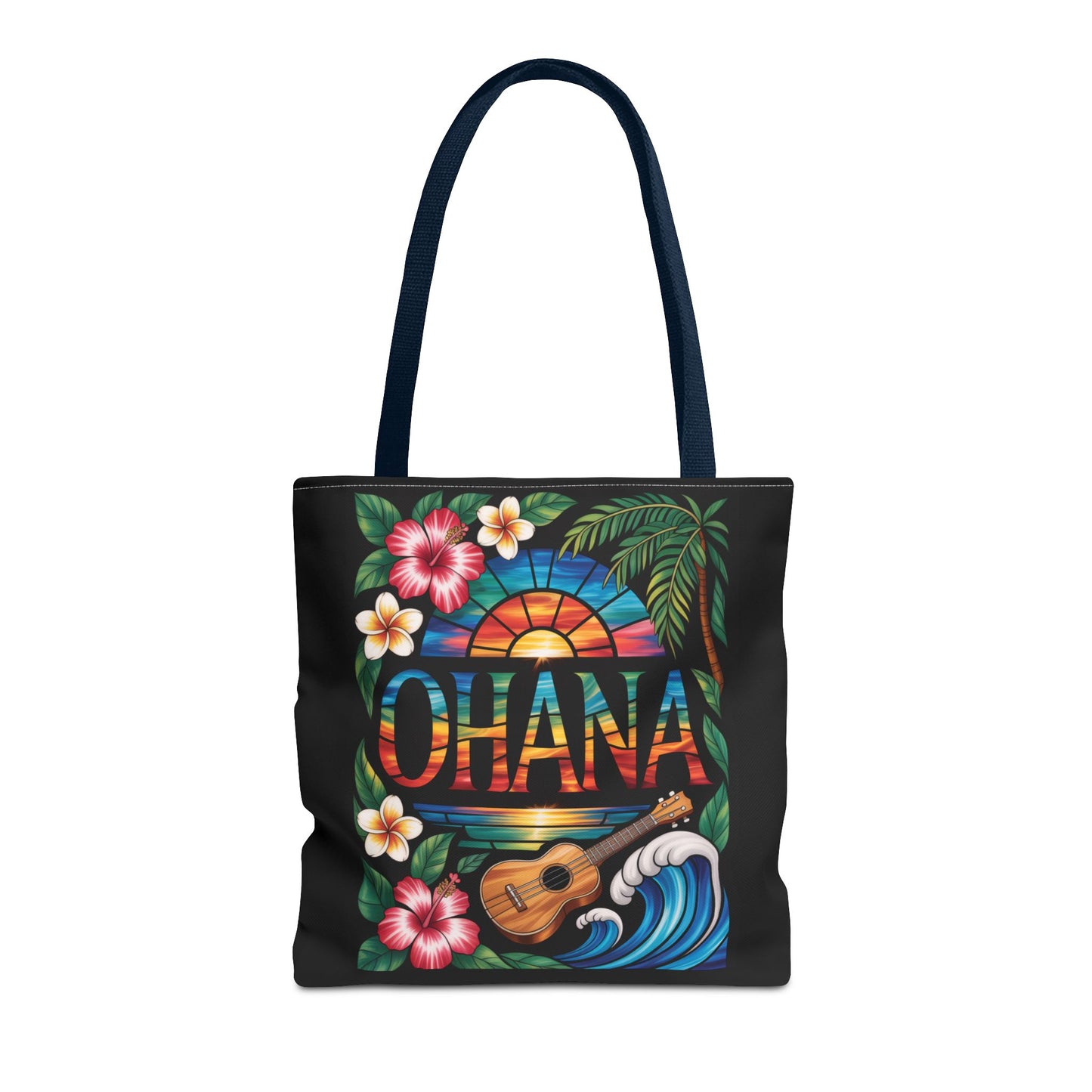 Ohana Tote Bag – Hawaiian Tropical Beach Bag with Ukulele, Sunset & Hibiscus Flowers, Island Gift for Women, Aloha Family Vibes