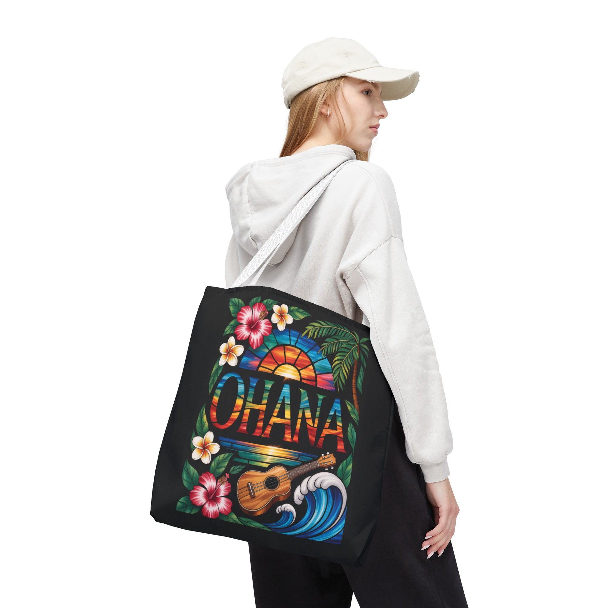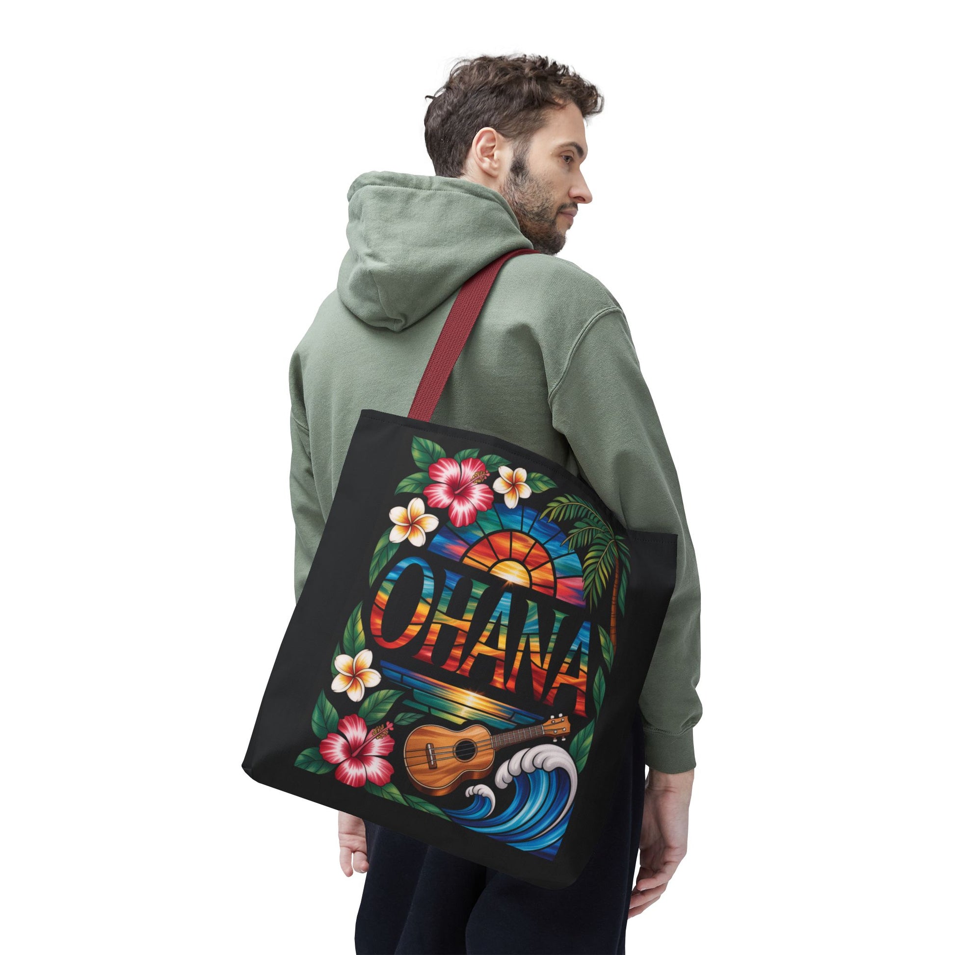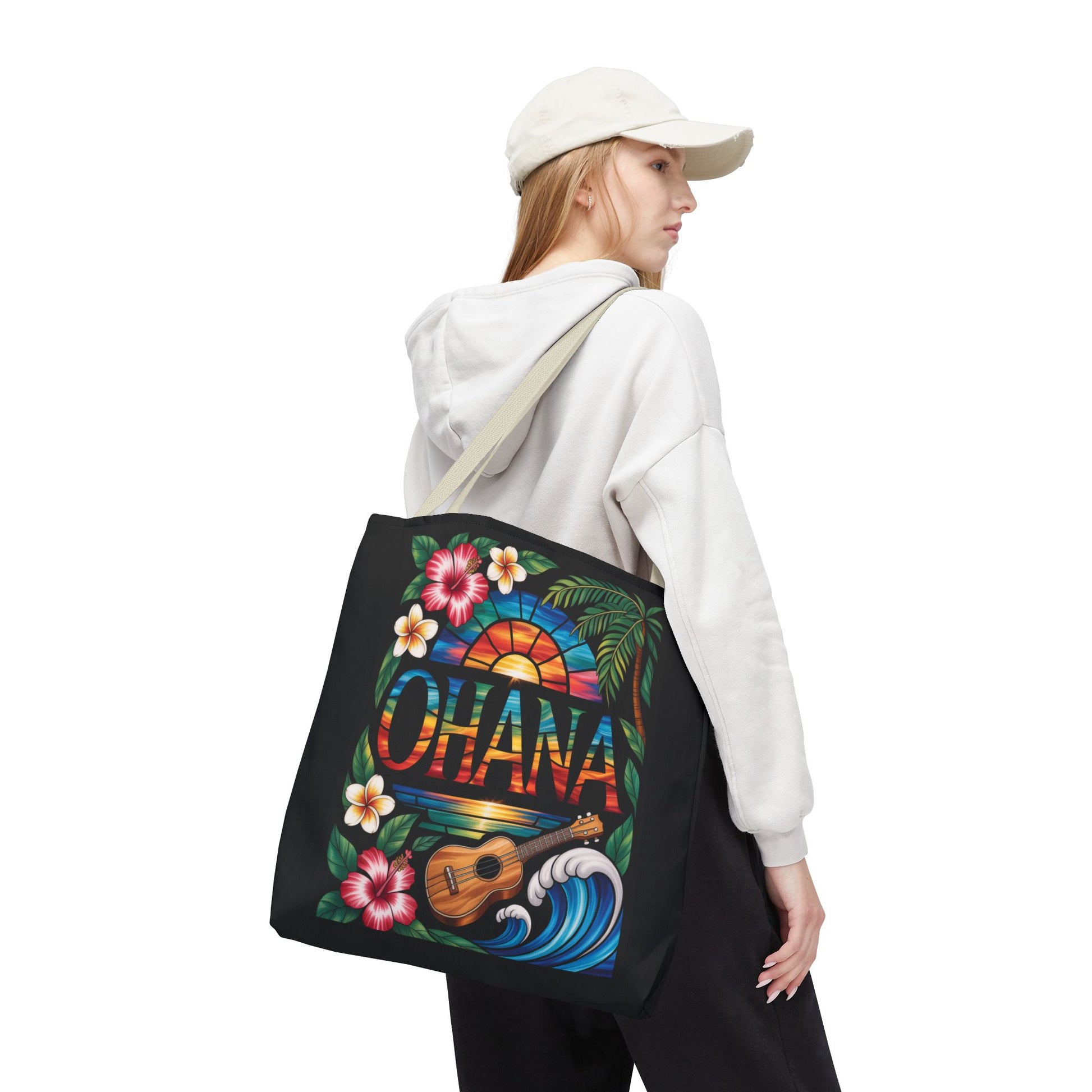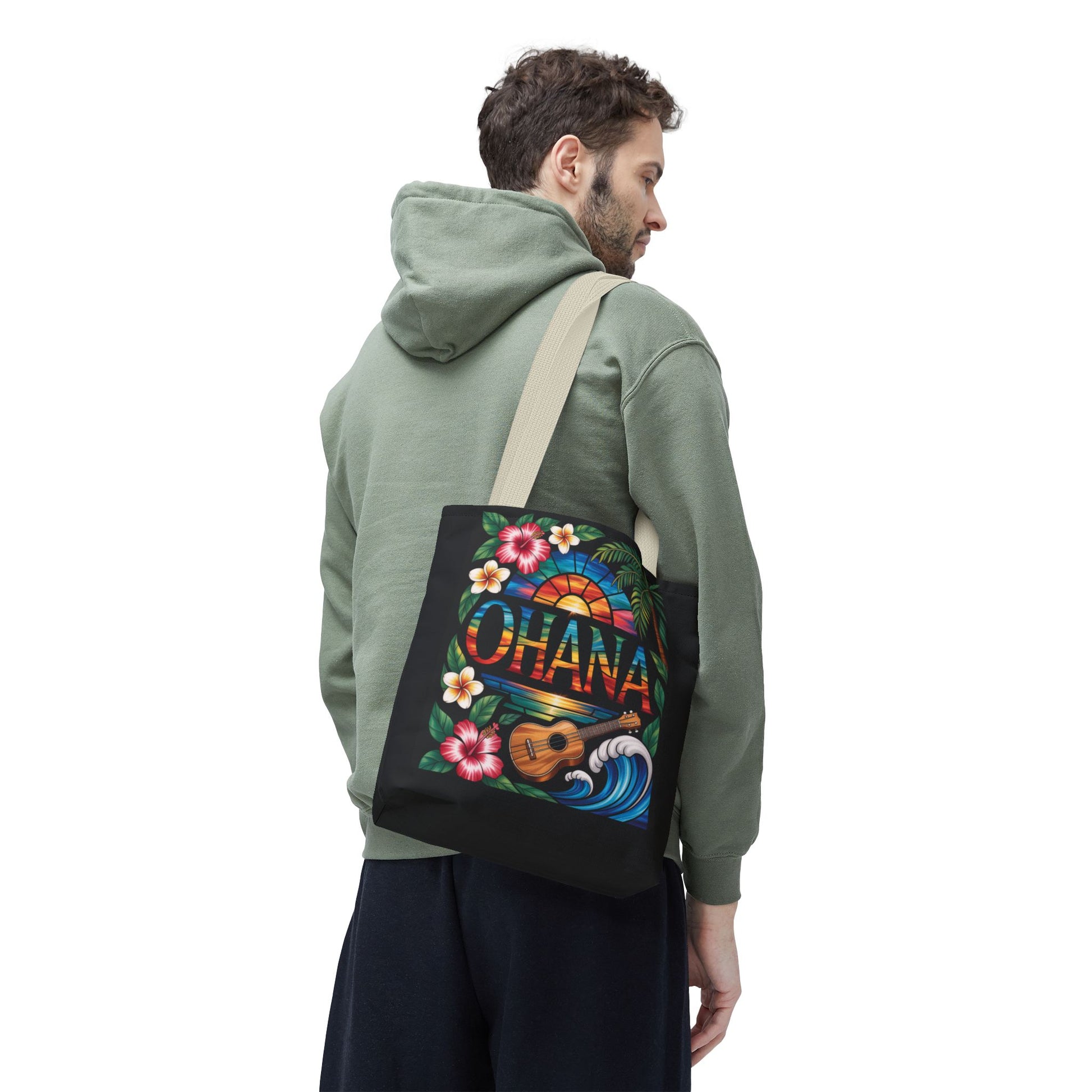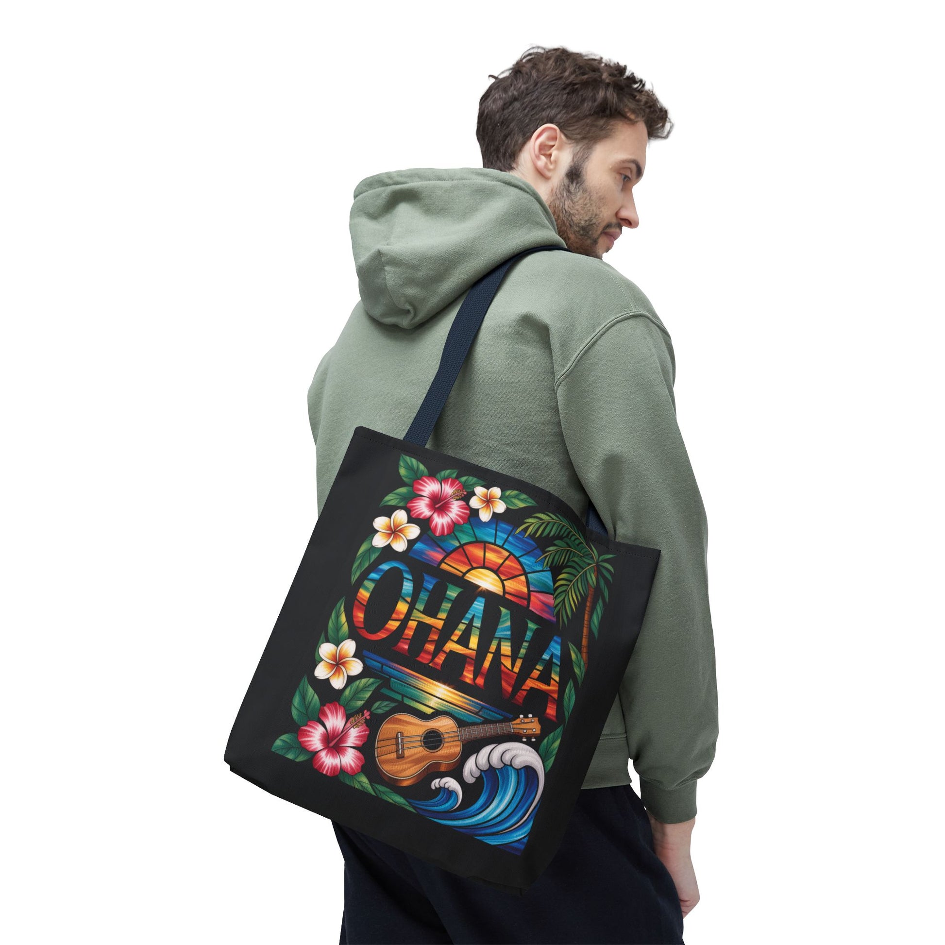 Ohana Tote Bag – Hawaiian Tropical Beach Bag with Ukulele, Sunset & Hibiscus Flowers, Island Gift for Women, Aloha Family Vibes